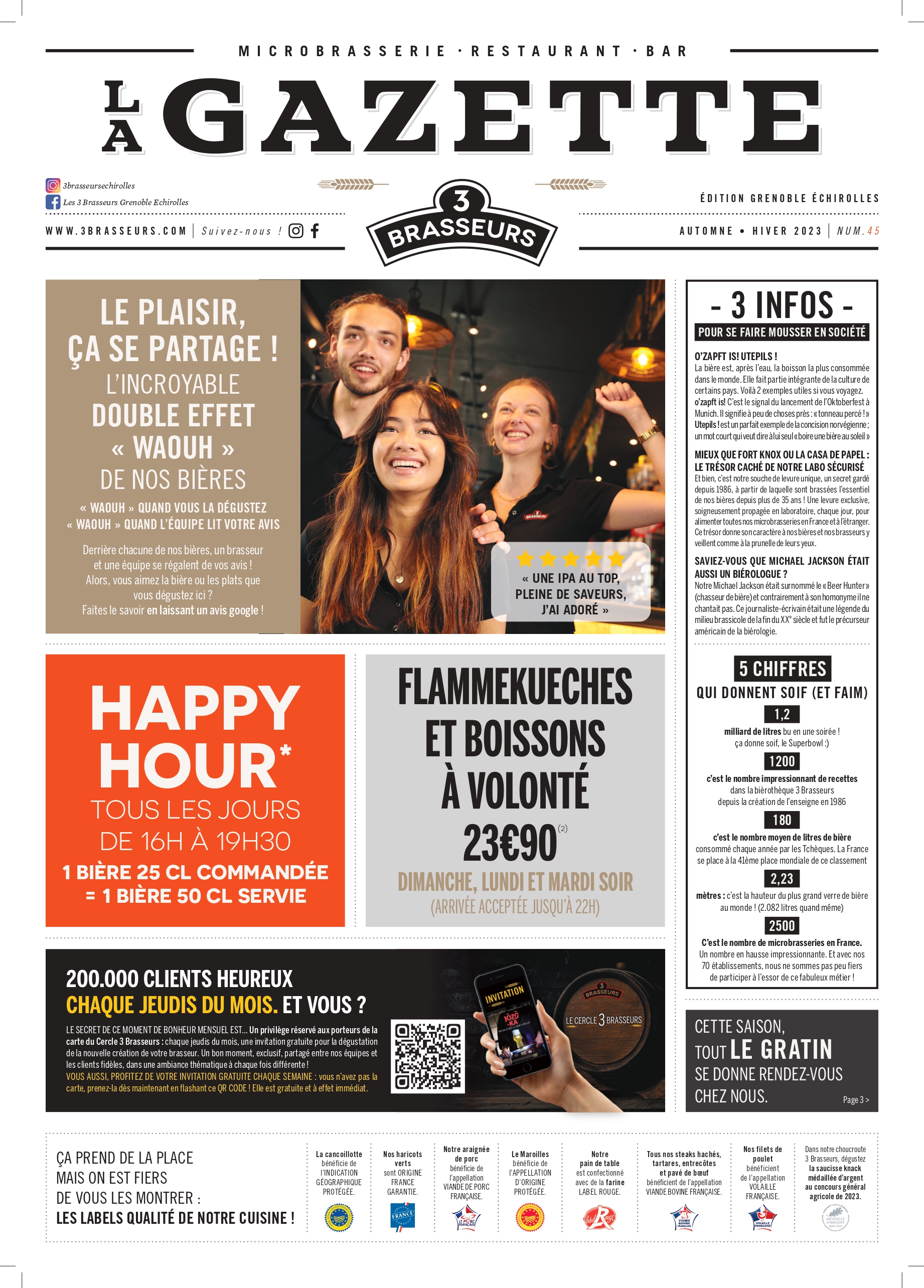 Nous vous remercions pour votre commentaire, c'est un vrai plaisir de vous lire ! Nous vous remercions également pour notre maitre brasseur qui se réinvente sans cesse afin de vous proposer de nouvelles recettes (en plus de la blanche, blonde, ambrée et brune, plus traditionnelle). Ainsi 8 sortes de bières sont constamment à la pompe au bar, pour vous faire découvrir tout le panel des possibilités brassicole. Notre cuisine est issue des recettes généreuses du Nord de la France. Les plats emblématiques tels que le welsh, la poutine, ou nos choucroutes sont peut-être un peu caloriques, mais nous avons de nombreux plats et salades plus légers ainsi qu'un certains nombres de plats végétariens. Bref, il y en a pour tous les goûts. Nous vous remercions d'avoir souligné l'amabilité et la disponibilité de nos équipes que se donnent chaque jour à 100% pour toujours continuer à vous faire passer de bons moments. Nous espérons vous revoir très bientôt dans votre restaurant les 3 Brasseurs Échirolles.