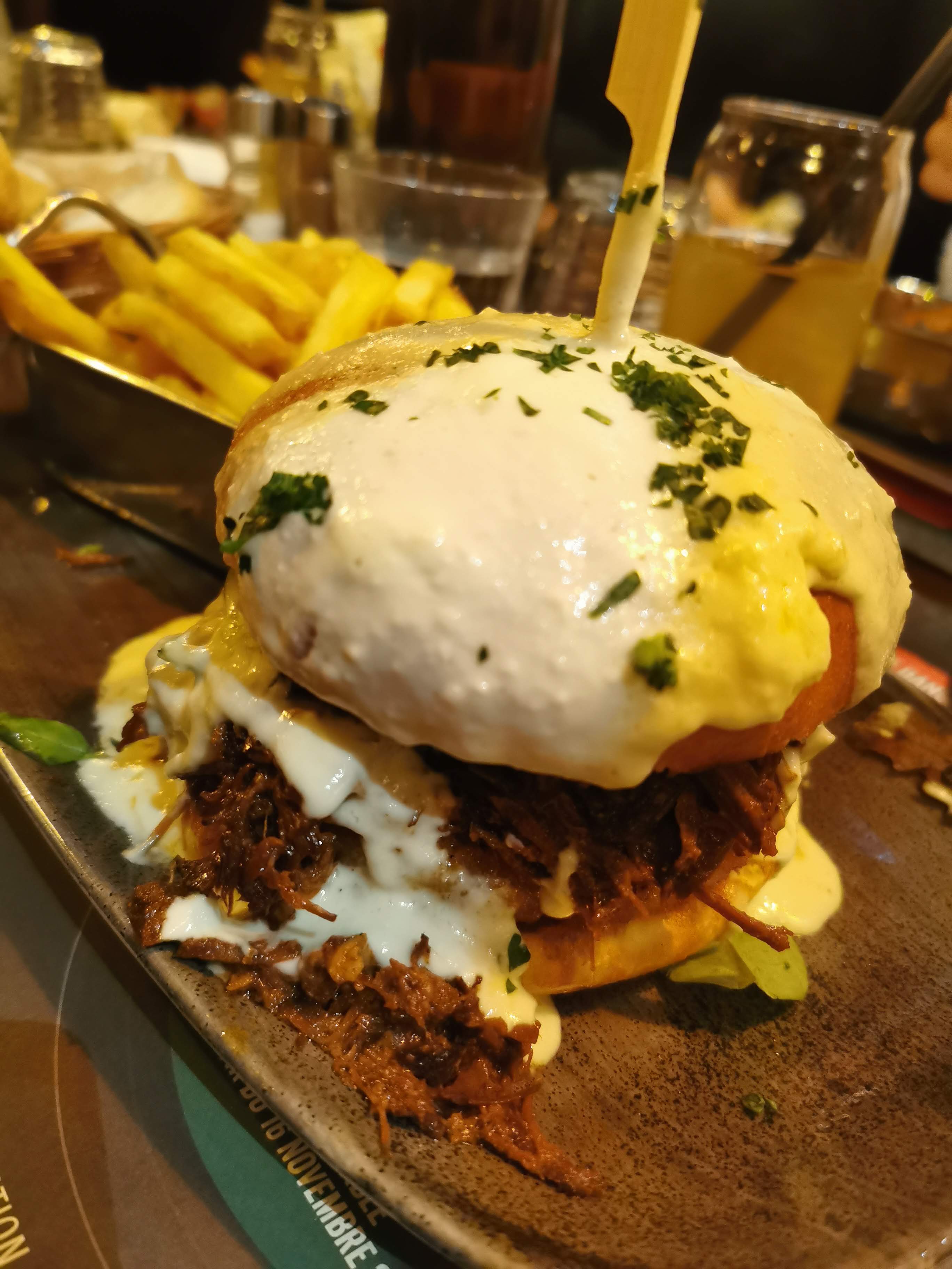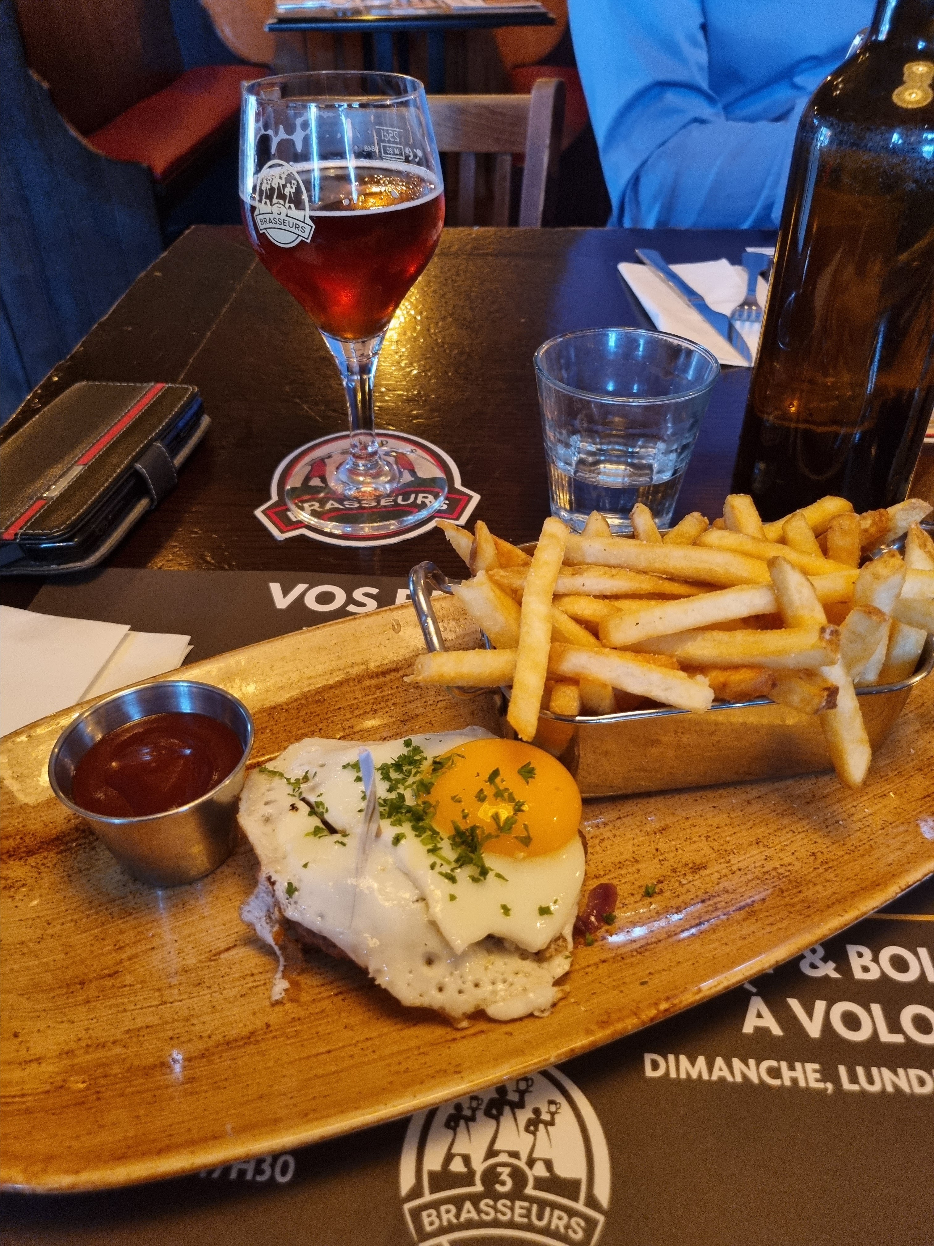 Nous sommes venu en mai, et nous avons laissé une mauvaise note ainsi qu'un avis négatif car rien ne s'était bien passé, qu'il s'agisse du service comme de la nourriture. Nous avons réitéré l'expérience hier soir, c'est pourquoi je modifie mon avis. Hier soir nous sommes arrivés à 21h15, le restaurant était plein mais le serveur nous a quand même trouvé une petite table de deux. Nous avons eu de l'eau dès notre arrivée, ce qui n'était pas le cas la fois précédente où on avait attendu plus de 40 minutes pour une simple carafe. Nous avons commandé des starters qui sont arrivés rapidement et bien chauds ! Ils étaient tellement bons et réconfortants. La sauce maroilles était délicieuse ! Les plats sont ensuite arrivés rapidement également, bien chauds (je le souligne car la dernière fois tout était froid..), les burgers étaient très bons. Le service était super, le serveur qui s'est occupé de nous nous a beaucoup fait rire, il était adorable (celui avec un accent italien je crois ? Je ne sais pas trop reconnaître.) Concernant les points négatifs, c'est très désagréable d'être sur les tables autour des fenêtres.. en effet on se prend le vent froid et assez violent de la climatisation dans le front. Déjà qu'il fait froid dehors mais j'ai passé mon repas à trembler.. Ensuite, les frites sont vraiment affreuses, ça ça n'a pas changé : pas assez cuites, farineuses et avec un goût de congélateur. Dans tous les cas je constate une grande amélioration globale du service et de la qualité des plats, alors ça fait très plaisir ! La prochaine fois nous reviendrons avec une réservation afin de pouvoir demander une table placée ailleurs :) Mais vraiment, félicitez votre serveur parce que c'est un grand rayon de soleil ☀️
