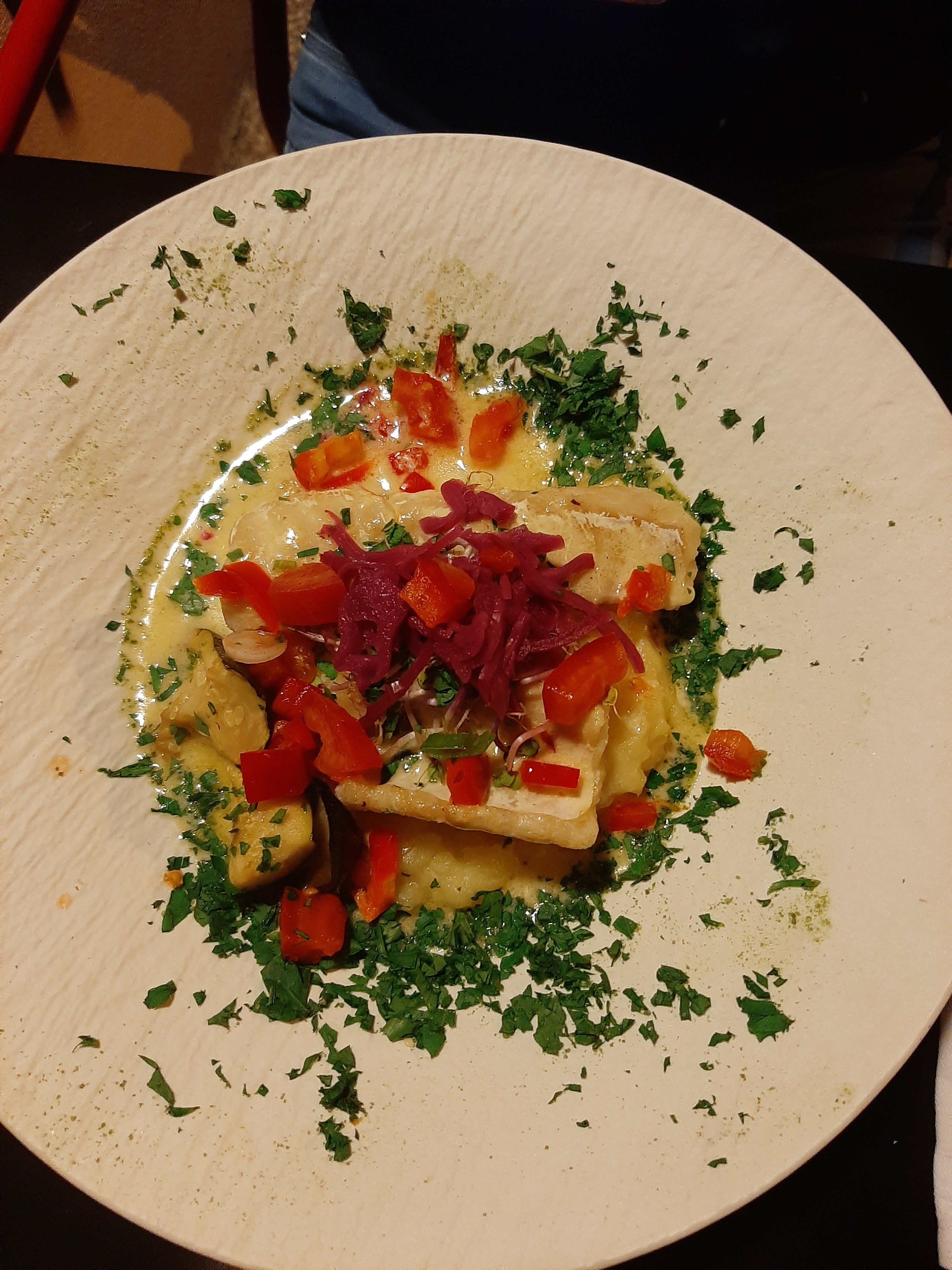 Un plat (lieu jaune aux agrumes) vraiment excellent en tout point: cuisson, sauce, accompagnement. Mes 2 amies ont également beaucoup apprécié leur poisson. Excellent vin également. Notre seule déception a été notre dessert, que nous avons trouvé bien en deçà du plat (sans relief contrairement au plat). Le service était parfait. Merci à l'équipe pour ce moment!