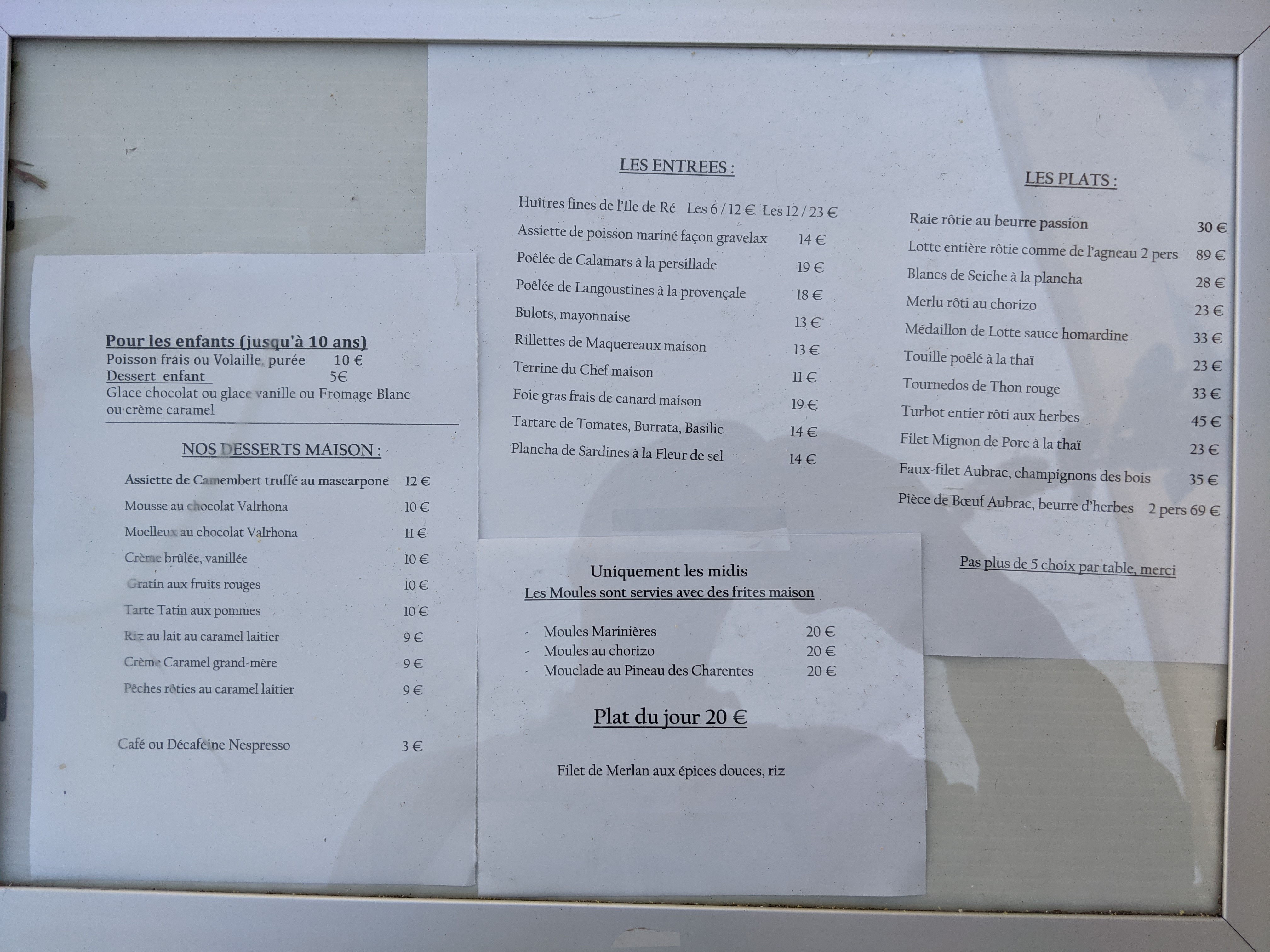 Nous cherchions un petit coin tranquille pour manger loin du brouhaha du port, et nous avons trouvé ce restaurant proposant une carte simple mais aussi un peu plus sophistiquée pour ceux qui souhaitent un peu plus que se manger un morceau ! Les moules et les sardines, accompagnées de leurs pommes de terre de Ré étaient préparées avec soin et subtilité. C'est un restaurant que nous recommandons.