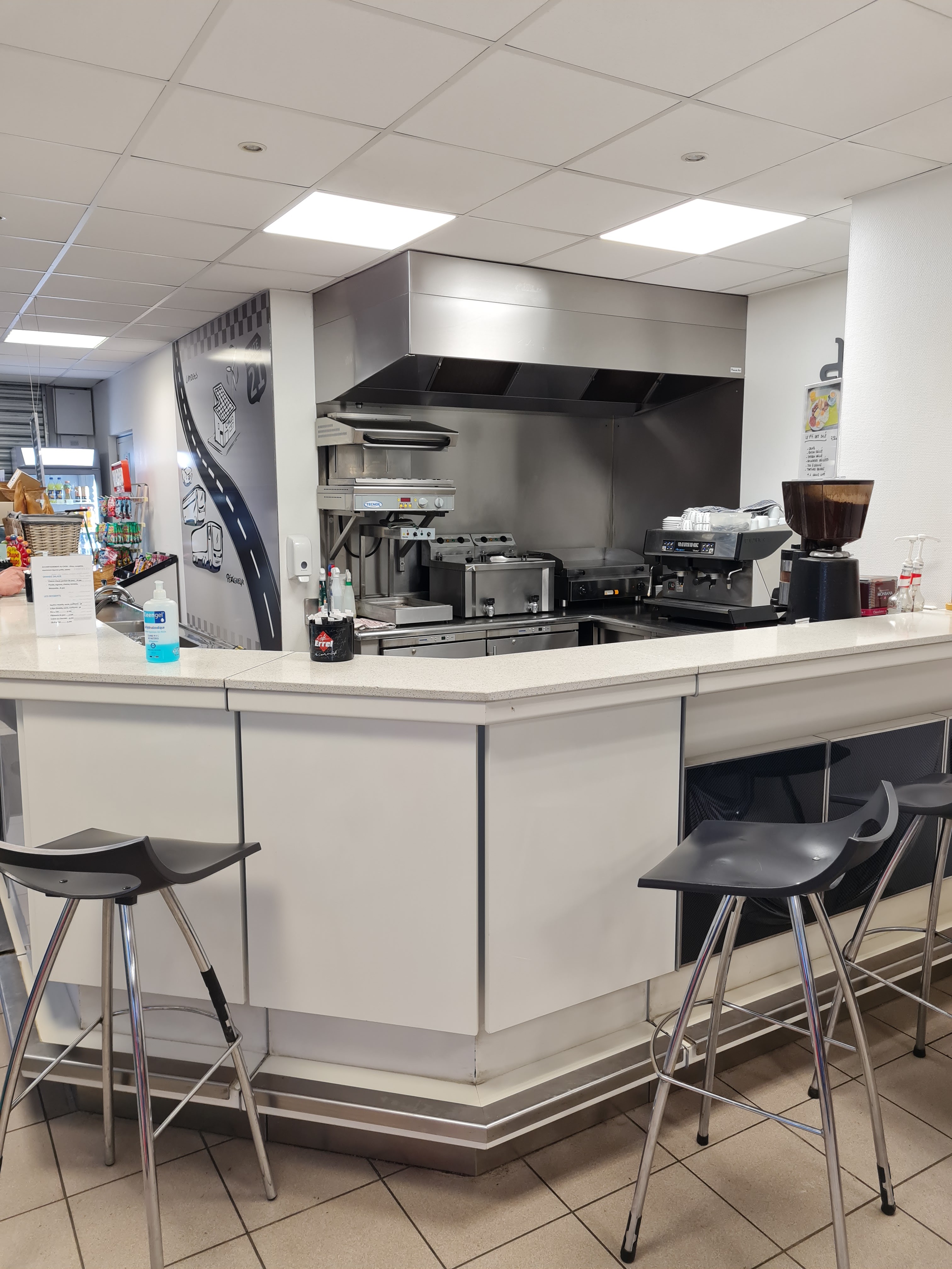 Super petite cafétéria dans la station.personnel jeune et sympathique. Service rapide Tarif resonable