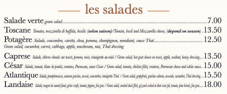 Posté le 03/08/2016 à 12:53"Salade landaise que de nom : 3 pignons qui se battaient en duel. La salade était cuite. Et dans une assiette de frite nous avions un chewing-gum à la chlorophylle. Mais qu'on se rassure le chef est très maniaque et ça n'arrive pas souvent sont les seules excuses qu'on a pu avoir. Je ne laisse jamais d'avis mais je dois dire que je ne suis pas satisfaite d'une telle prestation dans cette ville si touristique. Bref un attrape couillon."