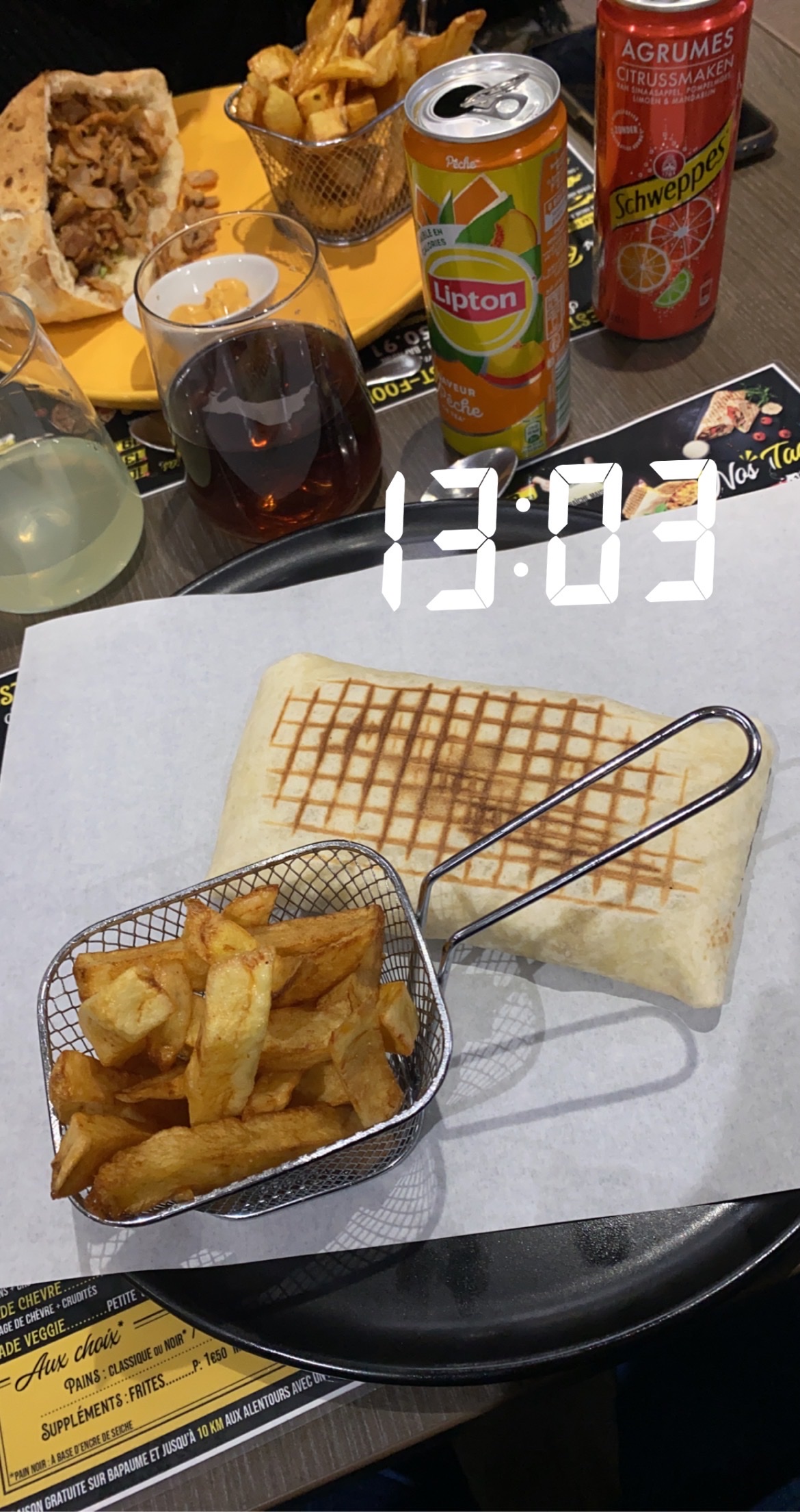 Bon repas; les frites fraîches, les savoureux tacos français, le burger au poulet et les ailes de poulet étaient croustillantes. Le tiramisu était malheureusement insipide