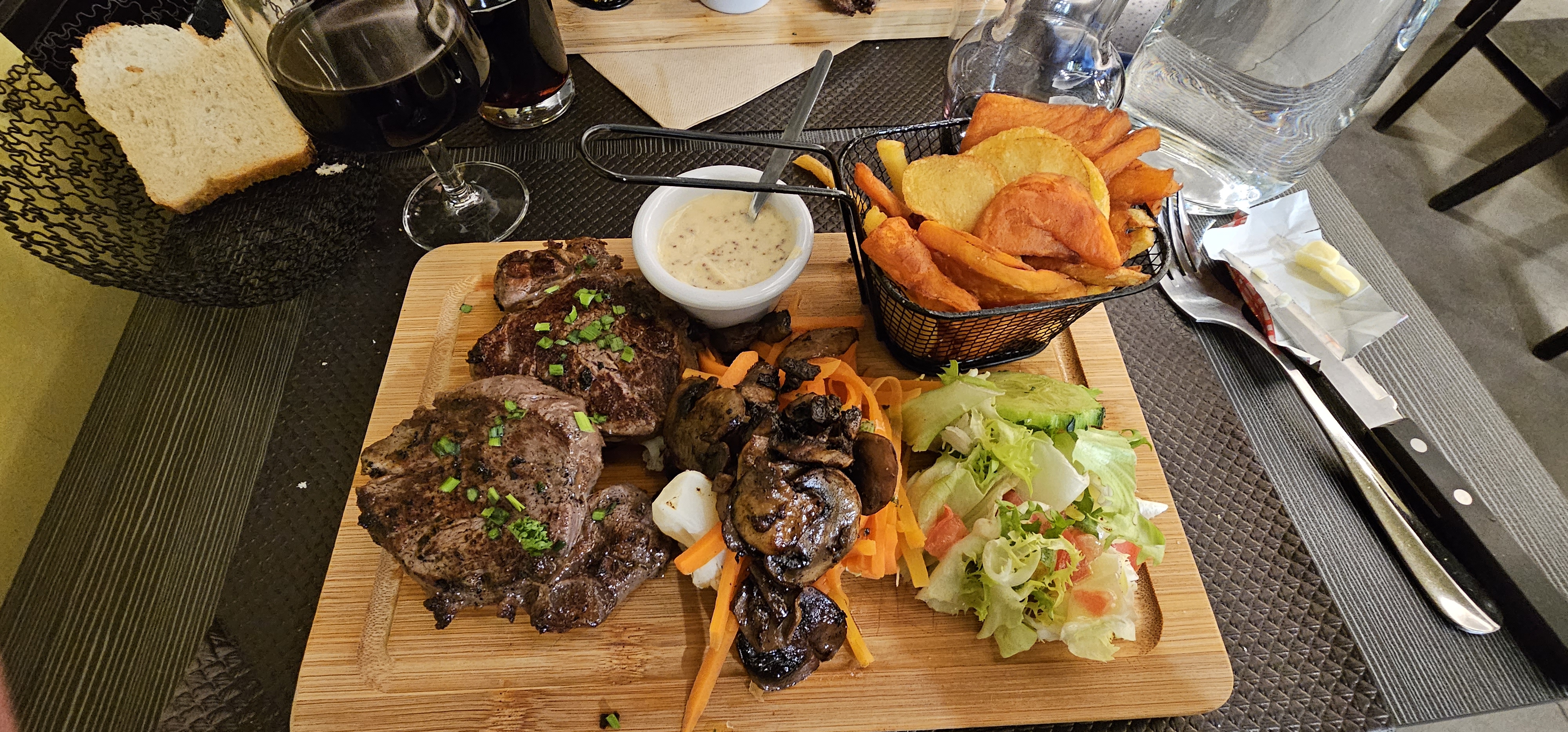 Posté le 15/08/2024 à 19:13" Le restaurant est fréquenté par des locaux : la carte est uniquement en français, en partie sur des grilles de prix plastifiées (pizza et boissons) tandis que les plats de la cuisine sont écrits au tableau (ils changent probablement fréquemment). Bières locales pression et en bouteille, très bonnes. Burger très savoureux ! excellent ! Ainsi que l'entrecôte : viande d'une qualité absolue, cuite à la perfection. Le tout accompagné d'une petite salade et de frites. Un peu déçu par l'assiette de fromages (non photographiée) : à mon avis, pour le prix payé, soit 6,90 €, la portion est un peu petite. Service un peu inattentif de la jeune serveuse : elle avait oublié l'eau, l'assiette de fromages et les couverts... c'est peut-être dû à son manque d'expérience mais, en tout cas, cela n'a pas eu d'impact négatif sur l'expérience globale. . En fait, nous avons très bien mangé. Informé! "
