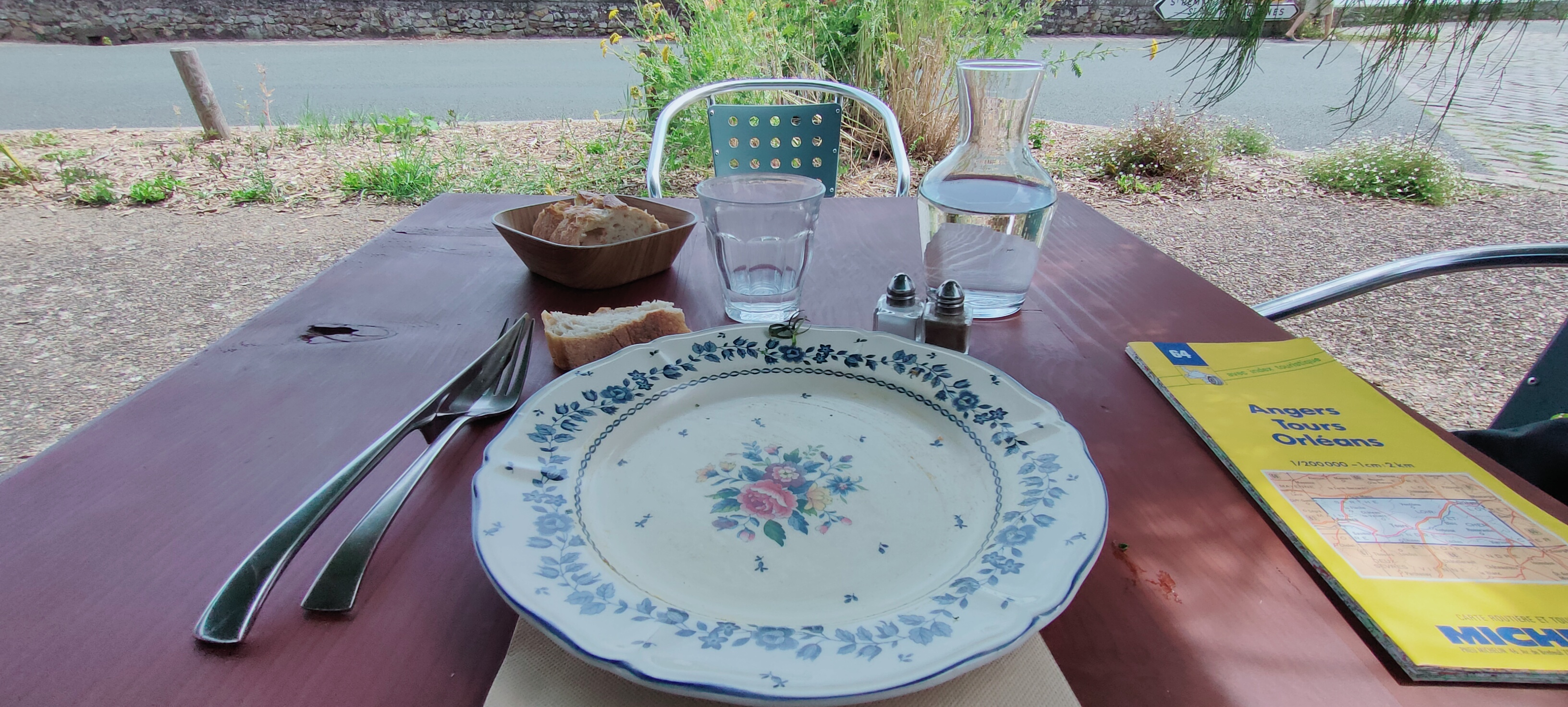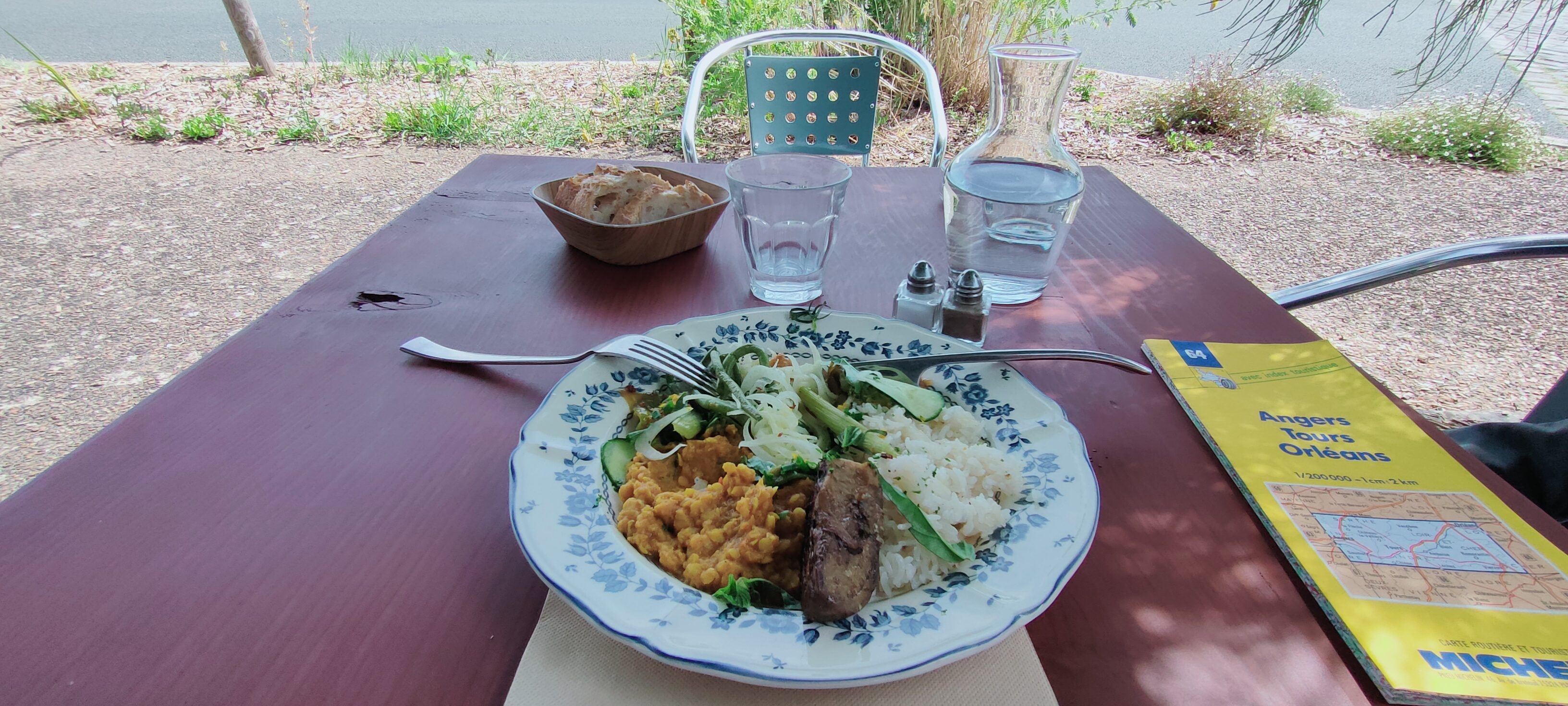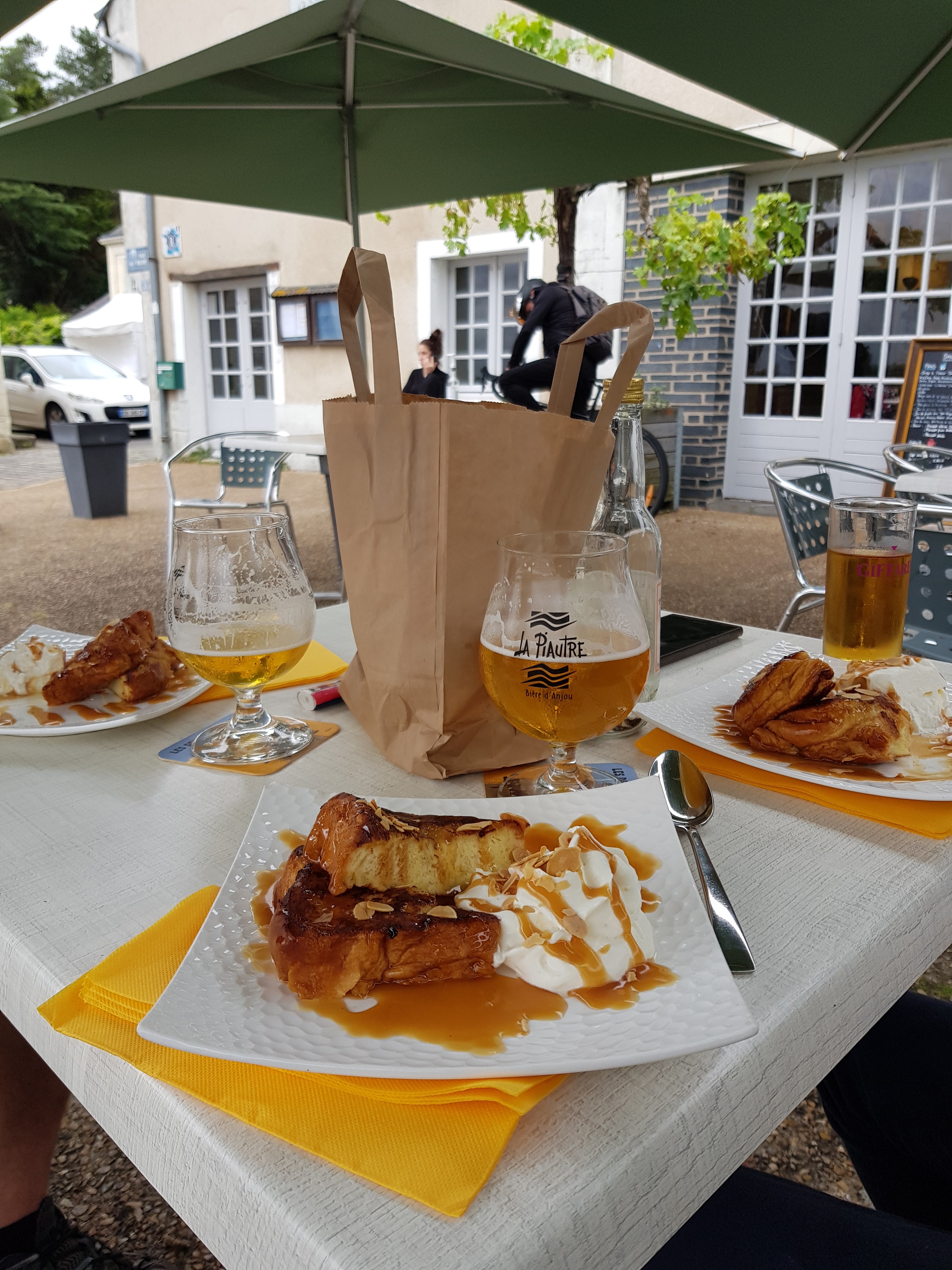 Déjeuner sur les bords de Loire lors de notre périple de la Loire à vélo. Nous avons très très bien mangé, sublime. Mention spéciale pour les roulés au boeuf et oignons et pour la brioche.