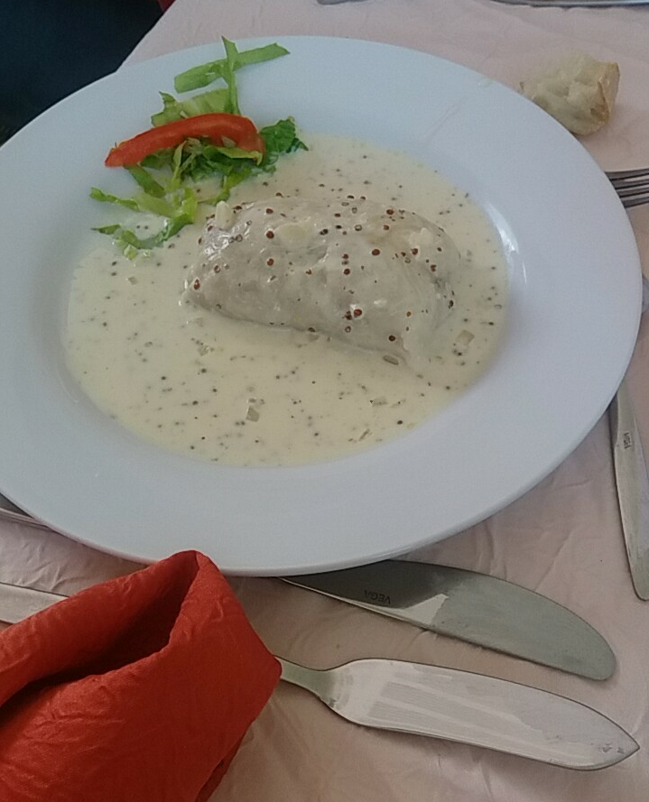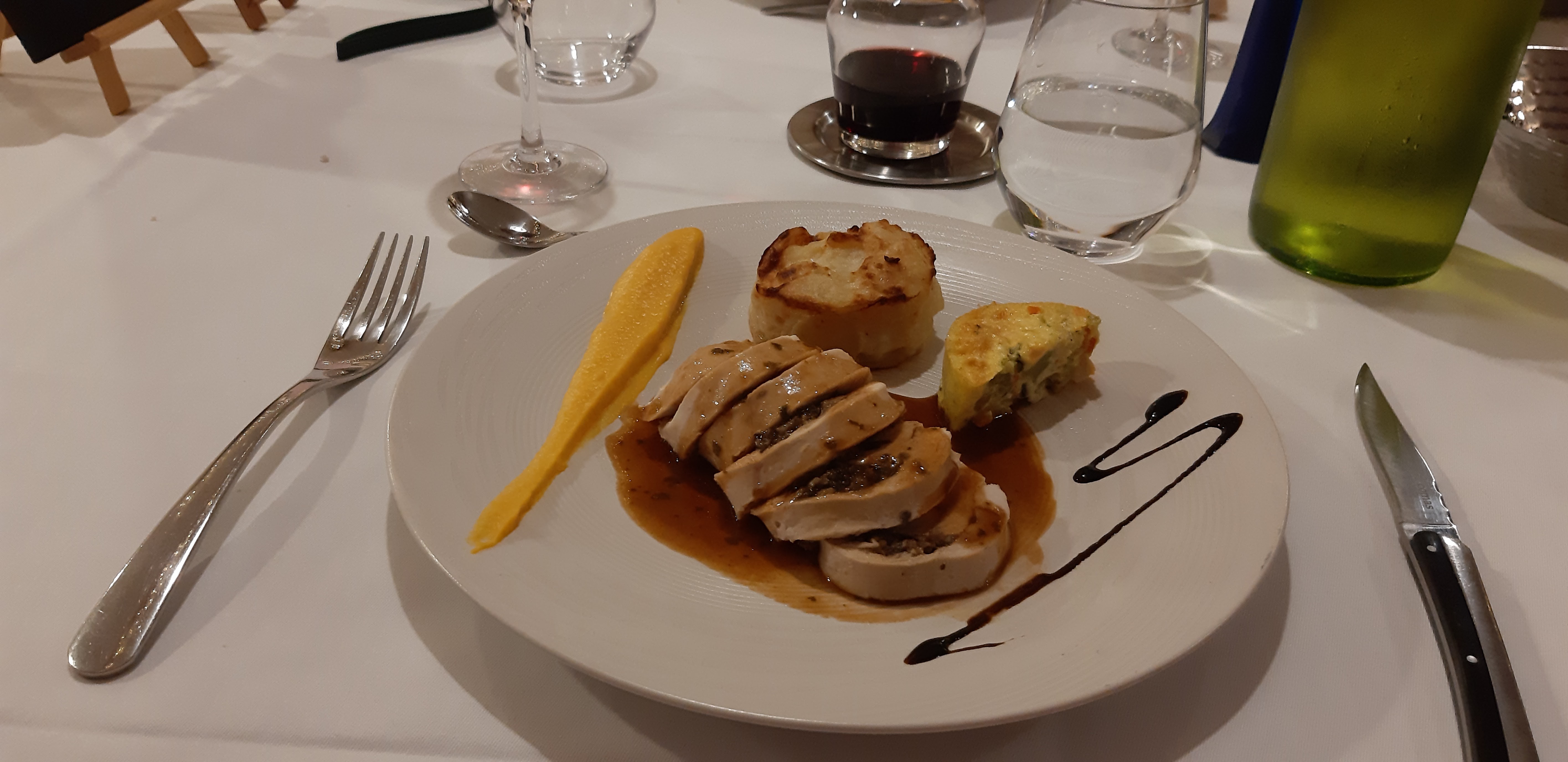 Tout d'abord cadre sympa, repas à 27€ avec le choix entre plusieurs entrées divines perso j'ai pris chiffonnée de saumon un régal. Plat de resistance fricassée de boeuf sauce au vin et fruits rouge viande super tendre et la sauce une tuerie avec d'autres choix également. Plateau de fromage sympa. Plusieurs choix de desserts. Je me suis arrêté sur un tiramisu maison excellent. Je recommande cet établissement, surtout si vous dormez aux dryades qui est à 2mns