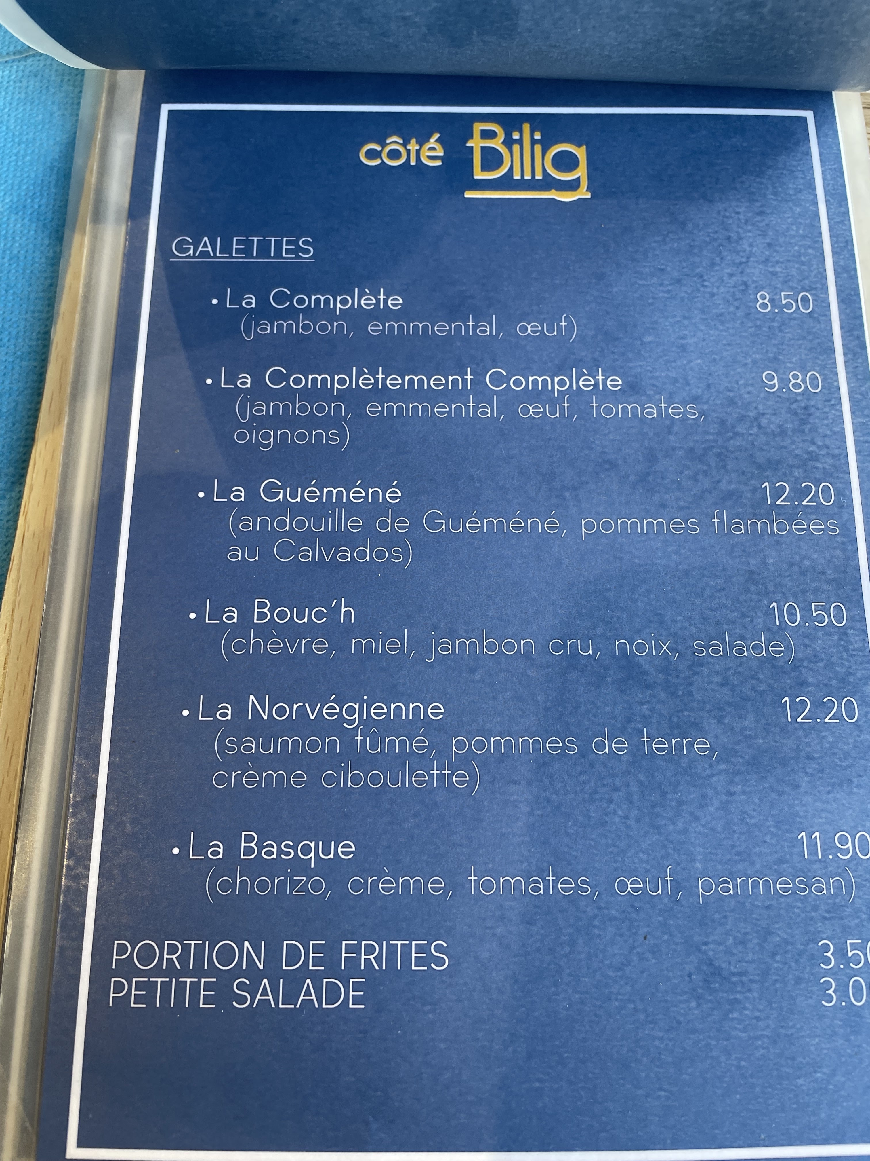 Nous sommes attirés par la carte visible depuis la rue piétonne, accueil pas chaleureux, et installation plus que limite. Nous allons passer par dessus ce désagrément et manger ce que nous avons vu sur la carte. Une fois installé nous recevons une carte qui n’est pas là même que celle affichée et que plusieurs produits dont les galettes sont indisponibles. On le signale donc avant de recevoir une réponse comme si c’était normal. C’est inadmissible d’avoir une carte qui n’est pas identique à celle proposée.