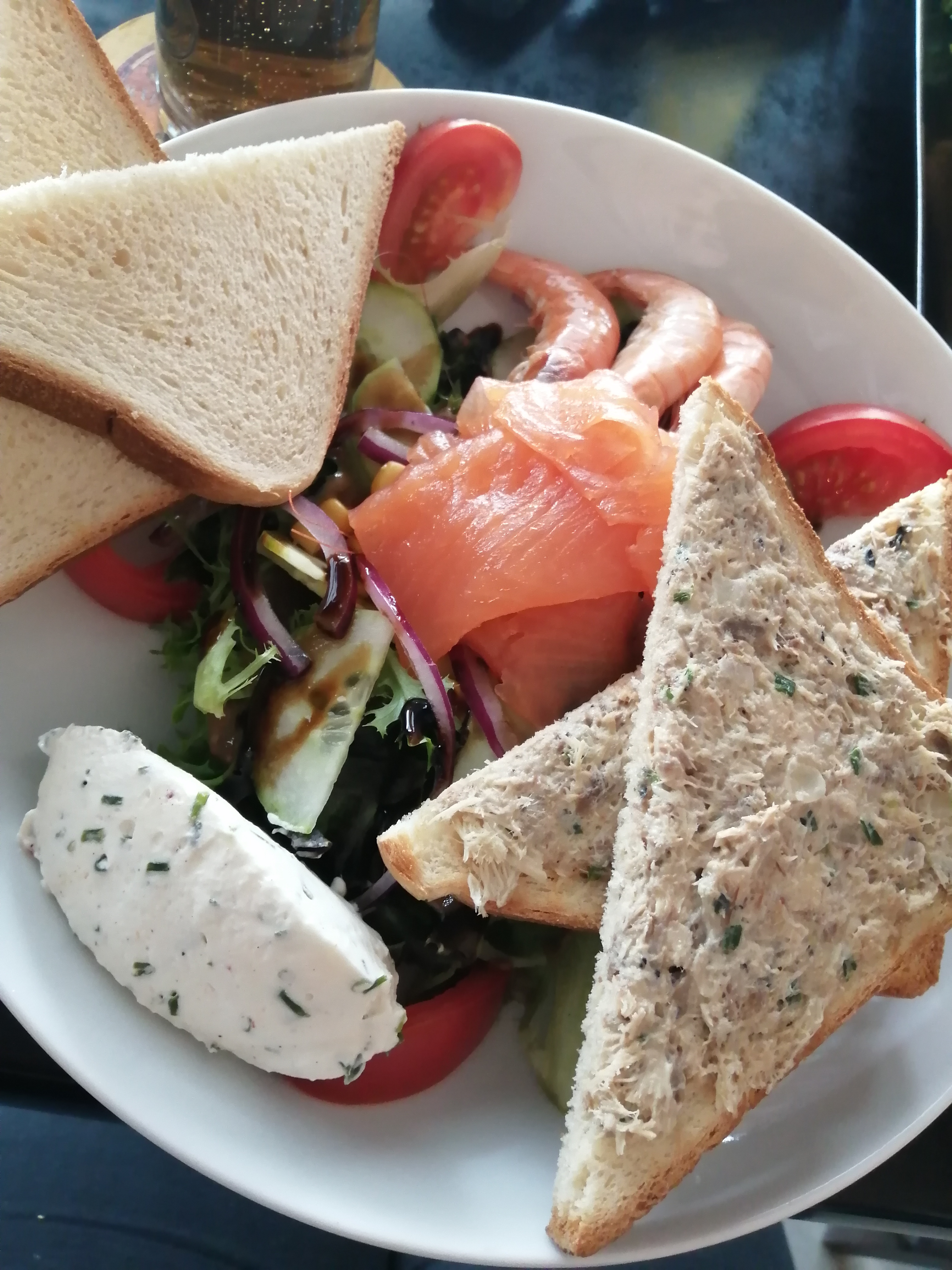 Personnel sympa mais plat un peu chère pour la qualité... Dommage. Fish and chips Avec des frites maison et un poisson frais serait bien plus valorisant pour ce petit restaurant de bord de mer. Salade composée de saumon et crevettes... Mais surtout de salade... À 13€80 avec du pain de mie pour la rillette de sardine, encore dommage.