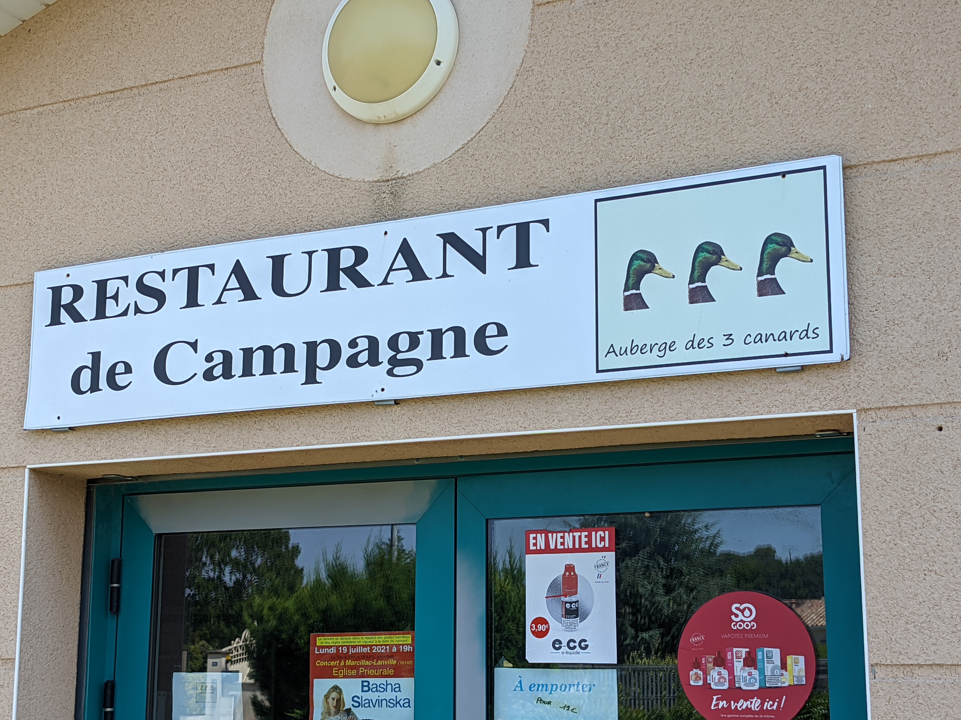 Bonjour Samedi 29 juin, 12h15 nous voulions nous restaurer aux 3 canards à Rouillac. Nous étions en cyclisme randonneur, pas de téléphone portable et de GPS. Pas trouvé et le voisinage ne connaît pas ce restaurant à Rouillac. Bien sur, nous avons compris plus tard sur internet, ce n'est pas à Rouillac mais La commune de Gourville. Dommage, il faut rectifier, votre adresse de commune.. Mais nous espérons bien nous restaurer aux 3 petits carnards prochainement.... Au vu des commentaires de la cuisine. A bientôt.