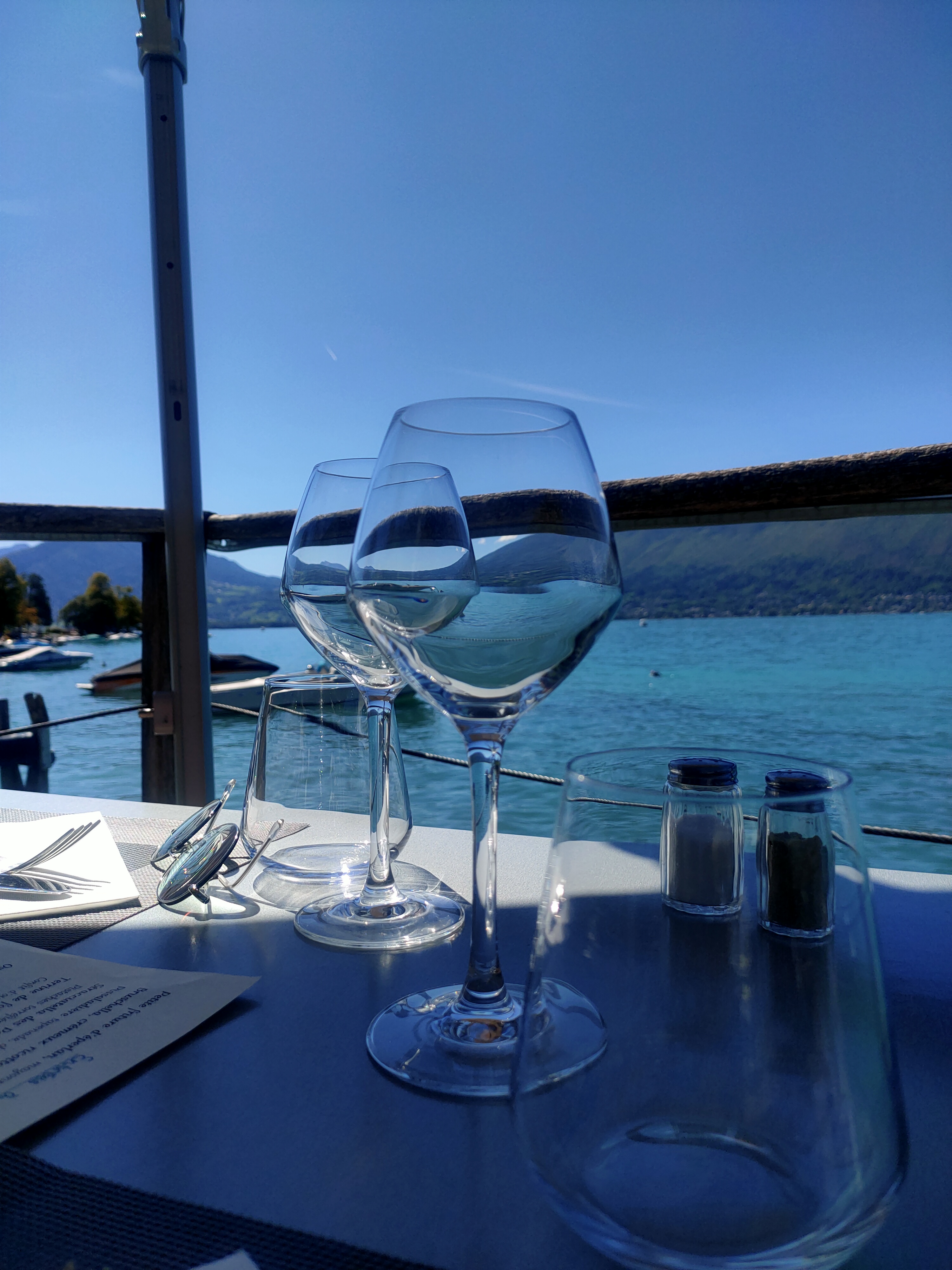 Moment en couple avec un des plus beau cadre du lac d’Annecy. Sur un ponton sur le lac. Une mini carte de plats et c’est très bien comme ça, c’est simple et bon, une petite friture, un rosé piscine et hop tu contemple le paysage et accessoirement ta douce 😊