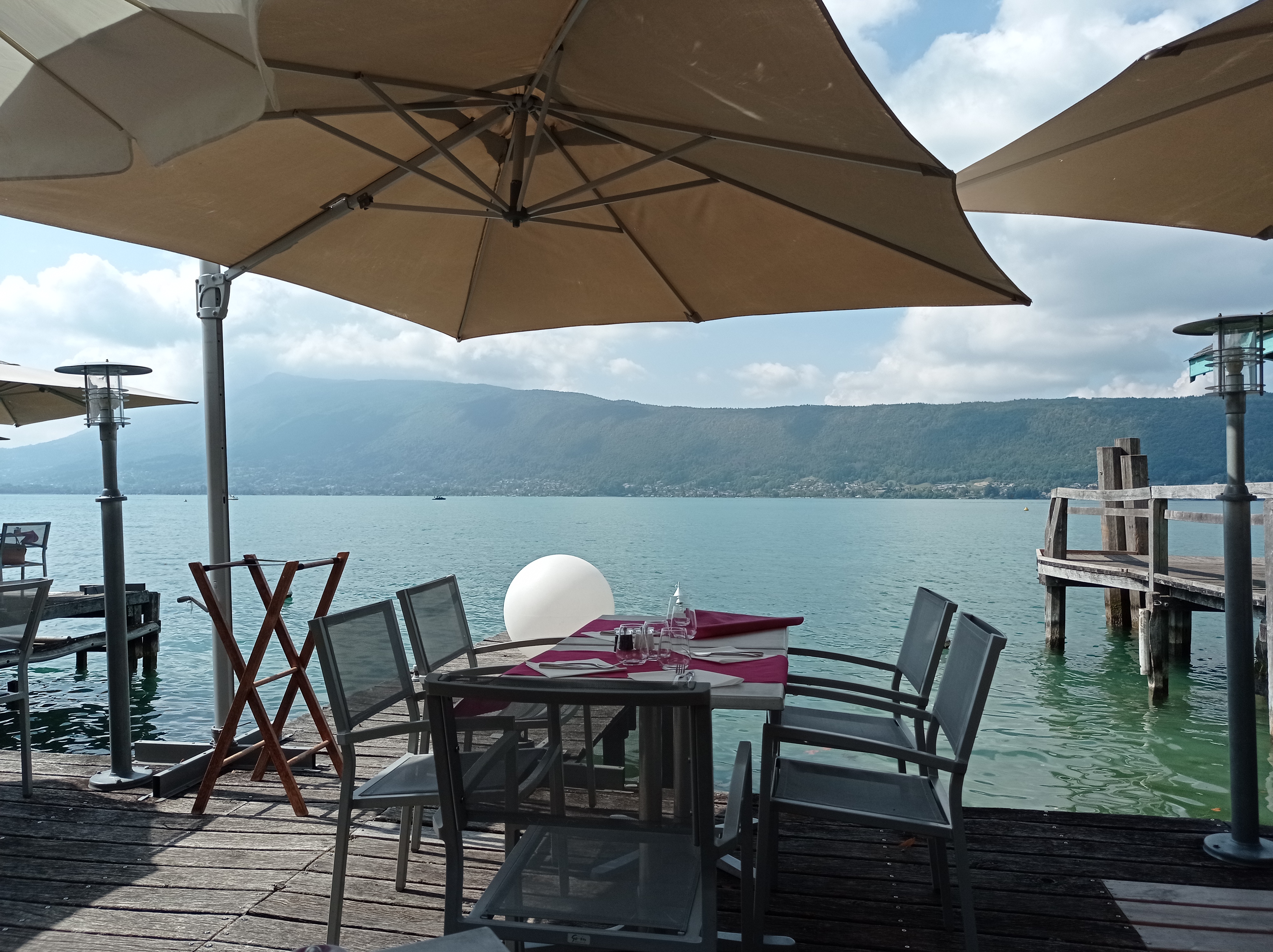 Grande déception et déjà nostalgie d'hier... De la finesse à la grossièreté. Le parquet tremble sous chaque pas du serveur avec l'idée qu'on pourrait se retrouver dans l'eau. La beauté du lieu reste intact, la terrasse, le lac, Annecy au loin mais dans l'assiette c'est désespérant... Une grosse tranche de pâté et sa confiture de fraise.... Une part de pissaladière ou une bruchetta style pizzaiolo tout ça à 15/16 euros la part. Plus aucune trace de cuisine, et encore moins délicate. Le plat, l'ombre avec sa polenta, correct, mais ça ne vaut pas ses 32 euros . Quand au dessert, aucune trace de cuisine, de la glace industrielle... Il n'y a que les prix qui restent g-astronomiques... 120 euros pour entrée plat avec apéro à deux. Passer votre chemin. Le petit restau au bord de l'eau à côté a un bien meilleur rapport qualité prix.