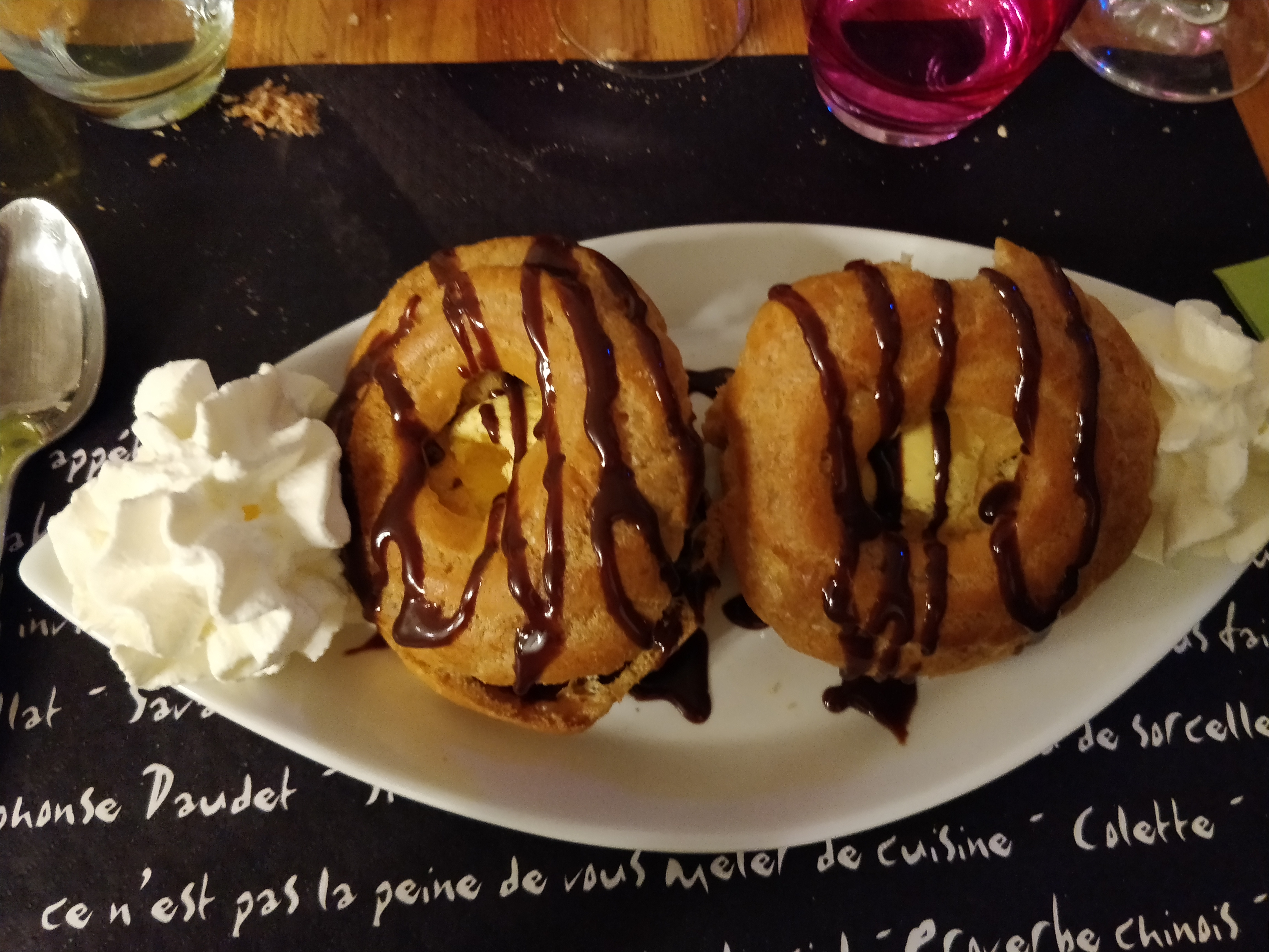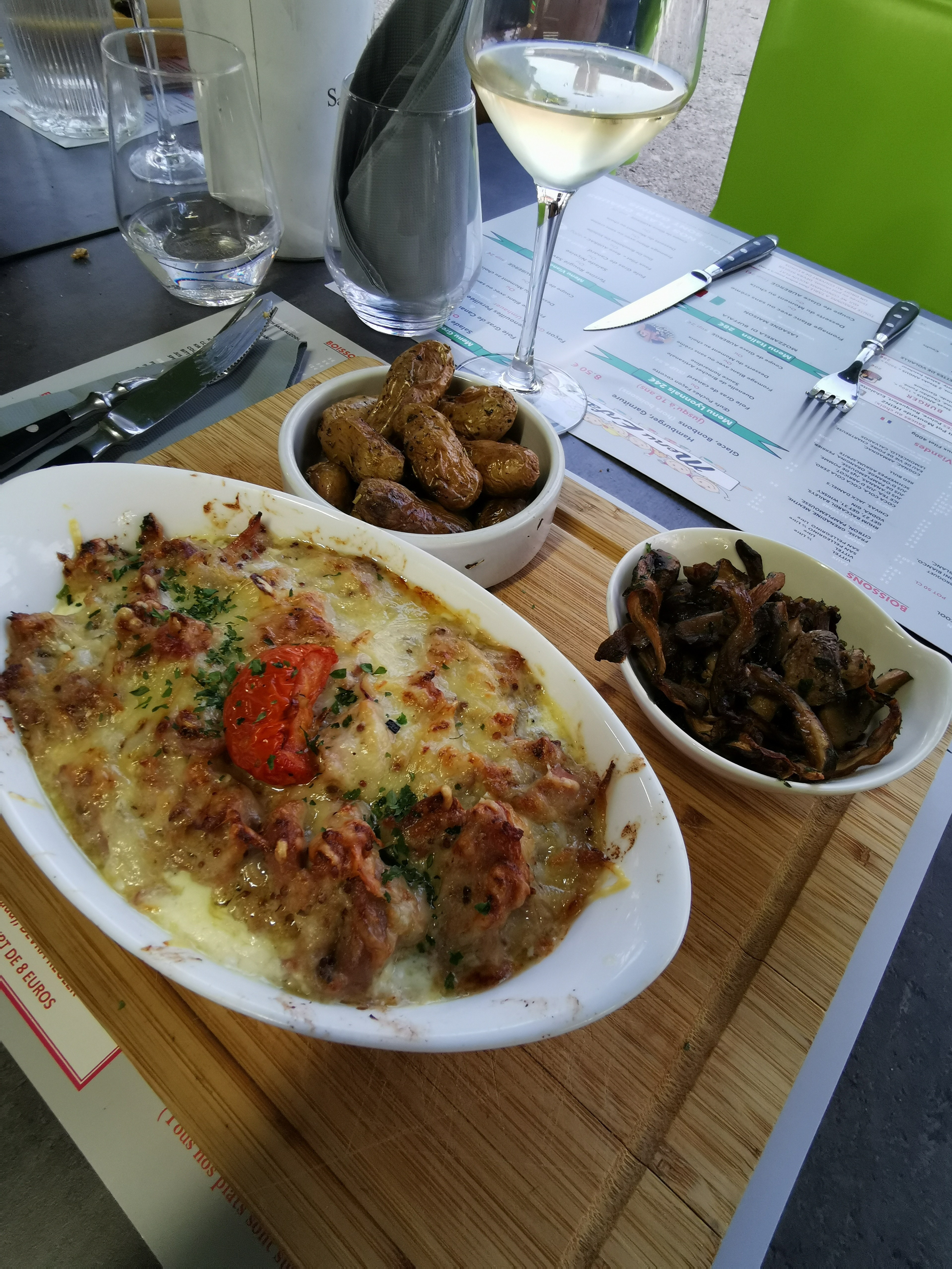1ere fois dans ce restaurant nous avons pu manger en terrasse il se trouve sûr une place au calme les serveurs étaient très sympathiques et souriant ( surtout celui avec les lunettes 😁) . Nous avons pris le fois gras en entrée ça faisait longtemps que je n'en avais pas mangé d'aussi bon 👍 par contre déçu par les grenouilles pas assez cuites et peu de goût même si nous pouvions demandé de les faire cuire un peu plus . Les desserts étaient étaient pas mal