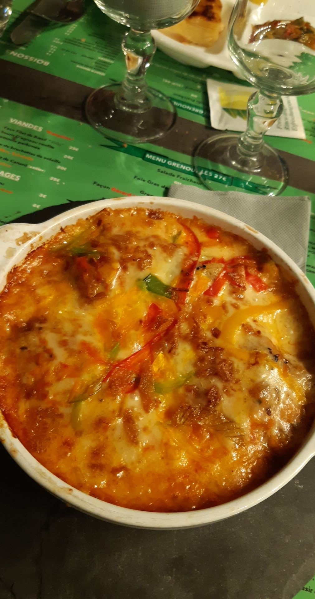 Bof bof.. une déception.. Des grenouilles qui ressemblent plus à des nuggets, une salade envahie d'oignons rouges... Bref trop cher pour ce que c'était 😐 En cadeau une magnifique faute d'orthographe présente sur tous les sets de tables 😭