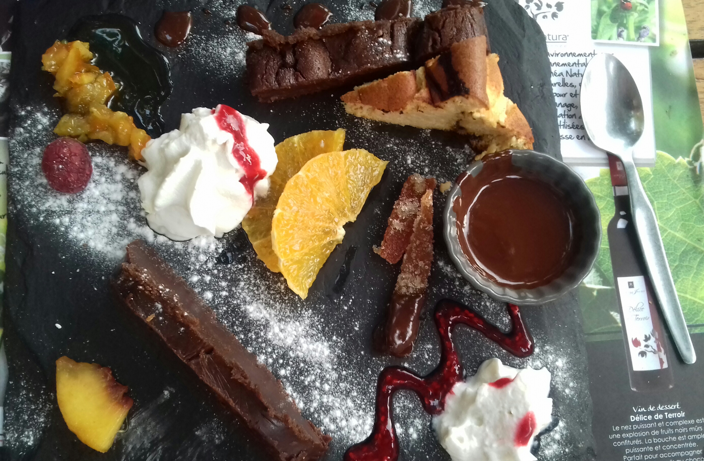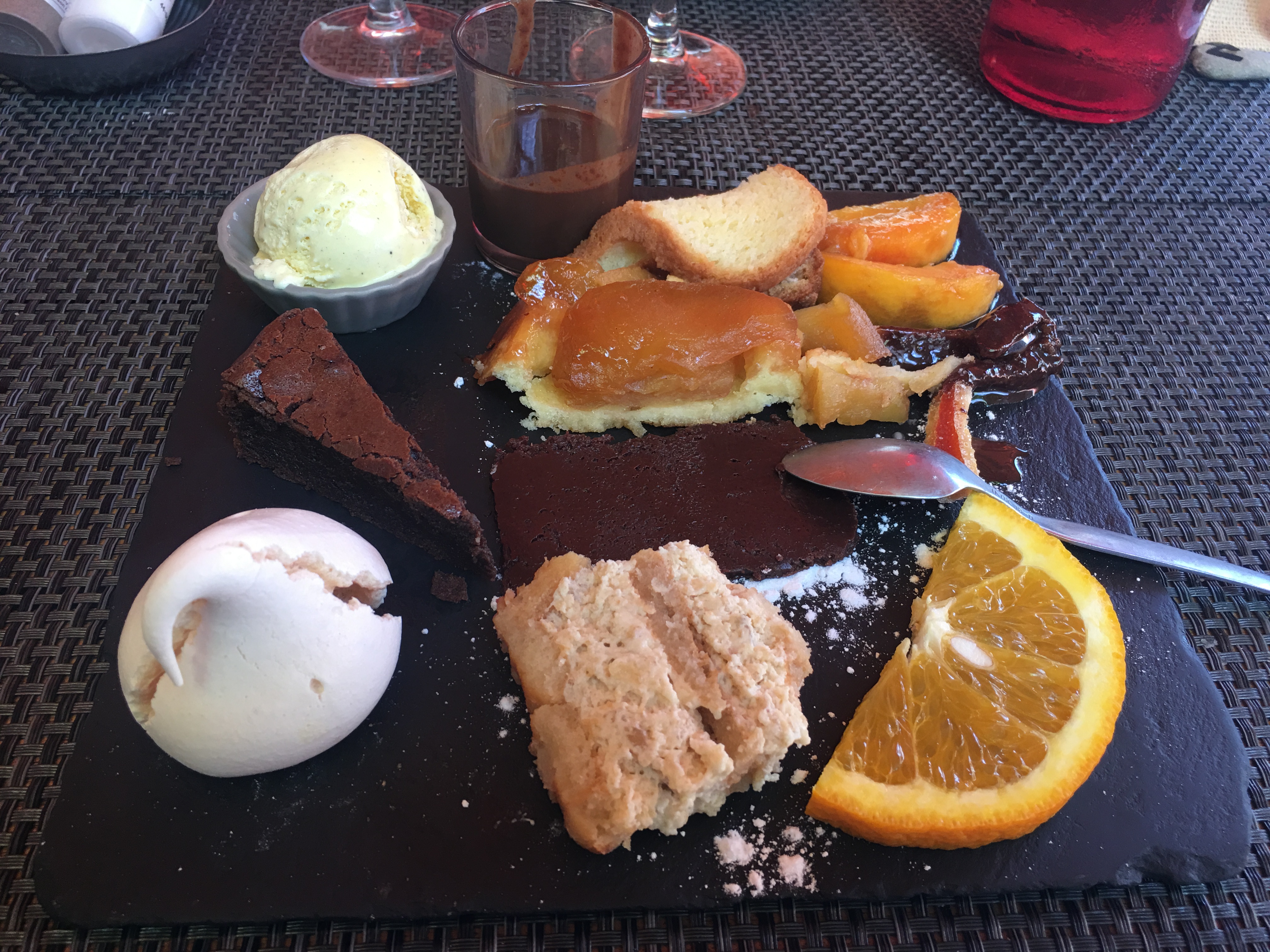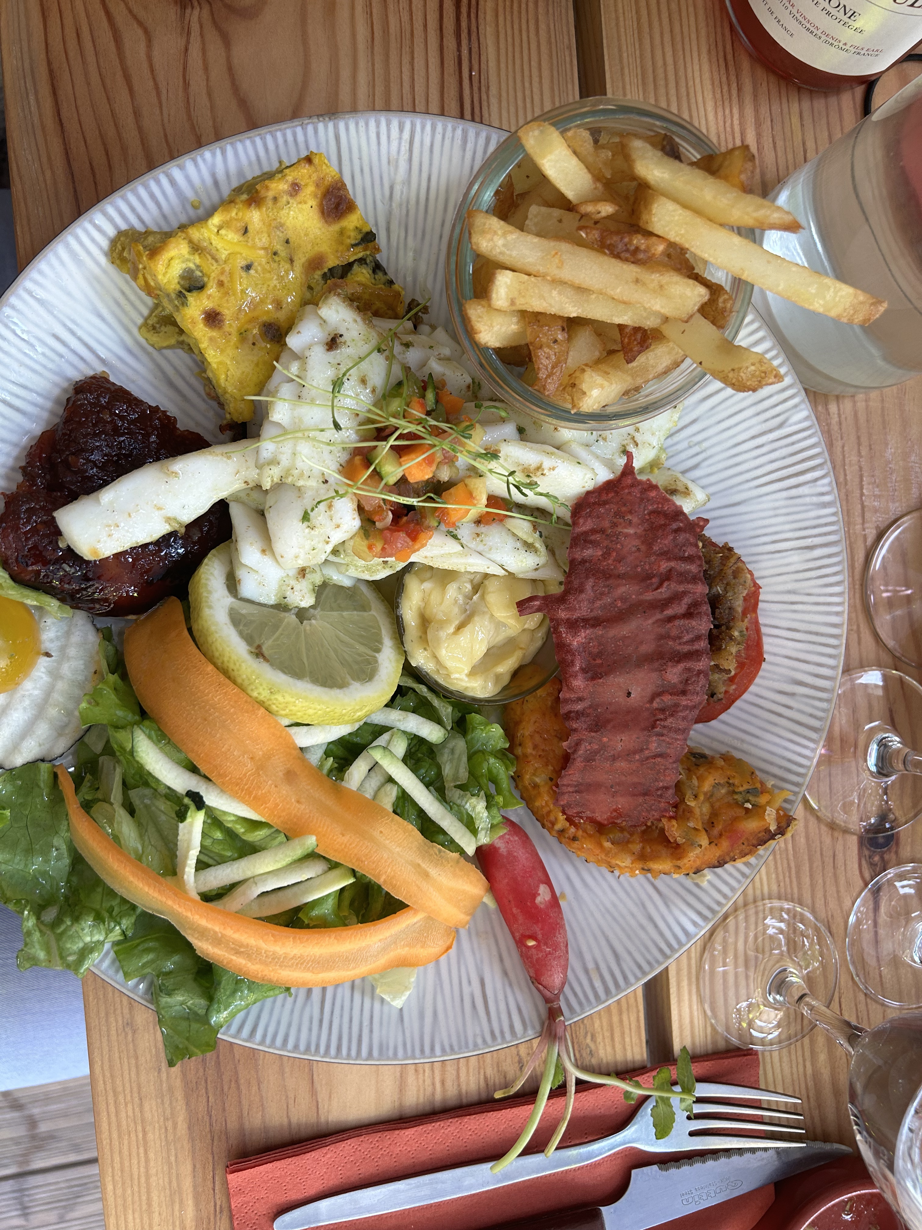 Ardoise et assiettes alléchantes! Service chaleureux et dynamique! Très bien reçus, et installés même sans réservations, très jolie terrasse ombragée, carte de vins locaux, bonne cuisine, frites et desserts maison!🍷🌺