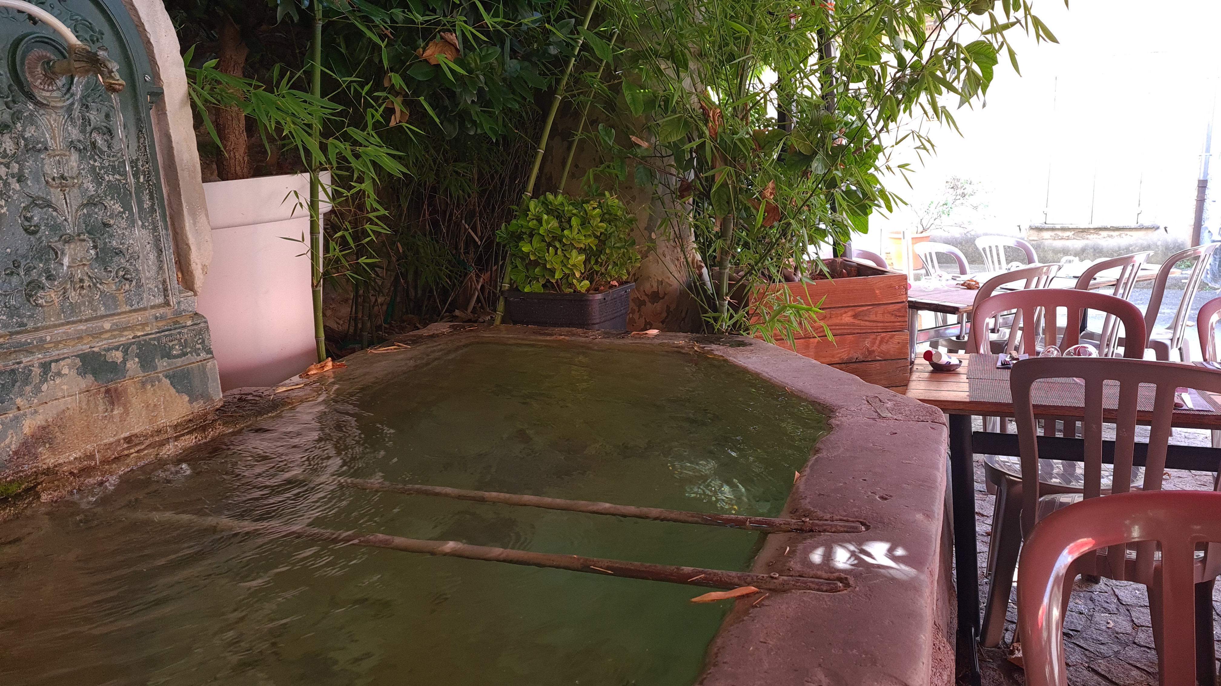 Terrasse ombragée au bord de la fontaine. Des plats gourmands, frais et copieux. .. Et pour finir le café très très gourmand. .. Merci pour l accueil surtout pour titus. ..