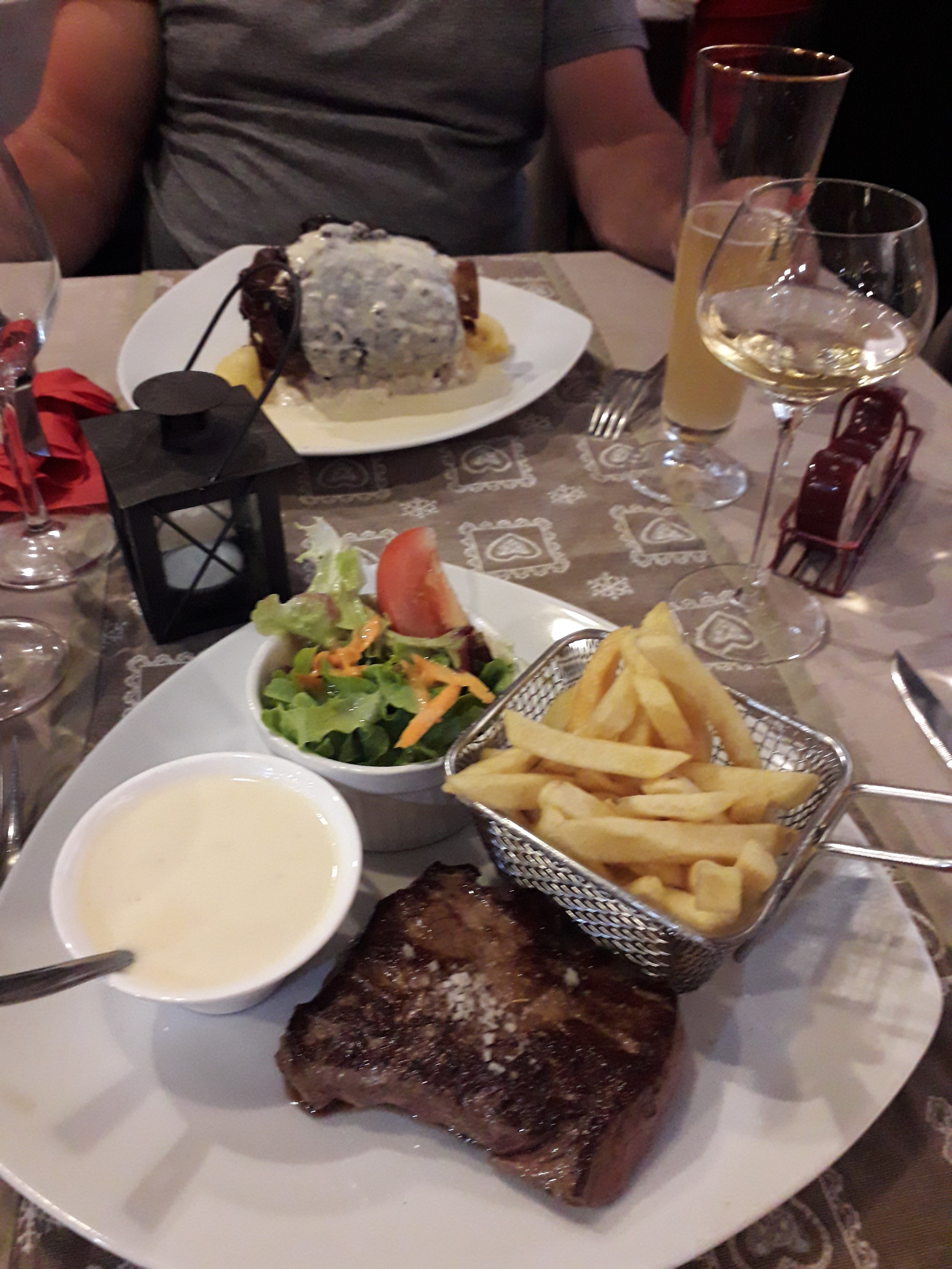 Bilan très mitigé pour ce repas Viande a 28.50€ a point arrivé ultra cuite Vin oublié redemandé en milieu de repas Pain pareil demandé par 2 fois que l on a eu a la fin du repas Frites congelé C est l usine a l intérieur hormis le fils de la patronne qui a été agréable ( un peu débordé) c est la pagaille.... on voit arriver les petits enfants pour le service qui par 2 fois ont voulu nous enlever nos assiettes alors que nous n avions pas terminés... Soft servi d une grande bouteille sans bulle a + de 3 euros.... Bref sous la décoration et les sourires c'est super surfait et spécialement touriste Dommage