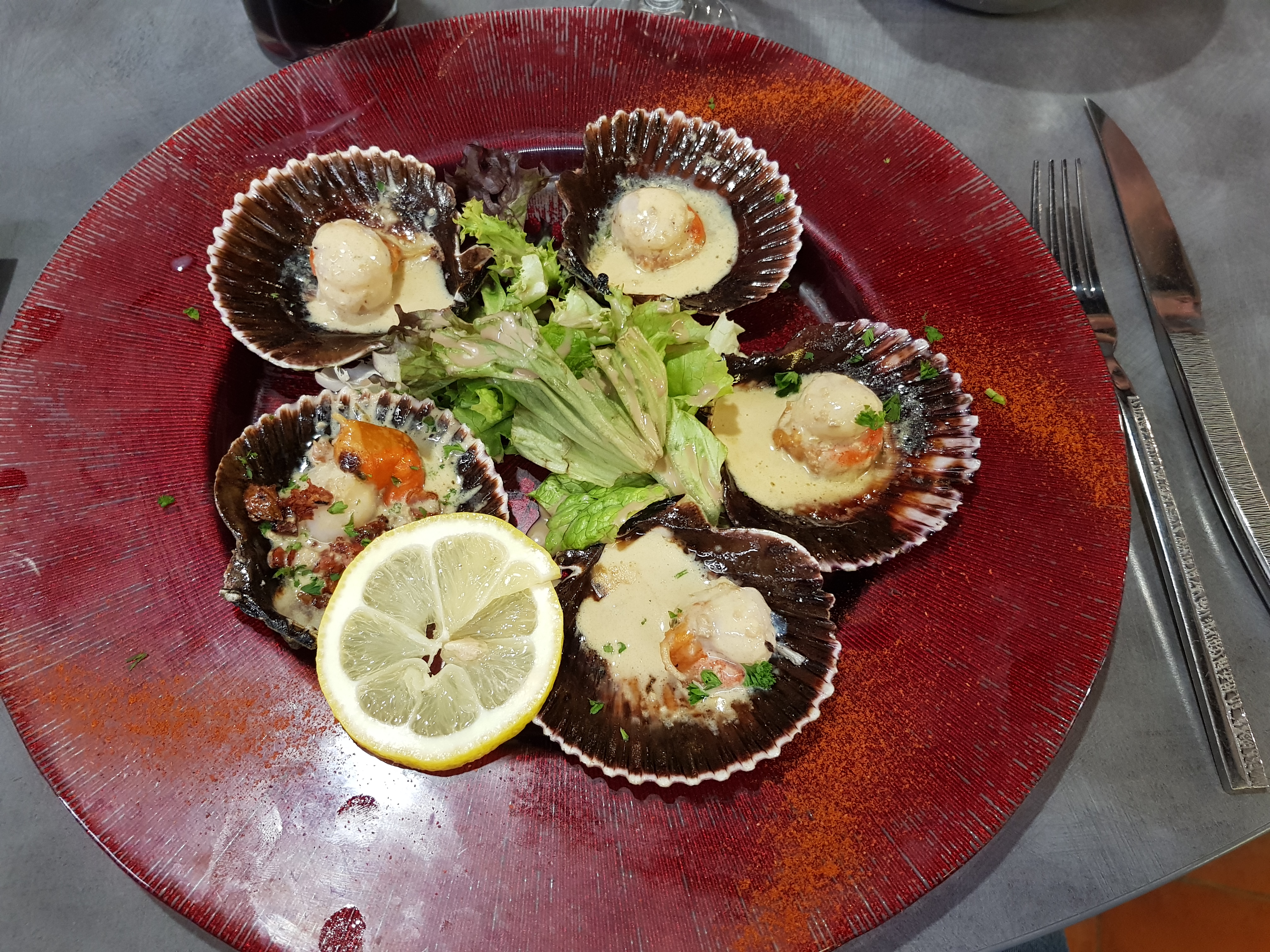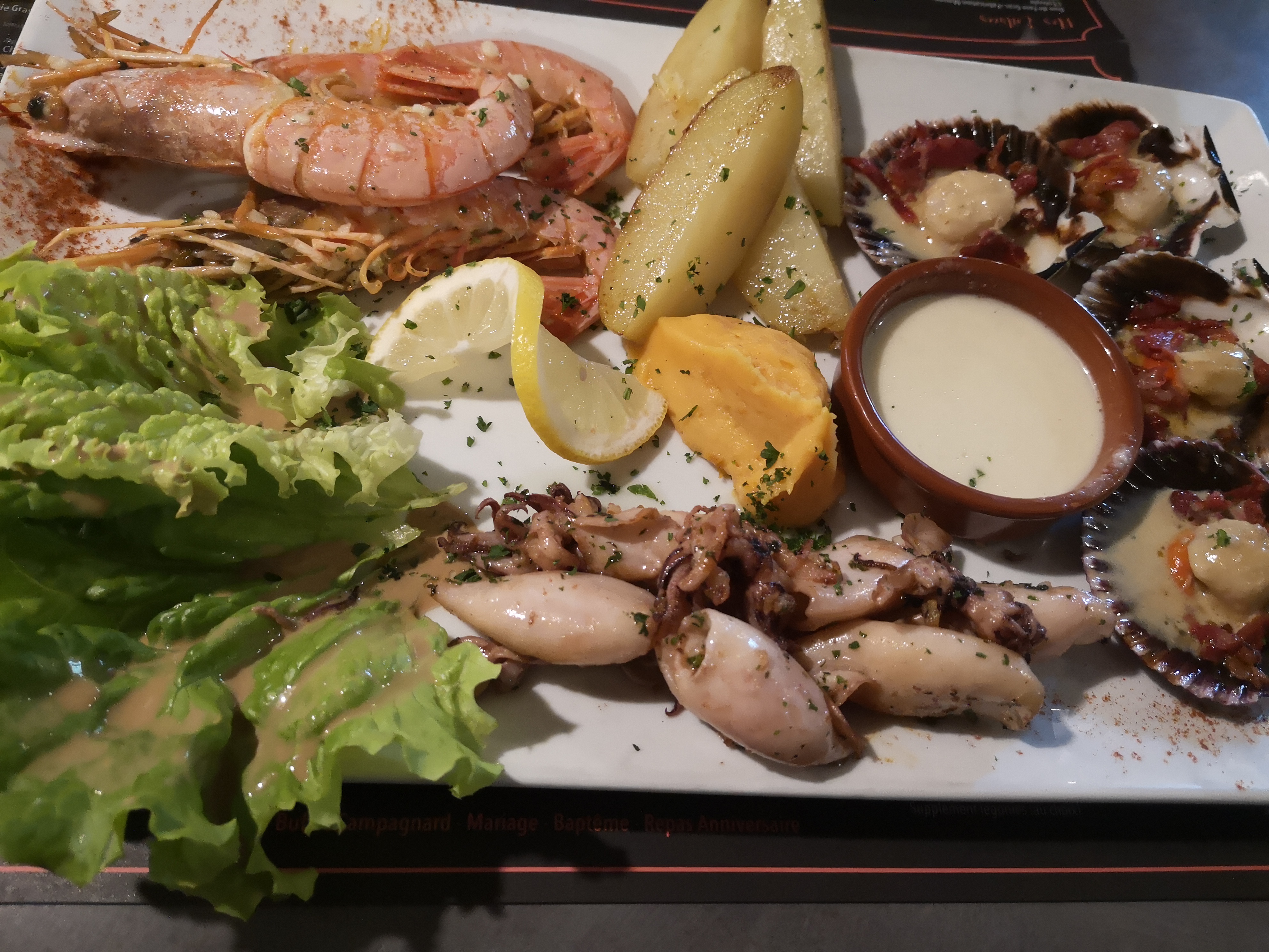 Plat de gambas chipirons noix de saint Jacques seules les noix étaient goûteuses le reste était plus que fade ! Et que l'on vienne pas me dire que certaines personnes n'aiment pas manger trop relevé !!! On ne sert pas des chipirons sans rien dessus car ils étaient très très caoutchouteux et sans saveur que le cuisinier les gouttent ! Les gambas idem belle qualité mais fades et la pomme de terre on sentait le goût du four ou moins y rajouter une noix de beurre salé bref ou moins une bonne chose le rhum arrangé qu'on nous a offert était très très bon