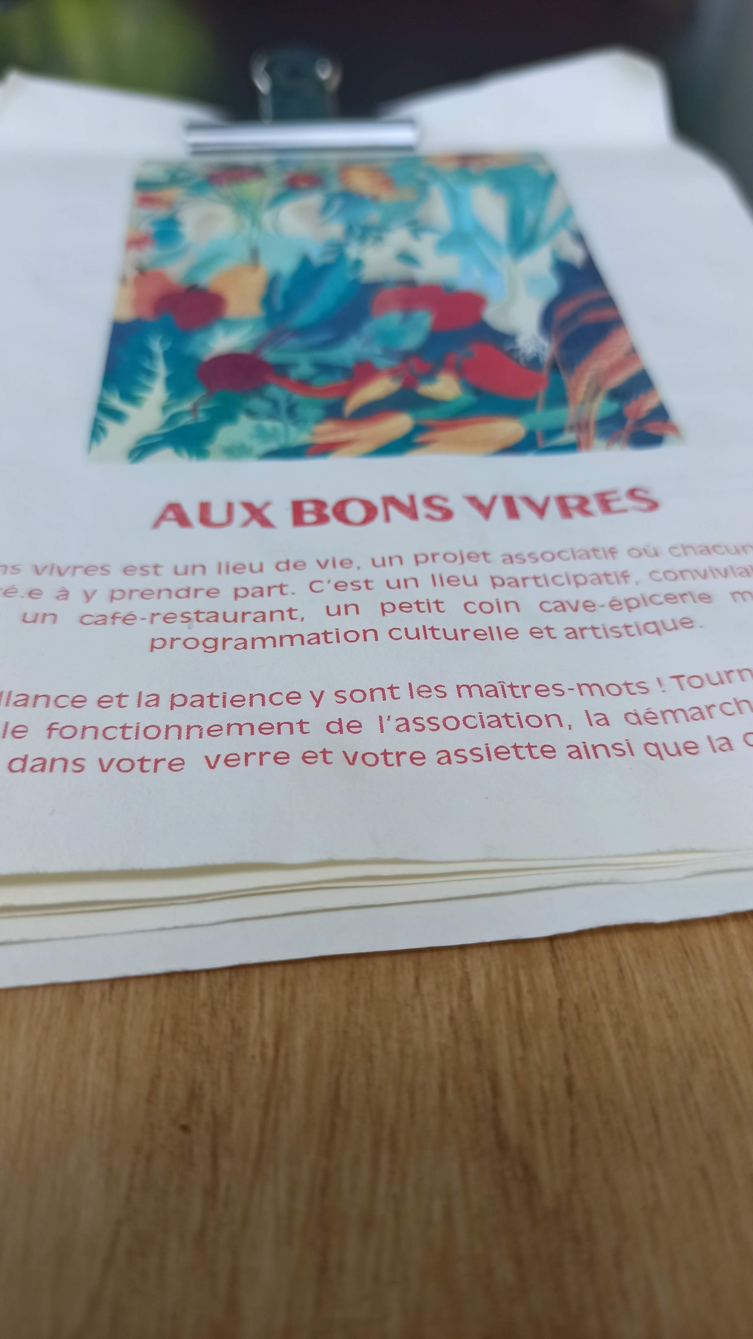 Posté le 07/10/2023 à 12:20"Vendredi dernier, aux bons vivres à organisé une soirée cabaret-bouffe. Ma femme qui connaît déjà les lieux pour y avoir mangé était enthousiasme et m'a inscrit à cette soirée. Un surprise pour moi à tous les niveaux, le repas d'abord, tous est local et mes papilles essais encore de définir toutes ces saveurs surprenantes mais finalement délicieuse. La troupe du théâtre des minuit en second lieux, qui nous a offert un spectacle simple mais tellement rafraîchissant, tout en naturel avec cette honnêteté artistique de prendre du plaisir, ce qui automatiquement nous en donne. Et pour finir le lieux en lui-même qui dégage une chaleur humaine si rare de nos jours, grandement soutenue par une équipe dont les sourires non-fins contribue à ce moment, presque magique, qui nous donne l'impression de vivre un instant hors du temps. Alors merci à tous les acteurs de cette soirée simple, juste et chaleureuse et pour ceux qui liront mes mots je ne peux que leurs conseiller vivement de perdre un moment de leurs vie dans ce restaurant"