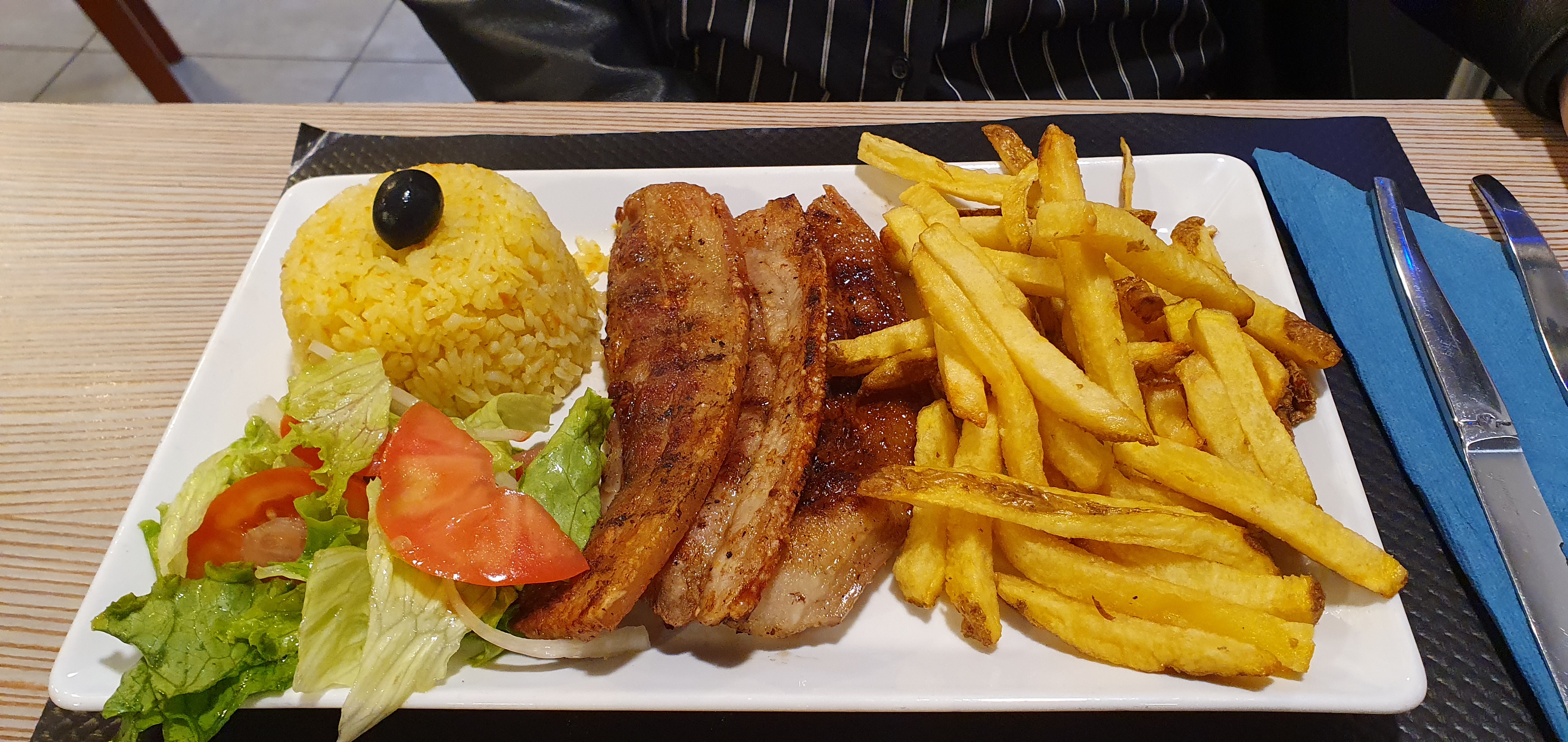 Posté le 28/12/2023 à 20:14"Je suis agréablement surprise de la qualité des plats, c'était pour nous une première sur place, habituellement nous prenons des poulets à emporter... Nous y sommes allés un mercredi soir en semaine, la patronne étais très agréable, une salle très propre, décoré avec goût avec en plus de ça un poêle à bois... Nous avons pris un menu enfant(hamburger) d'ailleurs très bien servi à un prix parfait, et 2 assiettes mixtes grilles, nous, nous sommes régalés ☺️ juste à savoir le pain est payant comme au Portugal..."