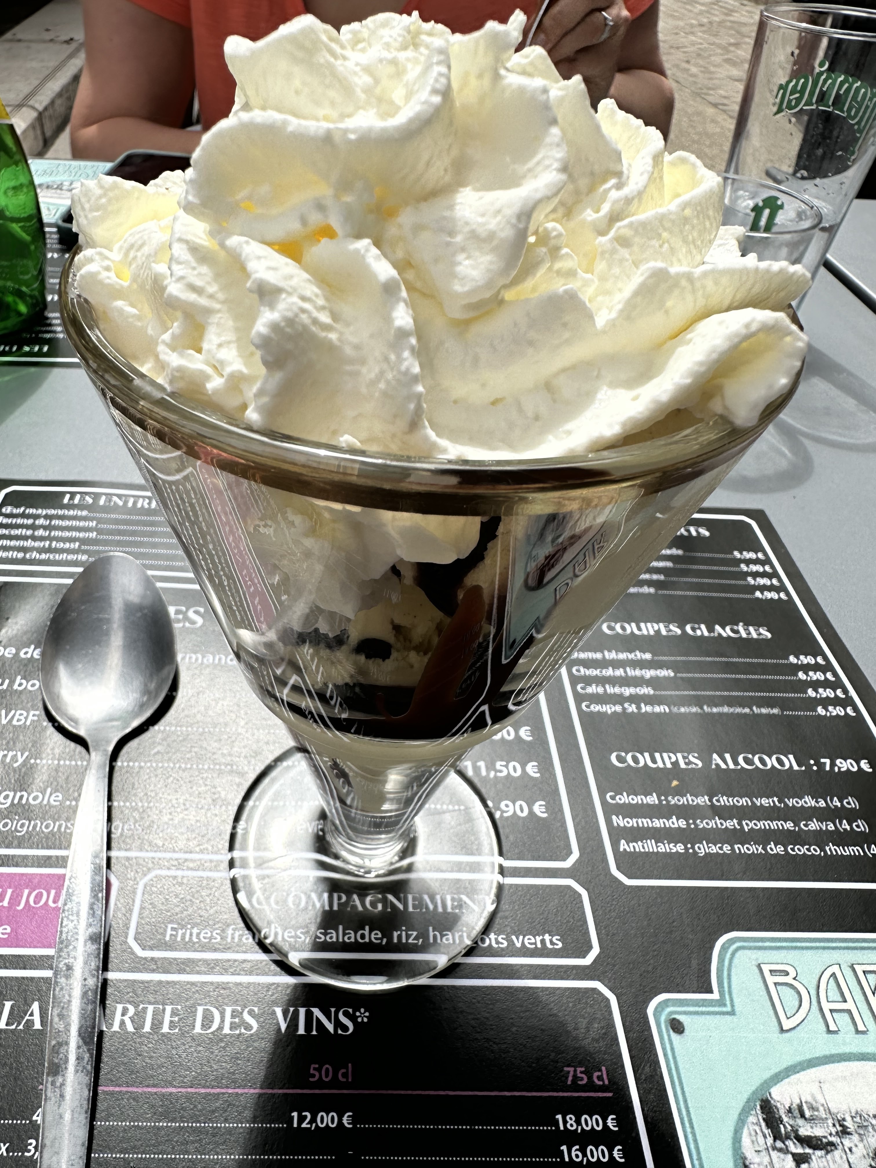 De passage dans la ville nous nous sommes posé en terrasse. Nous avons pris une formule plat + dessert à 16,50€ : Brochette de poulet salade et frites et en dessert une dame blanche. La brochette de poulet est bonne mais je n’ai pas trop aimé l’assaisonnement. Les frites maison sont bonne. Rien à dire pour le dessert. Les serveurs sont sympas et agréables même si le service est un peu long. Ce fut une bonne expérience à renouveler.