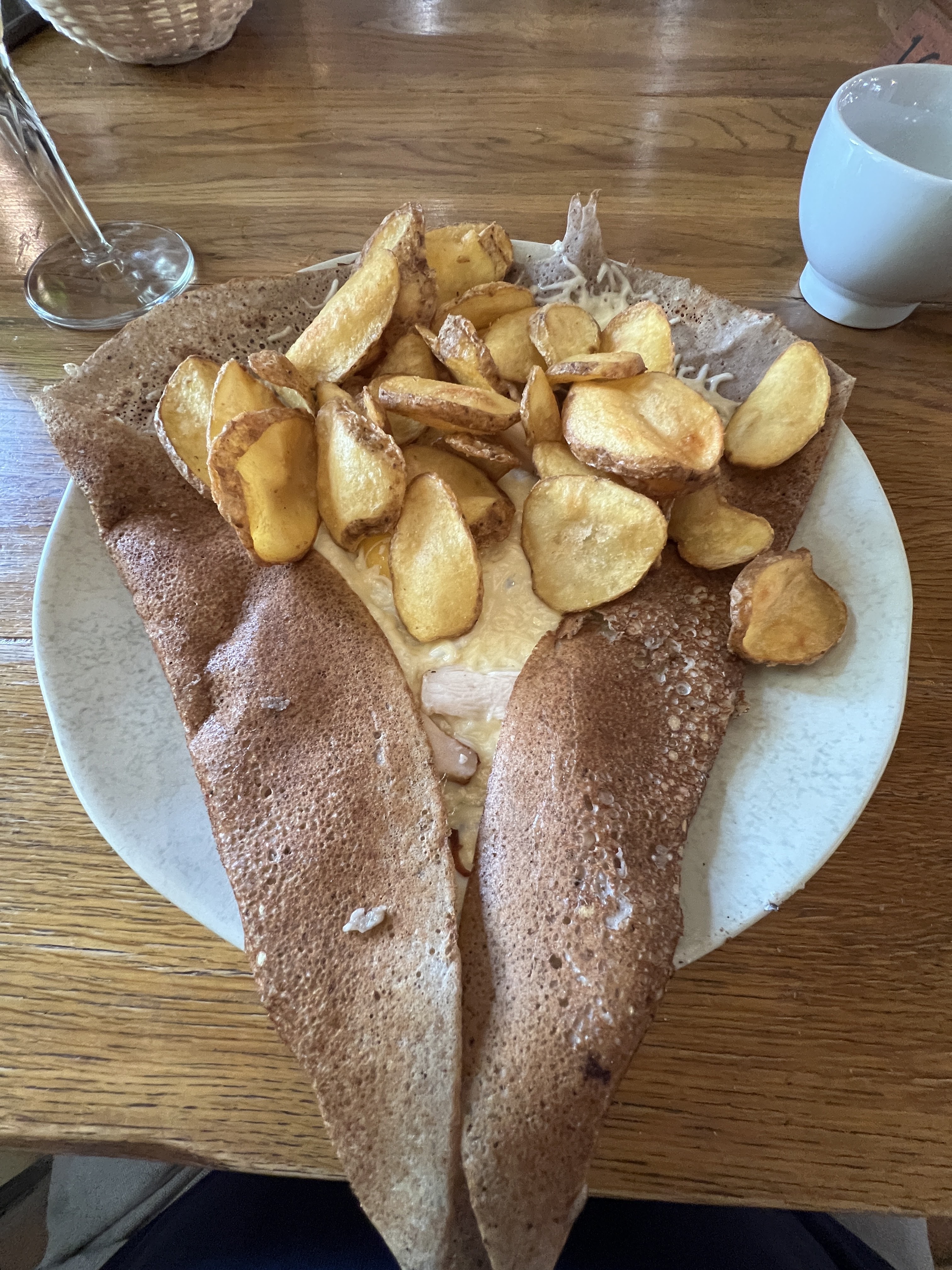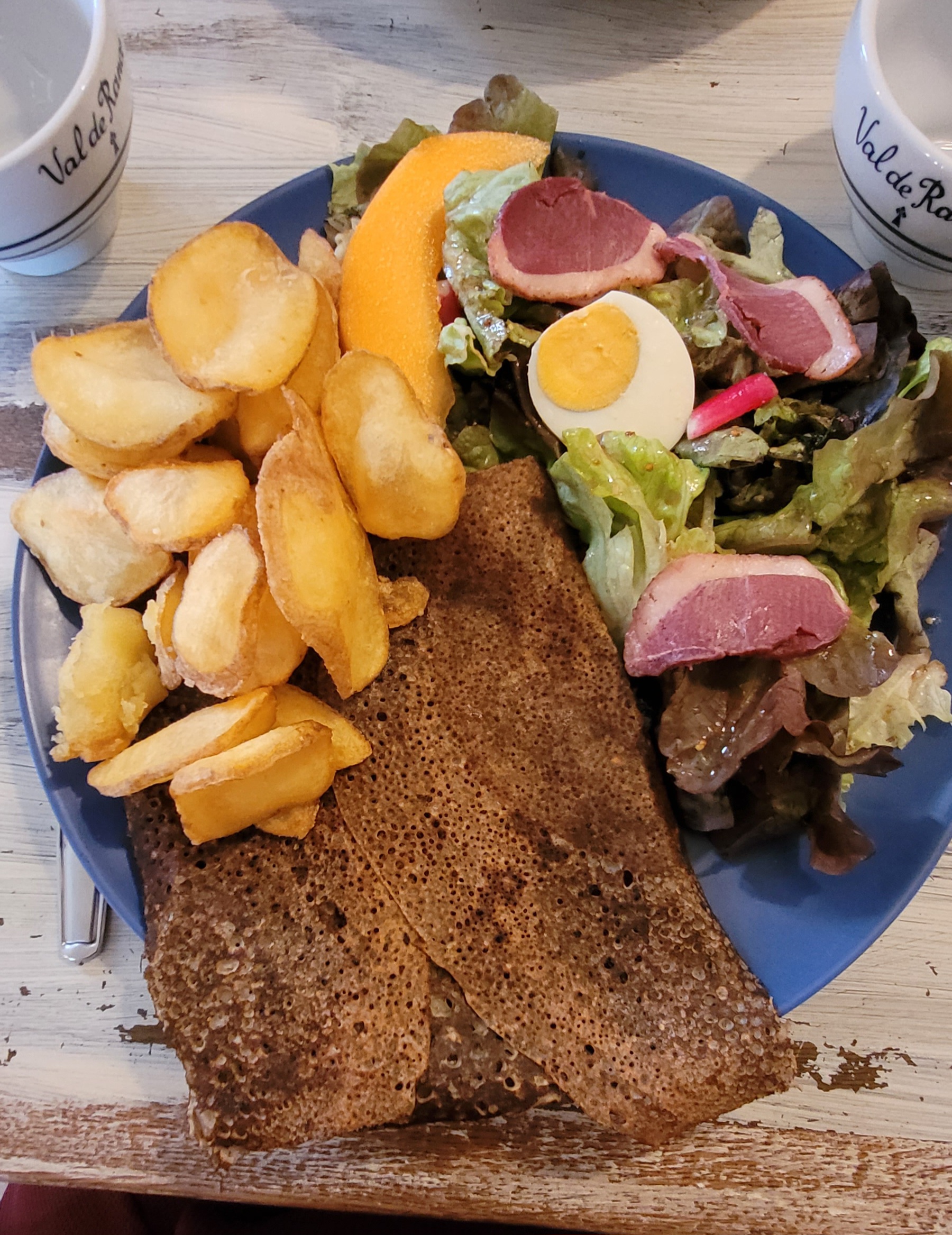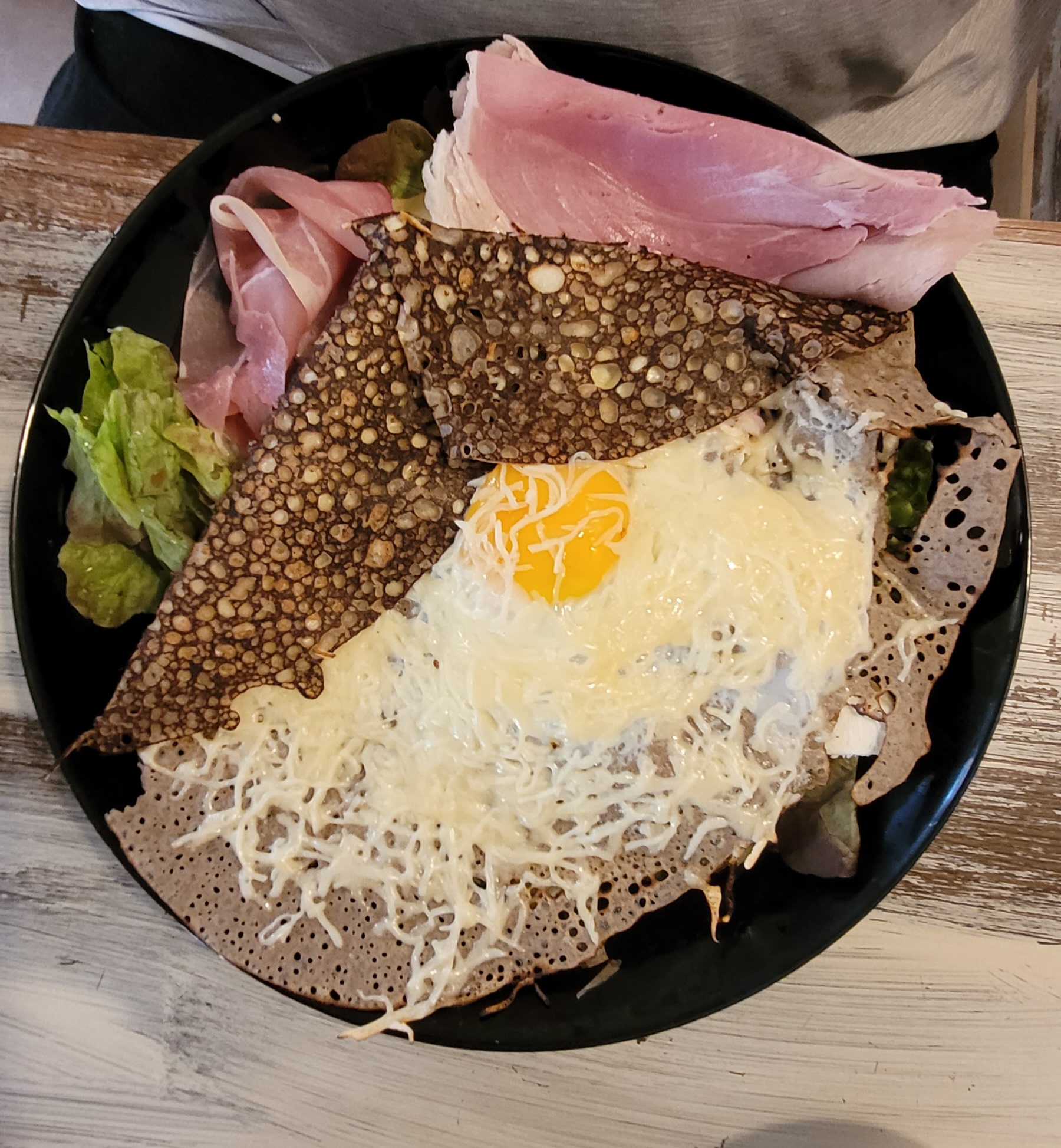 J ai trouvé cela correct meme si pour moi la galette du jour comprenait trop de poireaux et une salade aurait completé l assiette. La crepe manquait 7n peu de beurre mais était neanmoins bonne. J ai également été surprise que le personnel n ai pas de masques alors qu il y avait des affiches indiquant masque obligaroire ....cela n est peut etre plus obligatoire ?