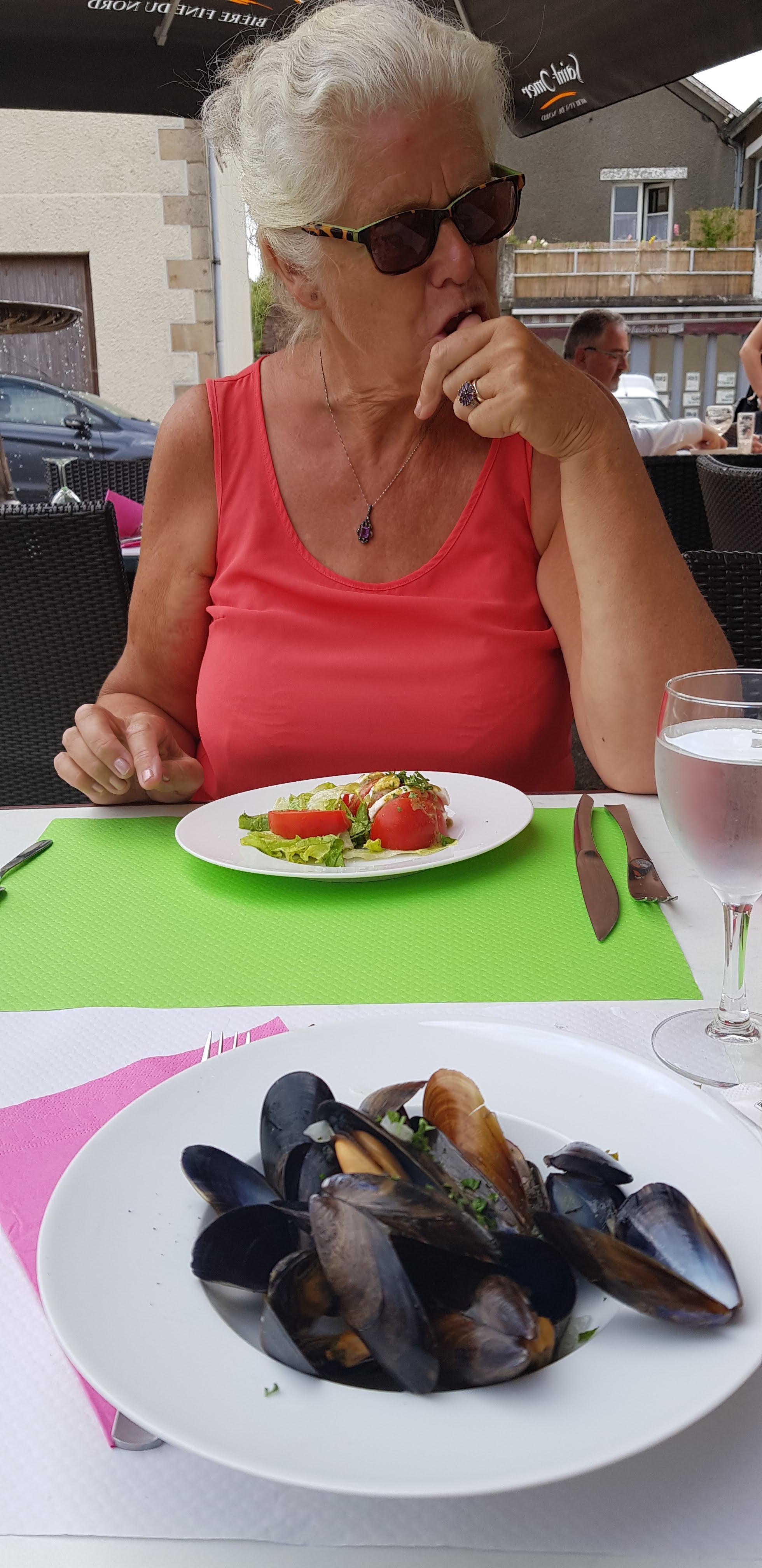 Toujours une bonne part de jour substantielle. Aujourd'hui 1/4 l de Rosé chacun, pâté et salade, filet mignon et frites et petits pois et carottes, fromage, tarte aux pommes et café. 12 euros !