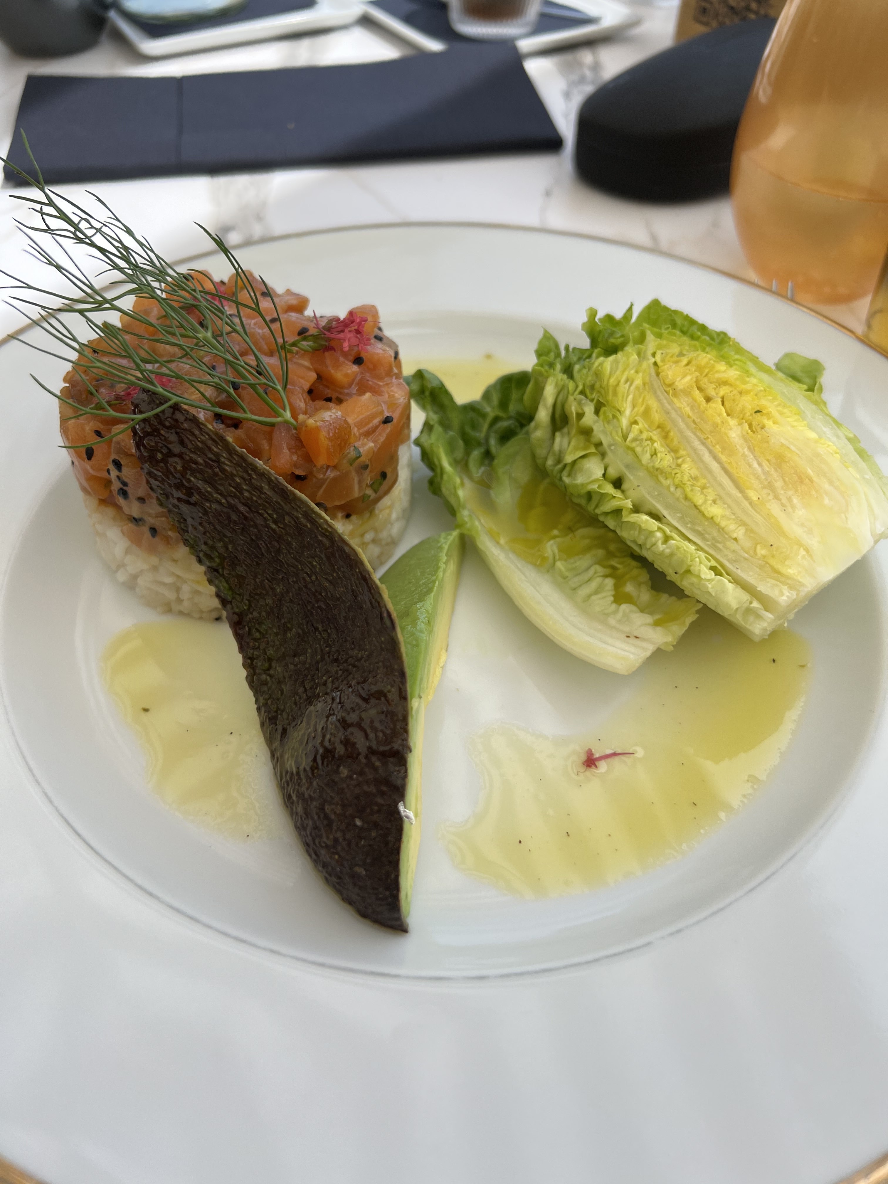 La meilleure salade César que j'ai jamais mangée ! Le poulet était tendre et le goût était parfait. Vinaigrette supplémentaire sur le côté. Malheureusement pas de photo. Le tartare de saumon était également excellent. Terminez avec deux délicieux gâteaux.