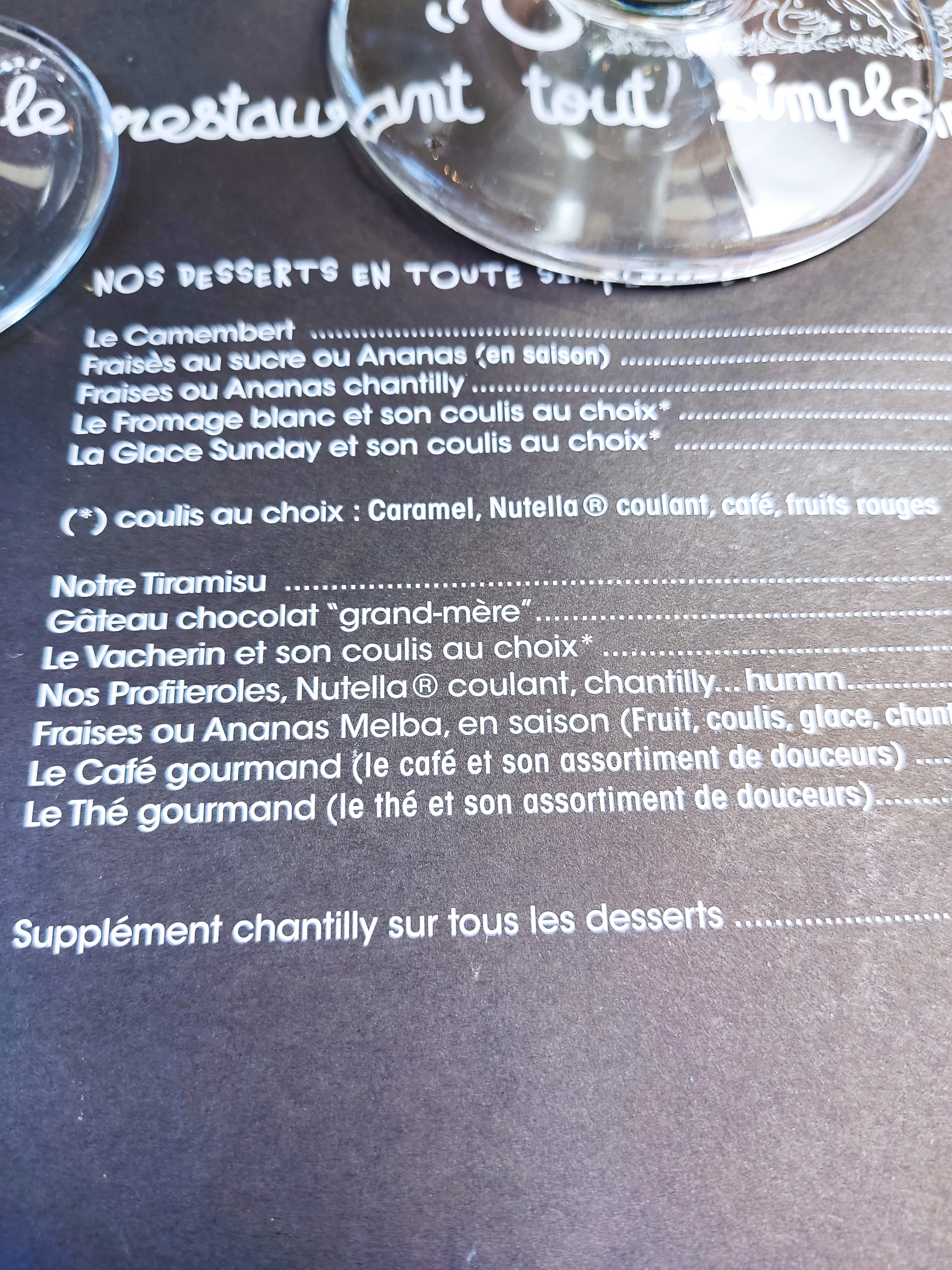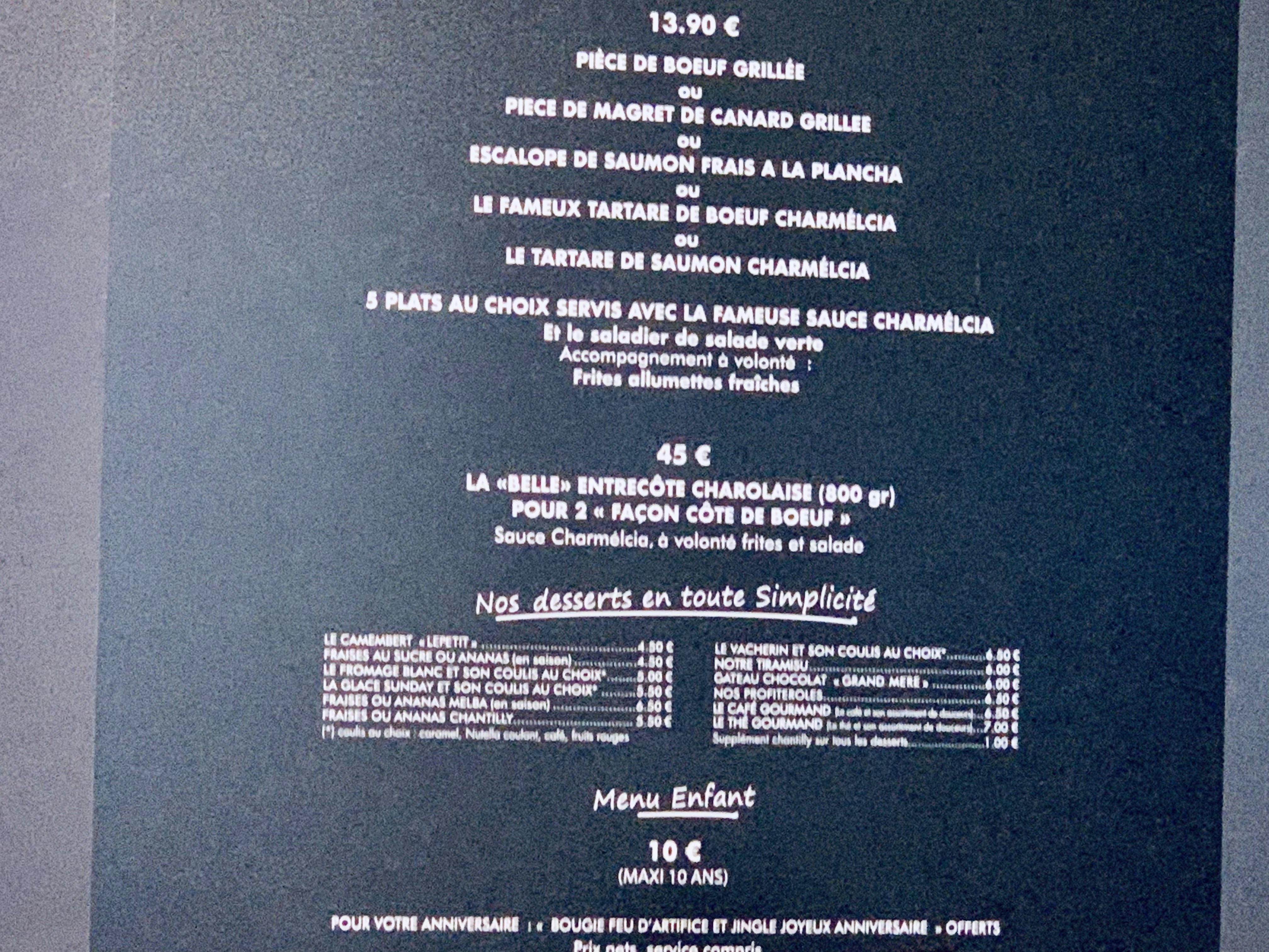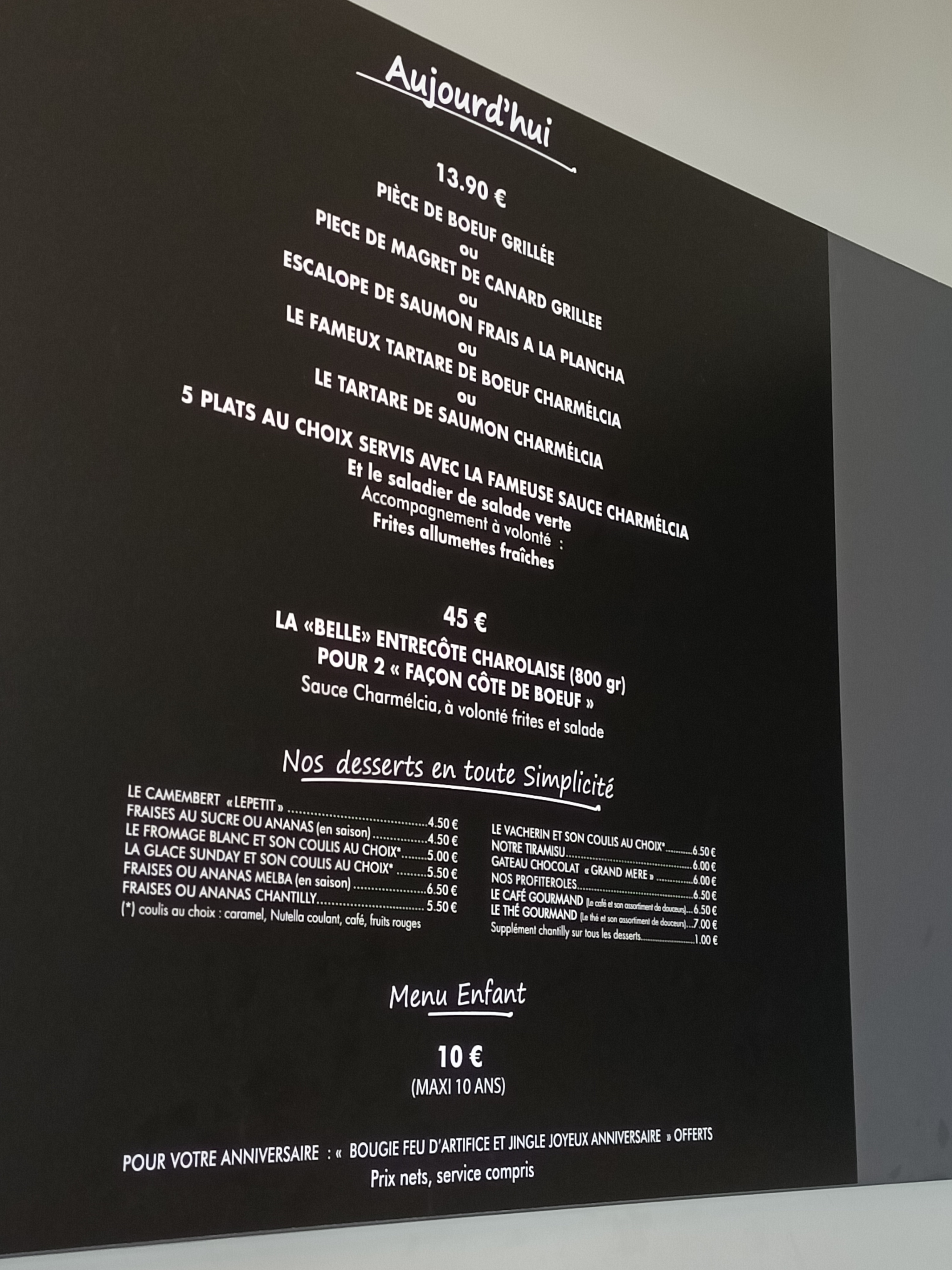 Carte au plus simple :5 plats et 6 desserts, il manque des entrées. Le plat est correct, la viande est bonne mais pas excellente mais rapport qualité/prix bof car le plat est cher pour ce que l'on a dans nos assiettes : un morceau de viande et un saladier de frite et de salade pour nous 4 !!! En plus il faut rajouter le dessert et les boissons même dans le menu enfant, pour un total qui reste cher. Il manque une volaille dans les plats. Leur sauce est pour tous les plats, tant pour la viande que le poisson et je n'ai pas arrivé à déterminer les saveurs. Par contre le café gourmand est excellent et bien garni. Nous avons bien mangé sans plus.