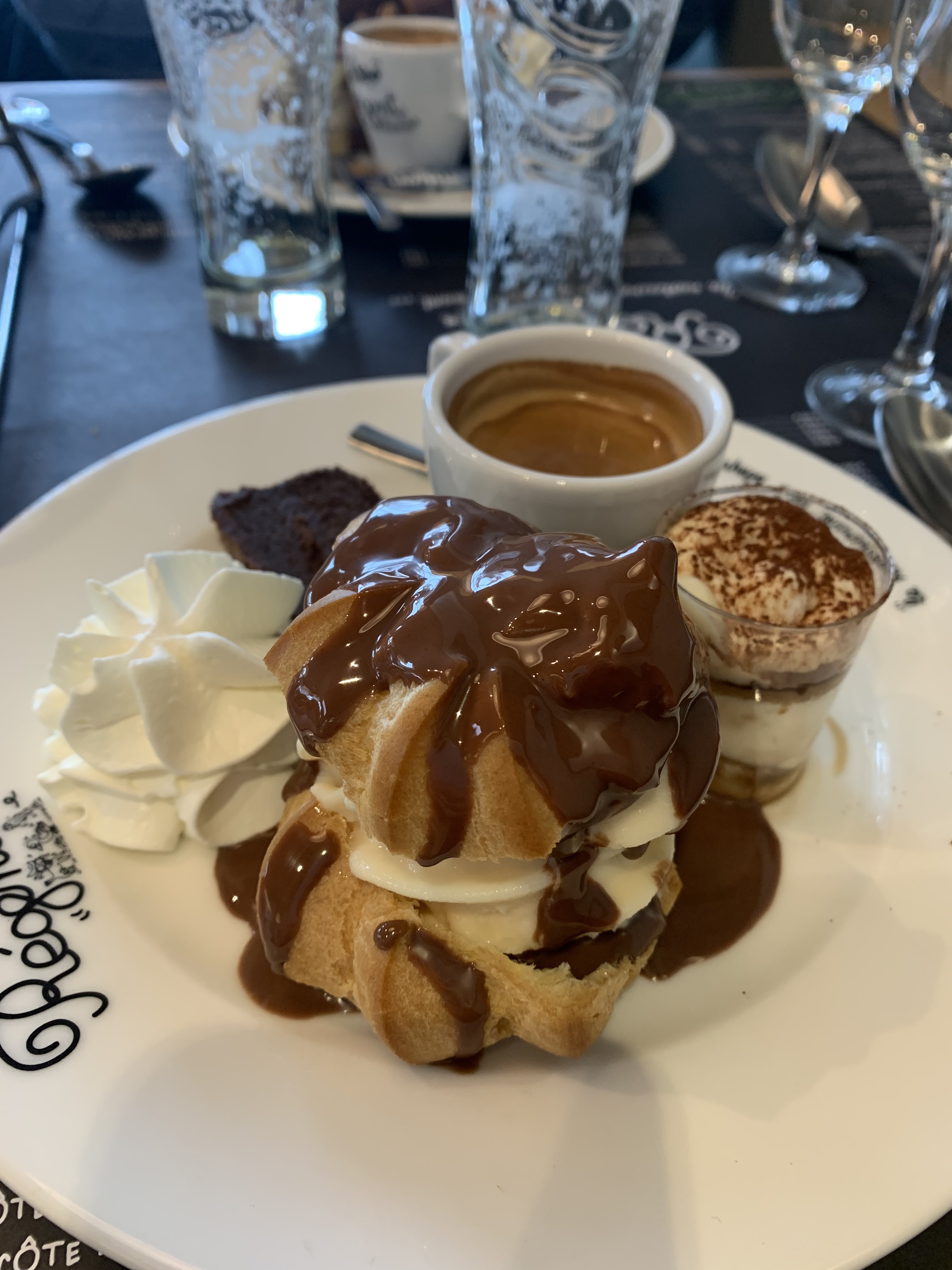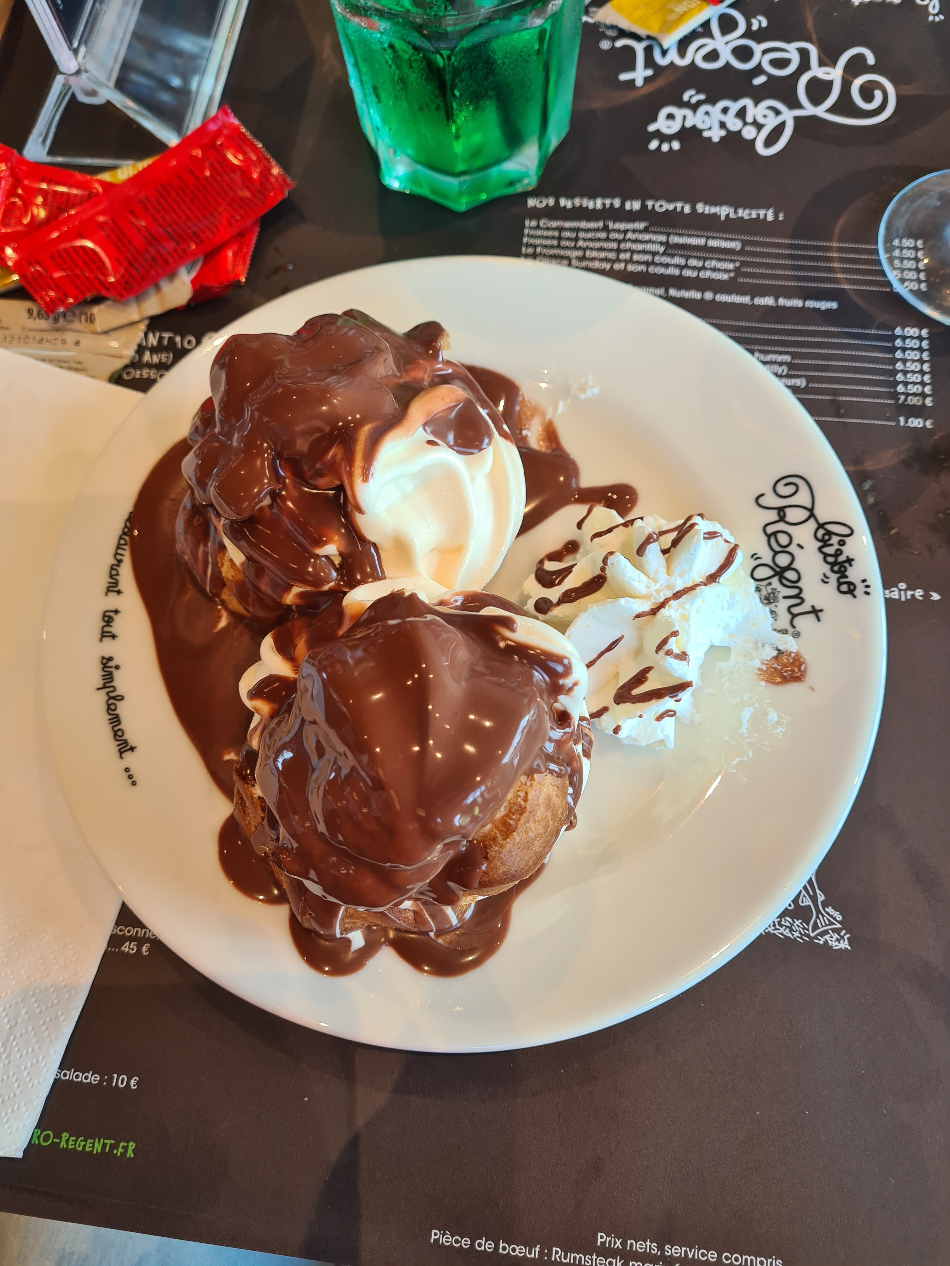 Profiteroles et glace de mauvaise qualité. Viande et frites bonnes. Sauce excellente
