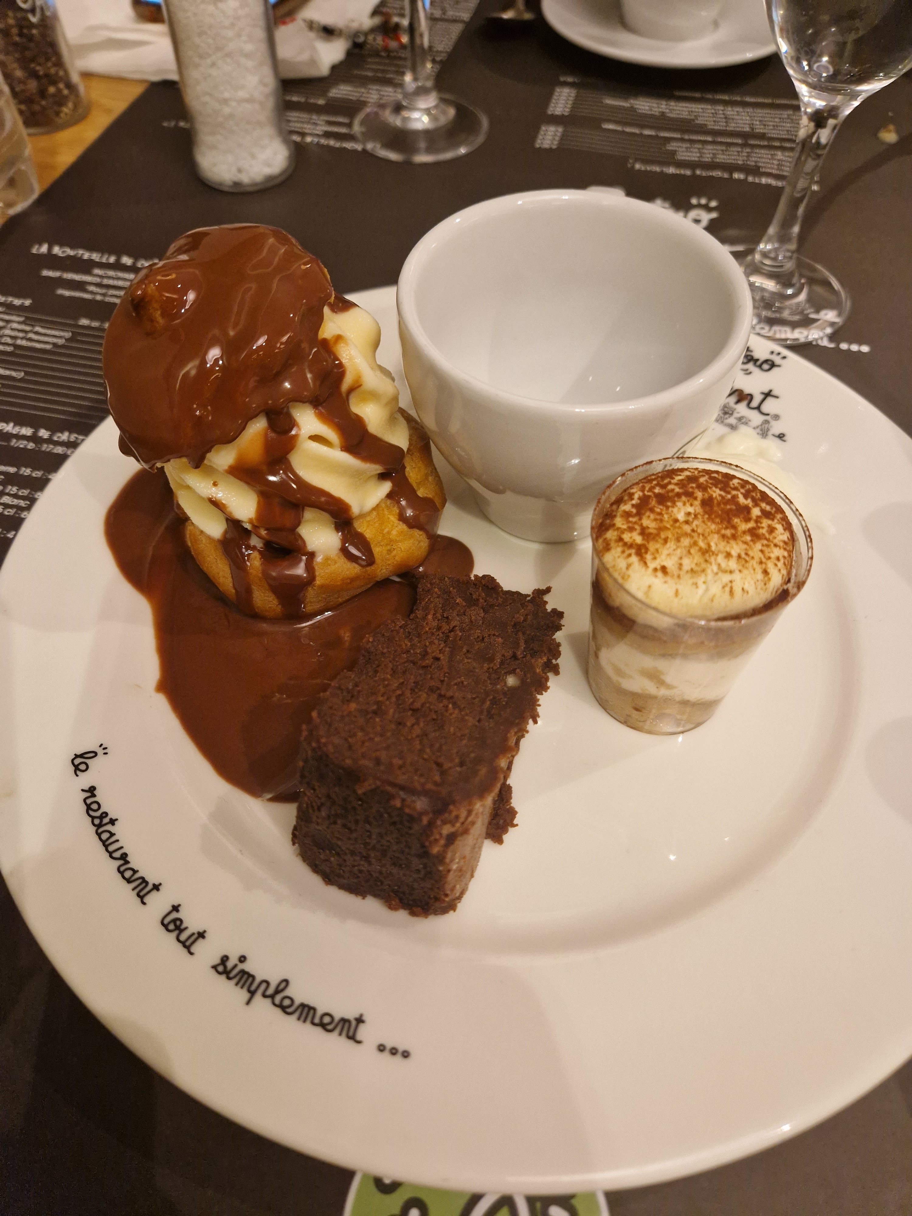 Après ma sortie au restau j’ai du prendre rdv chez le dentiste tellement les frites , si on peut appeler ça des frites, étaient dures. Concernant la salade, fade insipide et dépourvu de saveur hormis le goût de terre. Seul point positif la qualité de la viande et du saumon. Pour les desserts, le tiramisu ne casse pas trois pattes à un canard, une des rares fois où je ne le termine pas, non pas parce que j’avais trop mangé, juste parce qu’il est immangeable et le profiterole est juste mangeable sans plus.