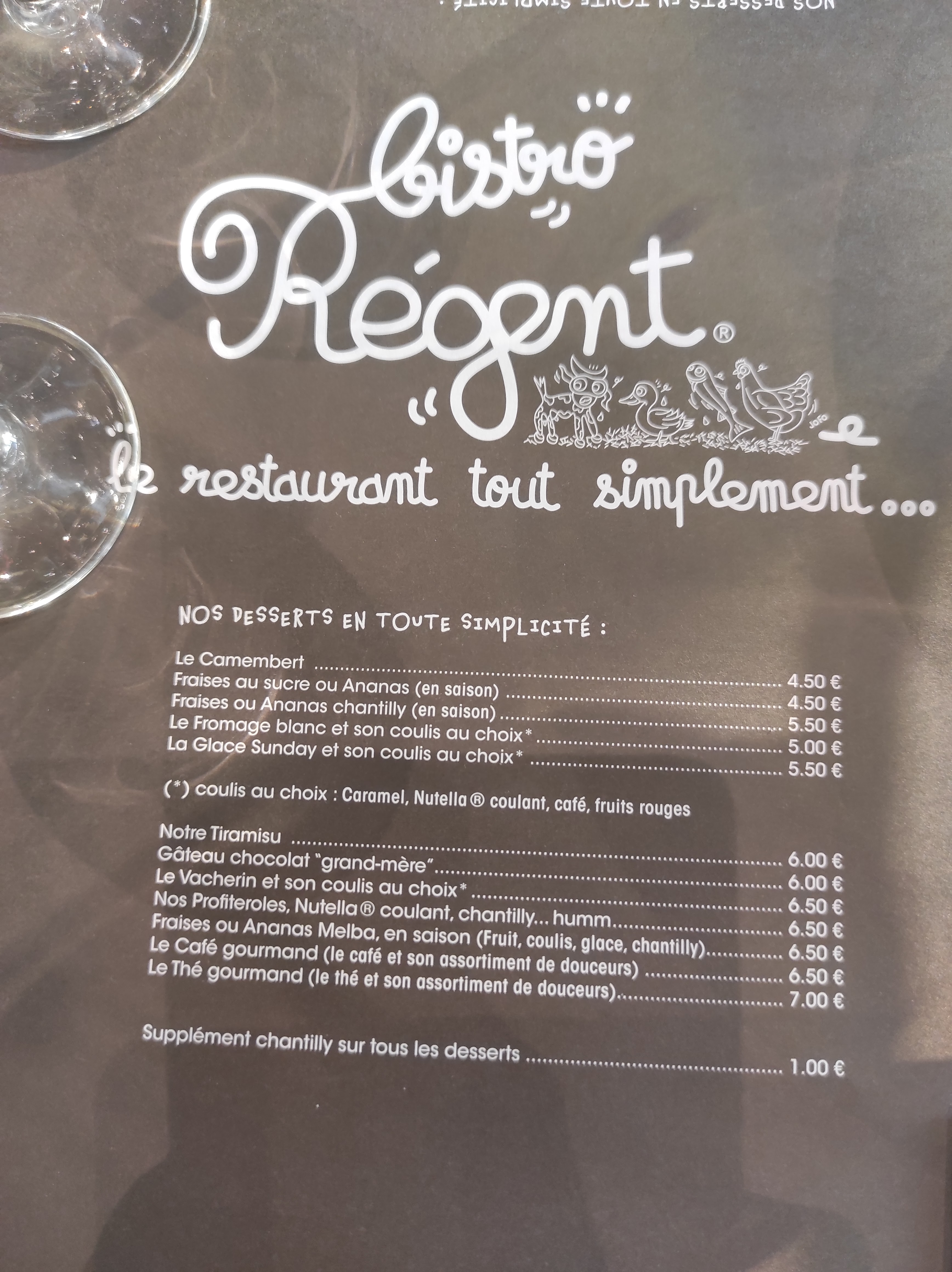 Avec mon mari nous décidons un midi d’aller déjeuner, nous décidons de découvrir le bistrot régent pour la première fois. Nous nous sommes régalés, le plat était très bon. Malheureusement nous avons été malade tous les 2 suite à ce repas. Moi étant enceinte de 9 mois nous avons eu très peur. Nous ne réitérerons pas.