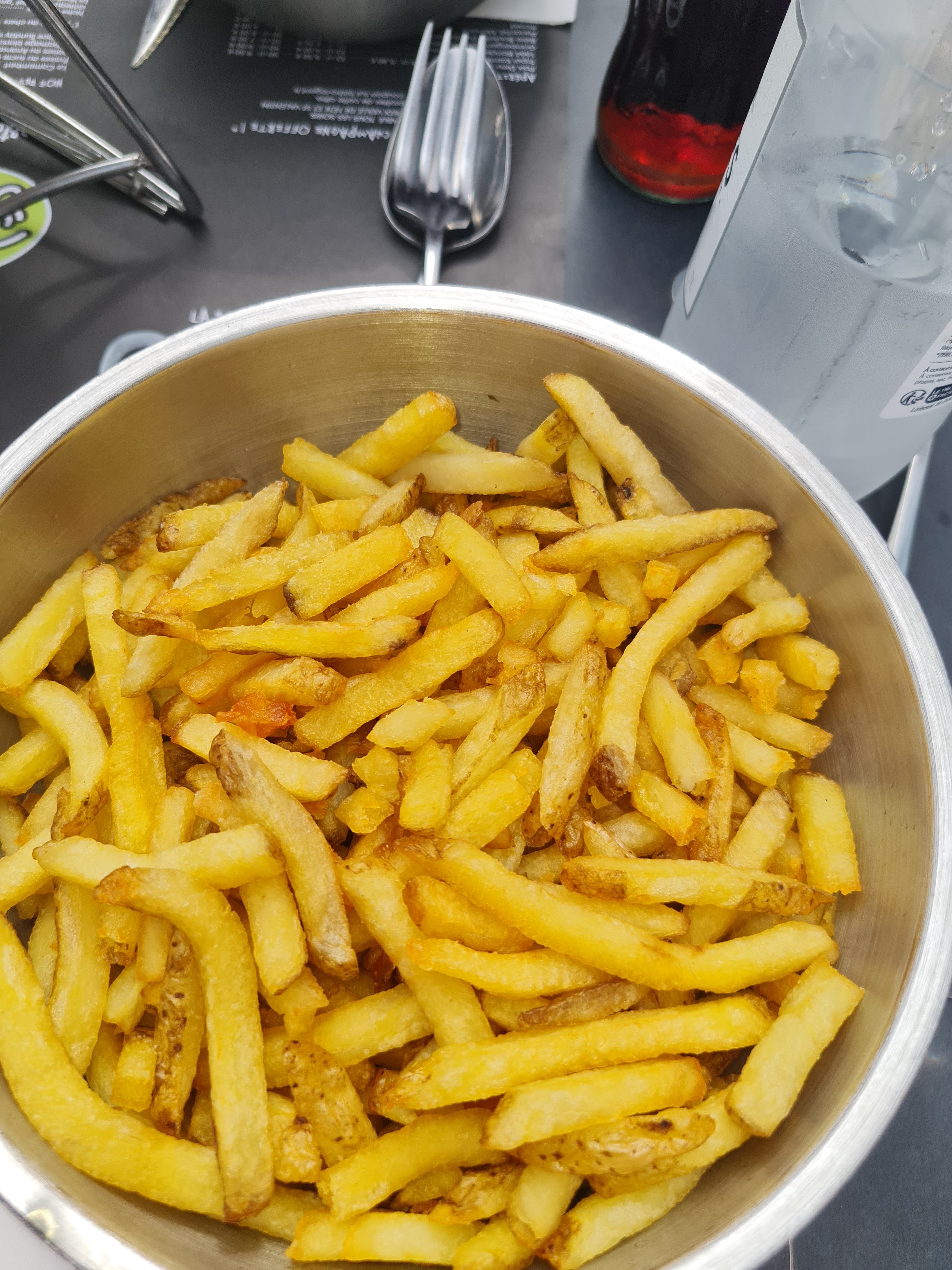 De bons plats avec des prix abordables 5 palts présents! Saladier de frites allumettes et de salade service à table Le prix des jus de fruit restent excessif 3.90 euros pr 20 cl