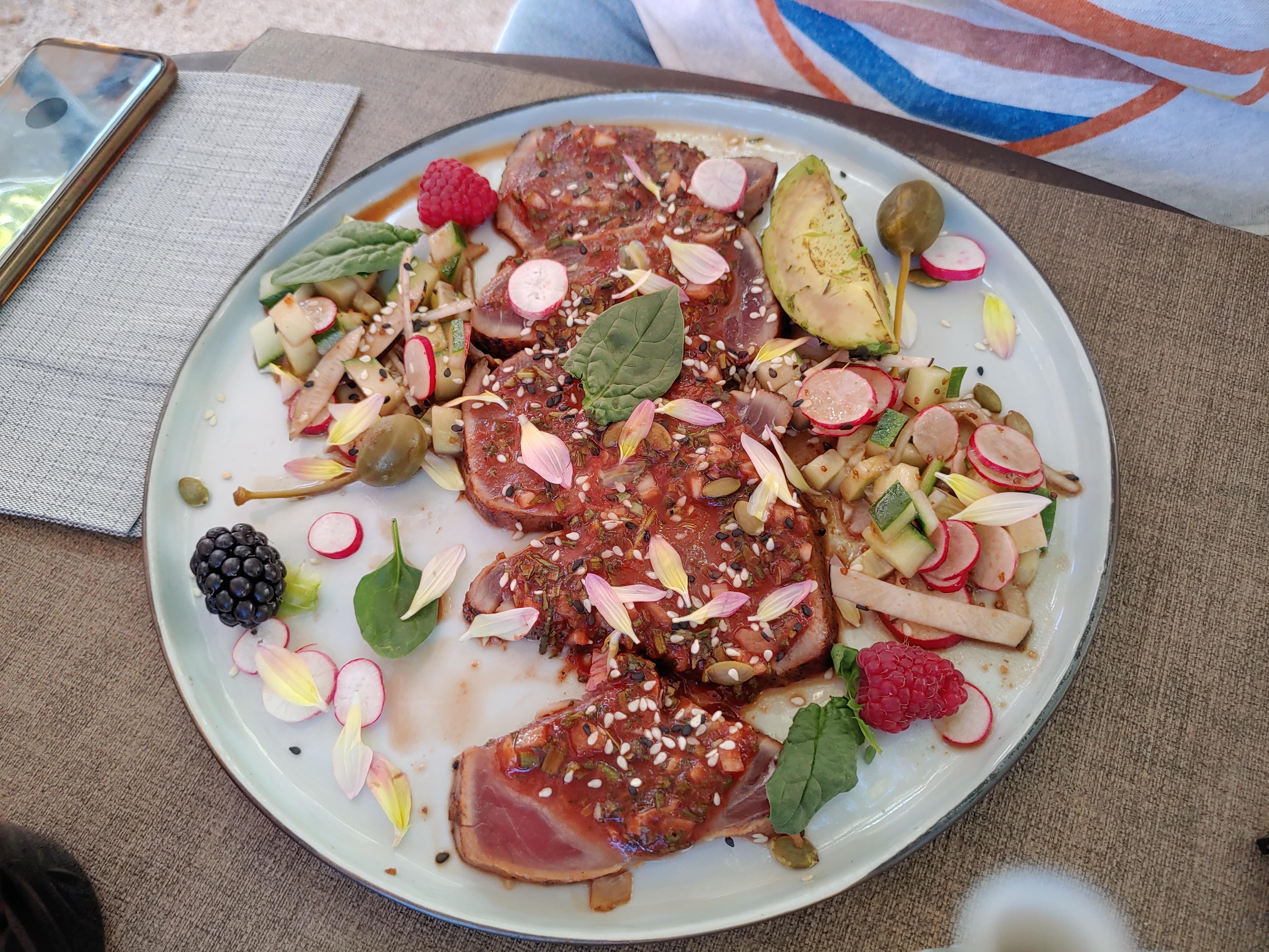 Grande terrasse et vue en hauteur de la vallée. Steak de thon très bien cuit. Personnel aimable et service efficace
