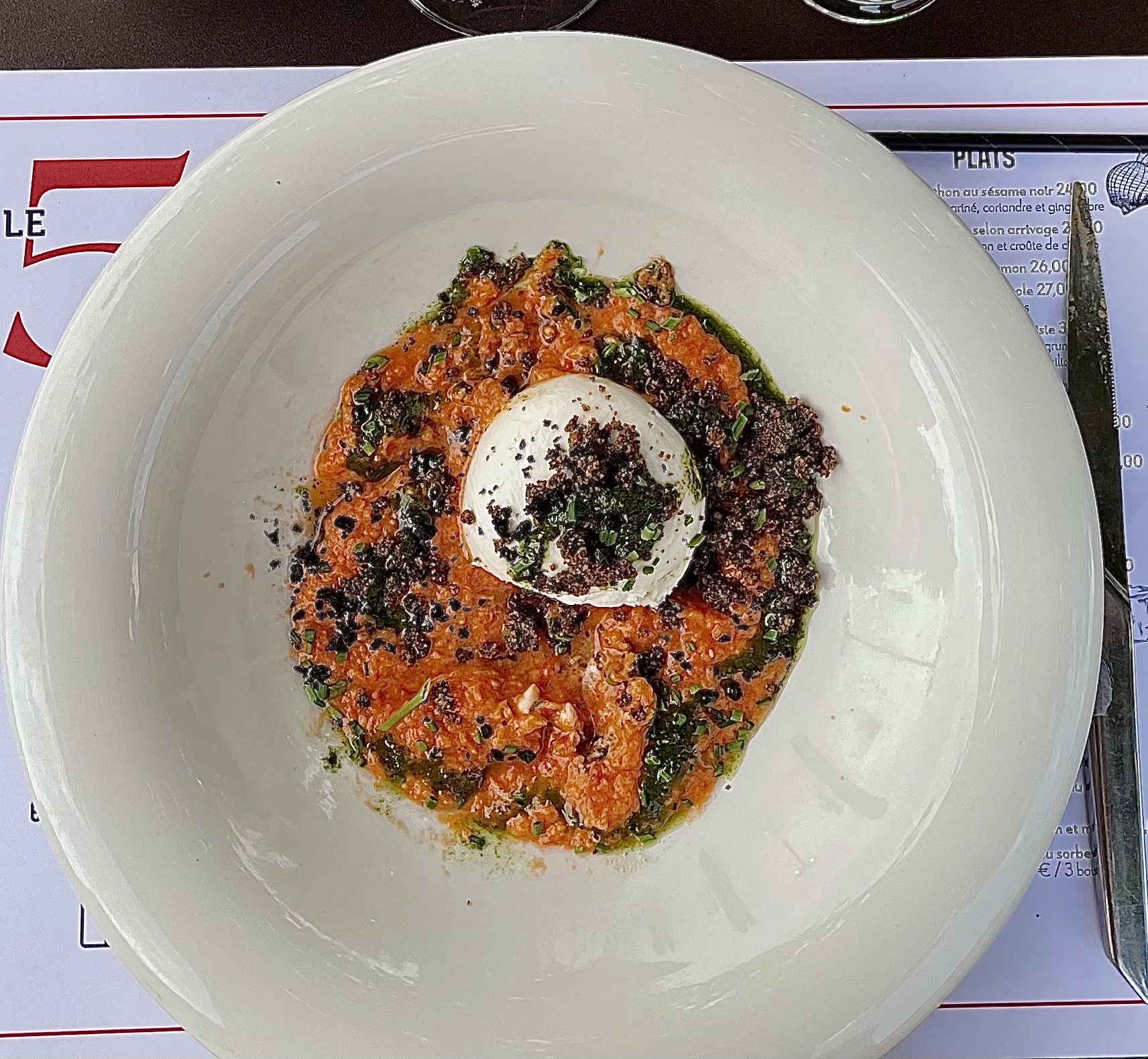 Dinner before sundown. A sunset colored meal. Infinite green views. Creamy Burata. Tomato caviar and black olive crumble. Steamed cod, sweet yellow pepper sauce, lightly seared chorizo and pan of chorizo on top, tapenade and green onions.accompanied by a light red wine from the Domaine de la Citadelle. A good one!!. Cod is mainly imported and paradoxically, it is one of the most consumed species by the French. Burata crémeuse. Caviar de tomates et crumble d’olives noires. Cabillot, sauce de poivrons jaunes et très doux, chorizo légèrement poêlé et chorizo pané dessus, tapenade d’olives et oignons verts. Tout accompagné d'un vin rouge, léger et velouté délicieux du Domaine de la Citadelle