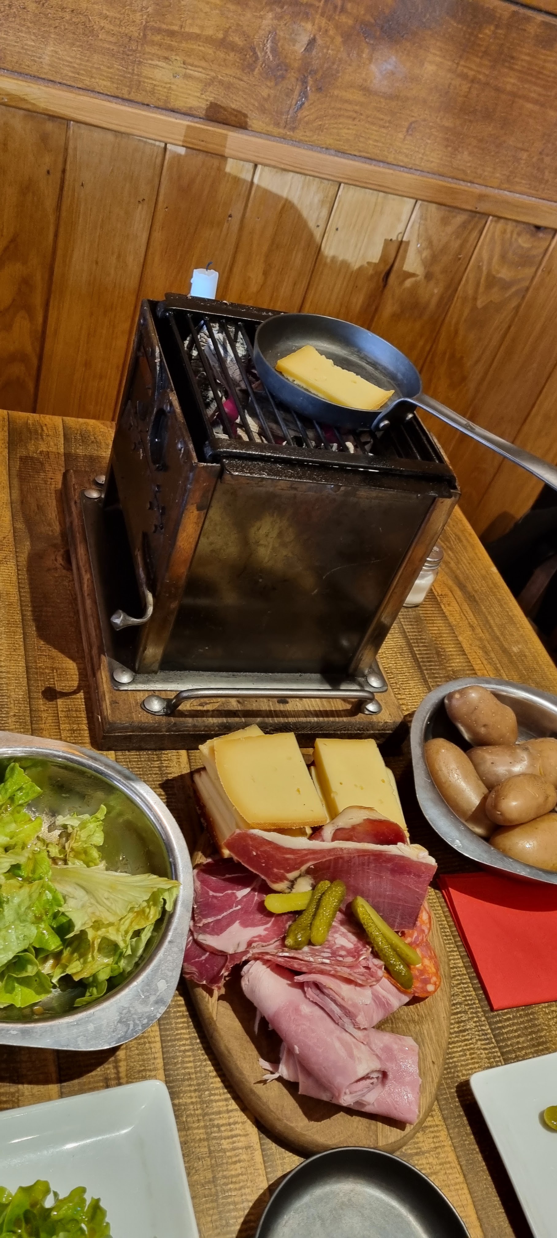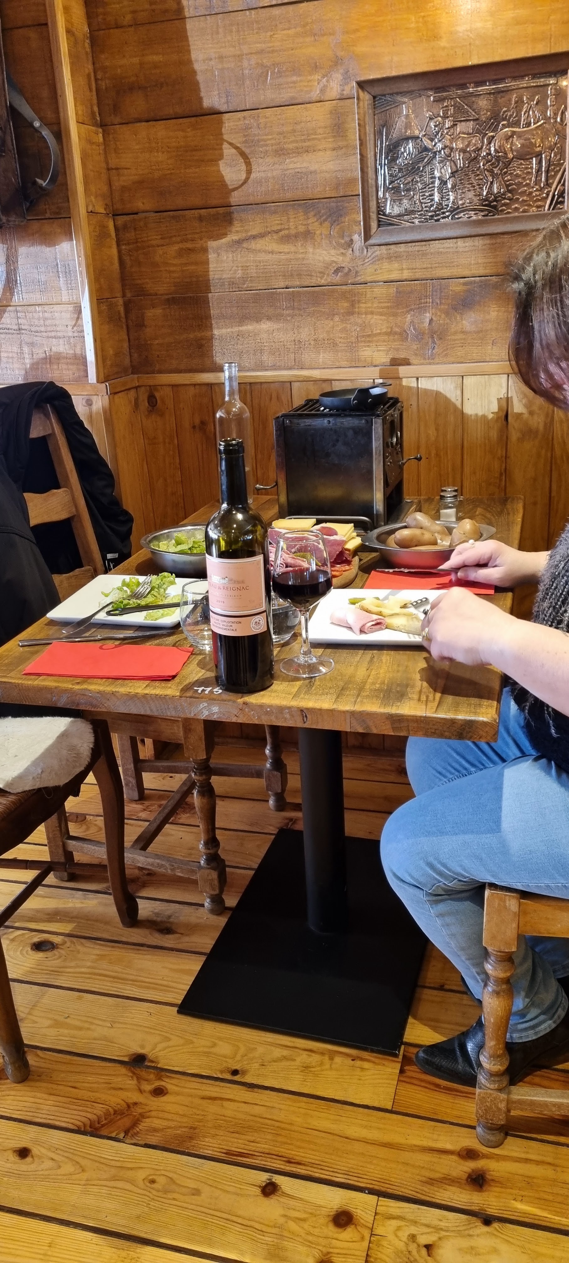 Très joli restaurant c'est certain. Prix correct, ambiance sympa et serveurs gentils (il manque tout de même de personnel pour le monde qu'il y à 2 serveurs débordés les pauvres) du coup service long. Les points négatifs : Je trouve ça inacceptable de servir des caquelon de service à raclette aussi abîmés aux clients à savoir que quand le Téflon s'effrite c'est très mauvais pour la santé, et en plus ça fait quand même sale, j'aurais aimé avoir de la charcuterie qui ne soit pas industrielle, fromage lambda industriel également, faible quantité et je ne suis pas une grosse mangeuse. Pas mauvais mais rien de spécial. il fait froid dans le restaurant beaucoup de personnes mangeaient avec leurs doudoune et écharpe je conçoit qu'il ne faut pas trop chauffer avec les brasero mais un minimum ne serait pas de refus. Quand au manque de respect des clients j'ai voulu aller aux WC j'ai fait demi tour. Complètement bouché, le soucis c'est que nous l'avons signalé et 1h après c'était toujours le cas. Quand bien même ils n'auraient pas le temps de faire ça maintenant il aurait été correct pour les clients et l'image du restaurant de condamner les WC le temps de trouver une solution surtout sachant qu'il y à 2 WC. Je ne regrette pas d'avoir essayé mais je n'y retournerai pas.