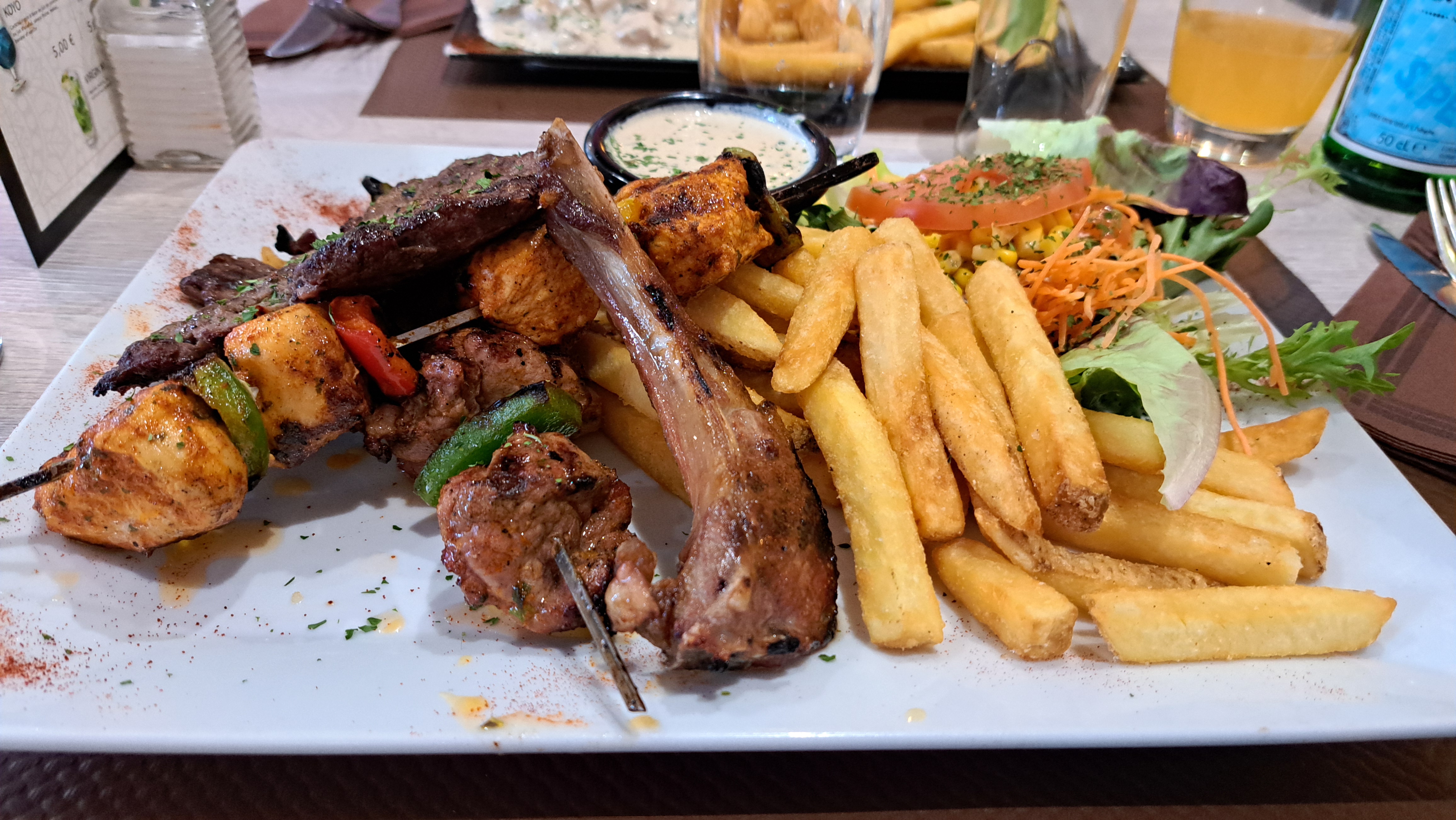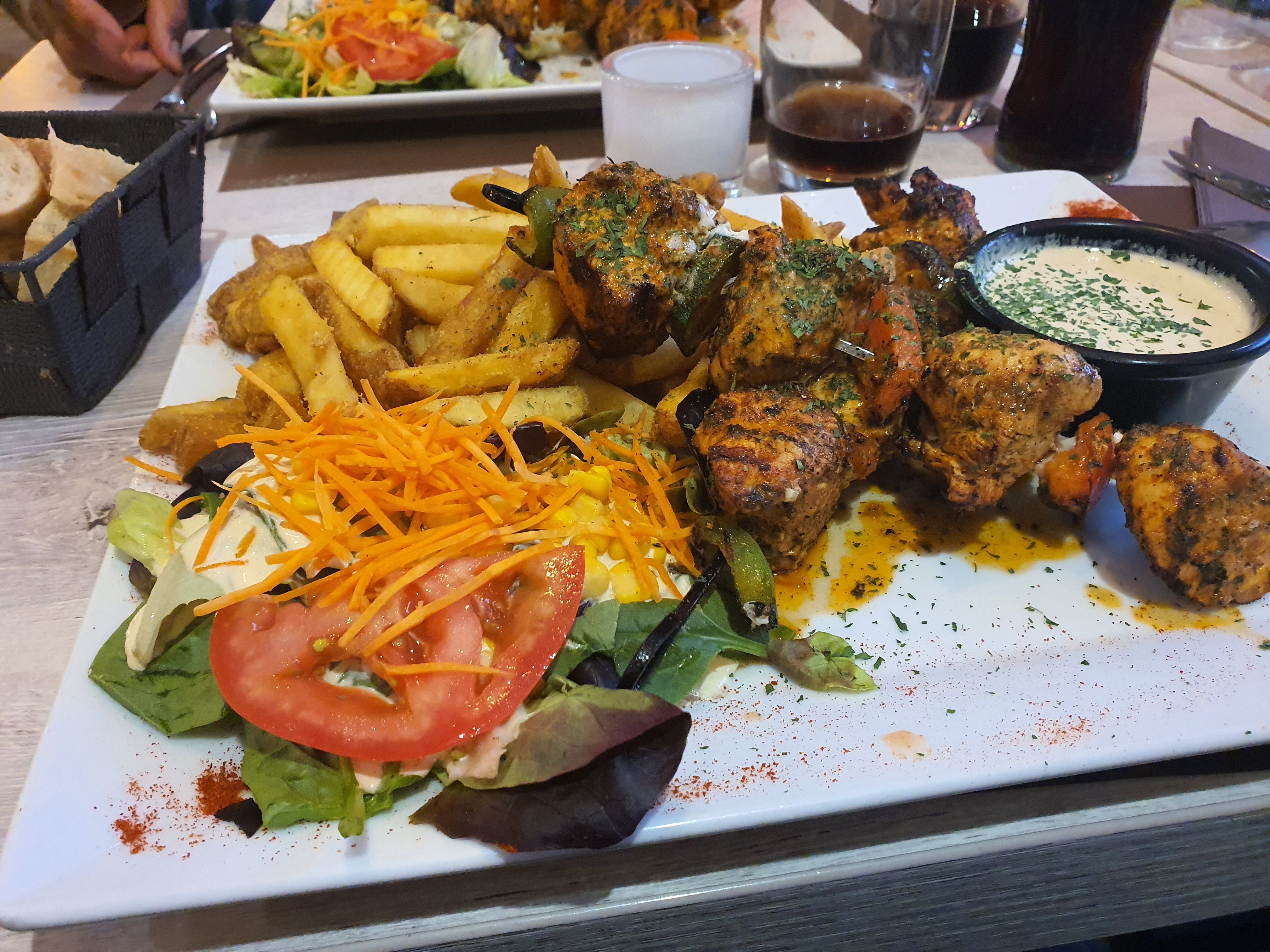 Endroit plutôt cosy, beau agencement. J’ai pris brochette de poulet frite et entrée. Les entrées dynamiques crevettes et dynamiques poulet une tuerie. La brochette de poulet est réalisée avec de gros morceaux de poulets, les frites sont un régal. À refaire sans problème