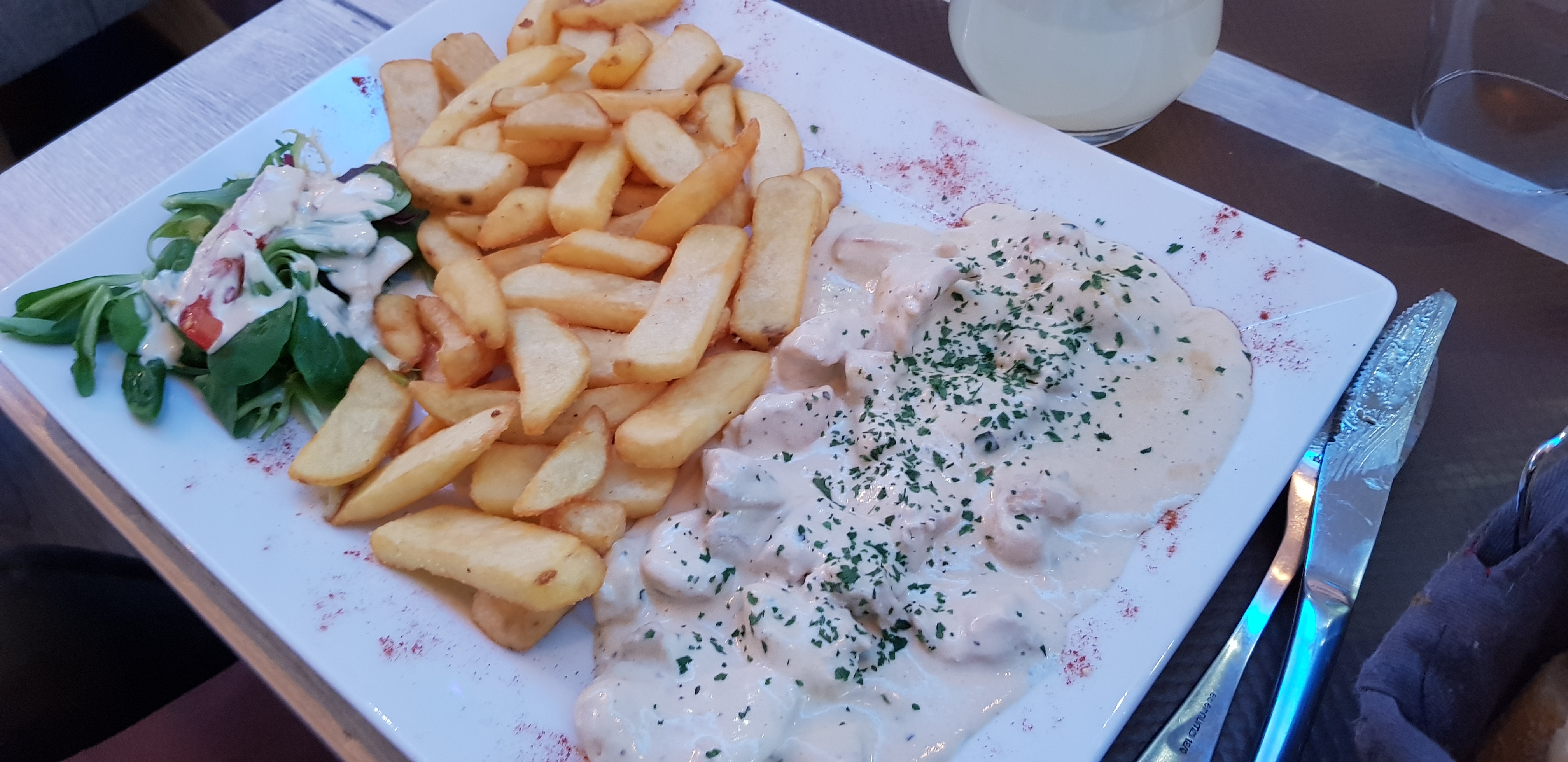 Coup de cœur à Colmar. J’ai commandé poulet forestier et mon amie la brochette de poulet. WoW belle présentation, repas goûteux juste assez rehaussé, les sauces onctueuses à base de vrai crème. Les accompagnement; soient les frites ou le riz étaient excellents. Le tout à prix doux, sous les 20€. Le service est efficace et amicale. Malgré un resto bondé, le serveur, toujours souriant, est venu nous voir a quelques reprises si tout allait bien. La décoration est chaleureuse, moderne et zen. Les tables sont espacées entre elles. Tout est parfait pour passer un bon repas en famille ou entre amis. Je recommande sans hésitation.