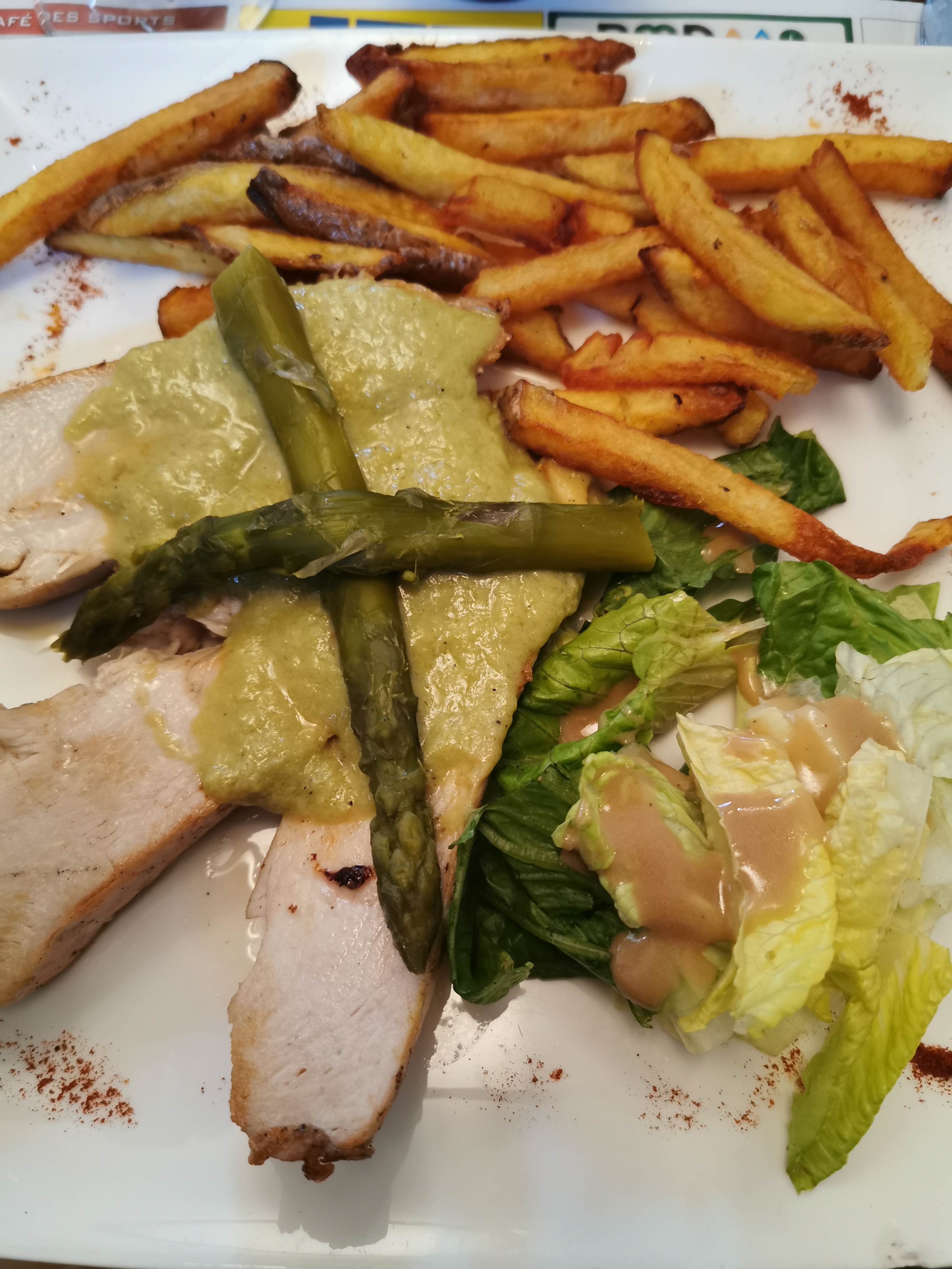 Un seul et même accompagnement proposé avec tous les plats de la carte : frite/salade. Aucun légume proposé sur la totalité de la carte! Moyen ... C'est dommage. Sinon les frites sont maison c'est bien. Et l’accueil correct.