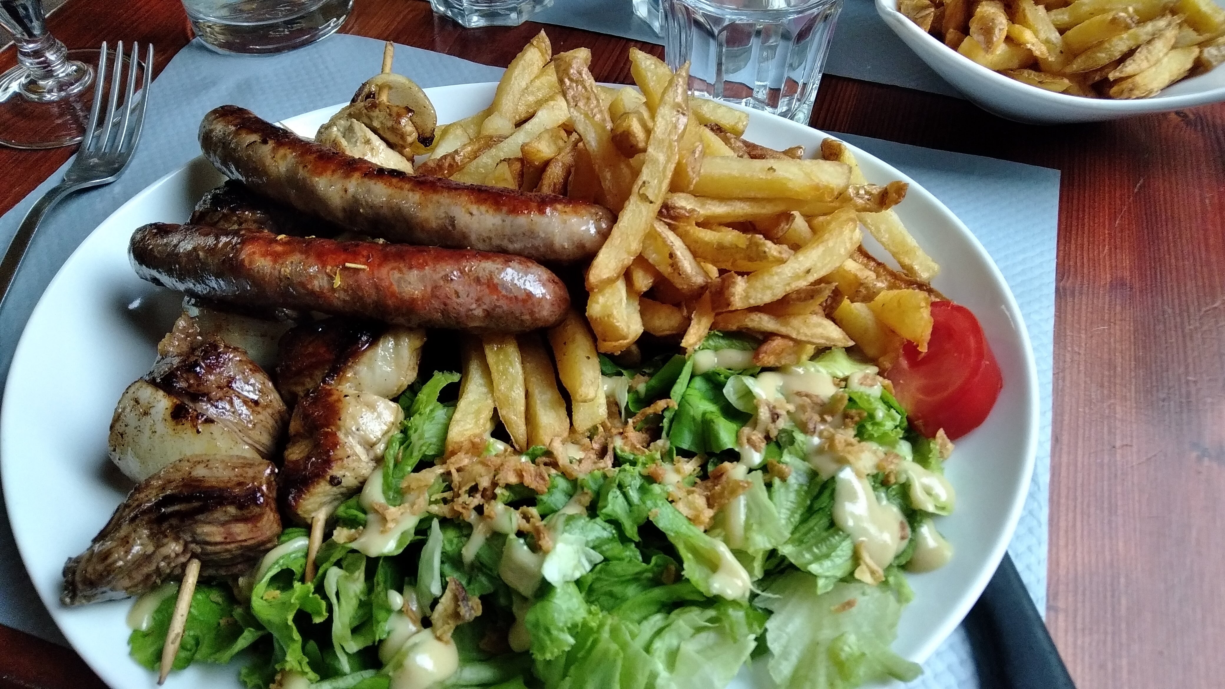 Assiette généreuse, petite place pleine de charme, frites faites maison et les nuggets sont de véritables morceaux de poulet 😁 J'ai passé un bon moment en famille avec un rapport qualité-prix excellent. J'allais oublier, les glaces sont artisanales.