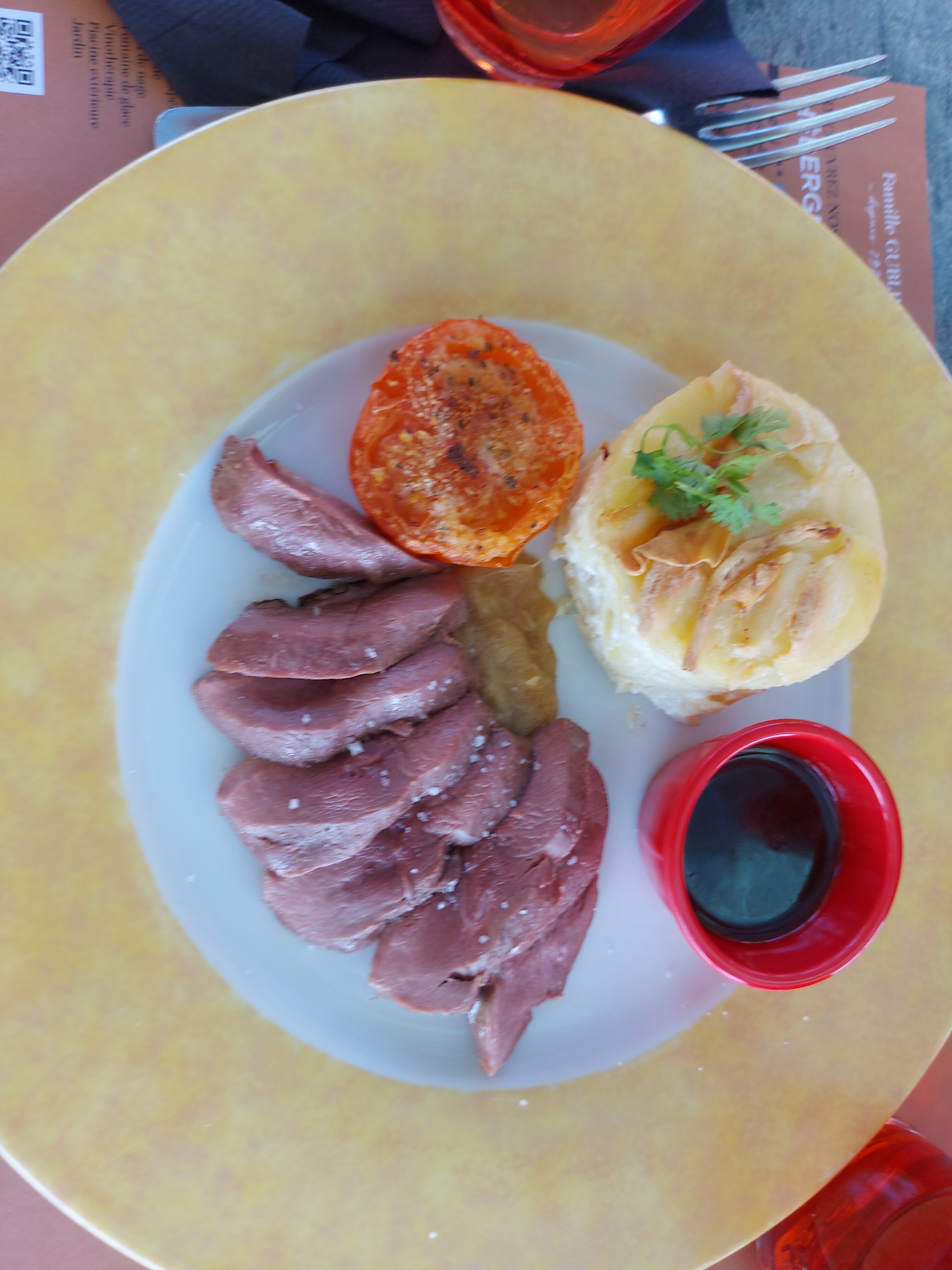 Cadre soigné et agréable. c'est l'annexe du meilleur hôtel-restaurant du village. Repas solo un soir en terrasse. j'ai commandé une pièce de boeuf grillée saignante ainsi qu'un verre de bordeaux. le boeuf m' a été servi découpé en lamelle ce qui est une erreur sur une terrasse car il y a toujours un léger courant d'air pour refroidir la grillade. Une fois la viande servie, j'ai réclamé par DEUX FOIS à la serveuse qu'elle me serve mon verre de vin, j'ai été servi une fois ma viande terminée et j'ai refusé sans problème ce verre de vin. Cette attitude dans l'annexe dénote avec les réels efforts effectués par les patrons dans leur établissement principal.