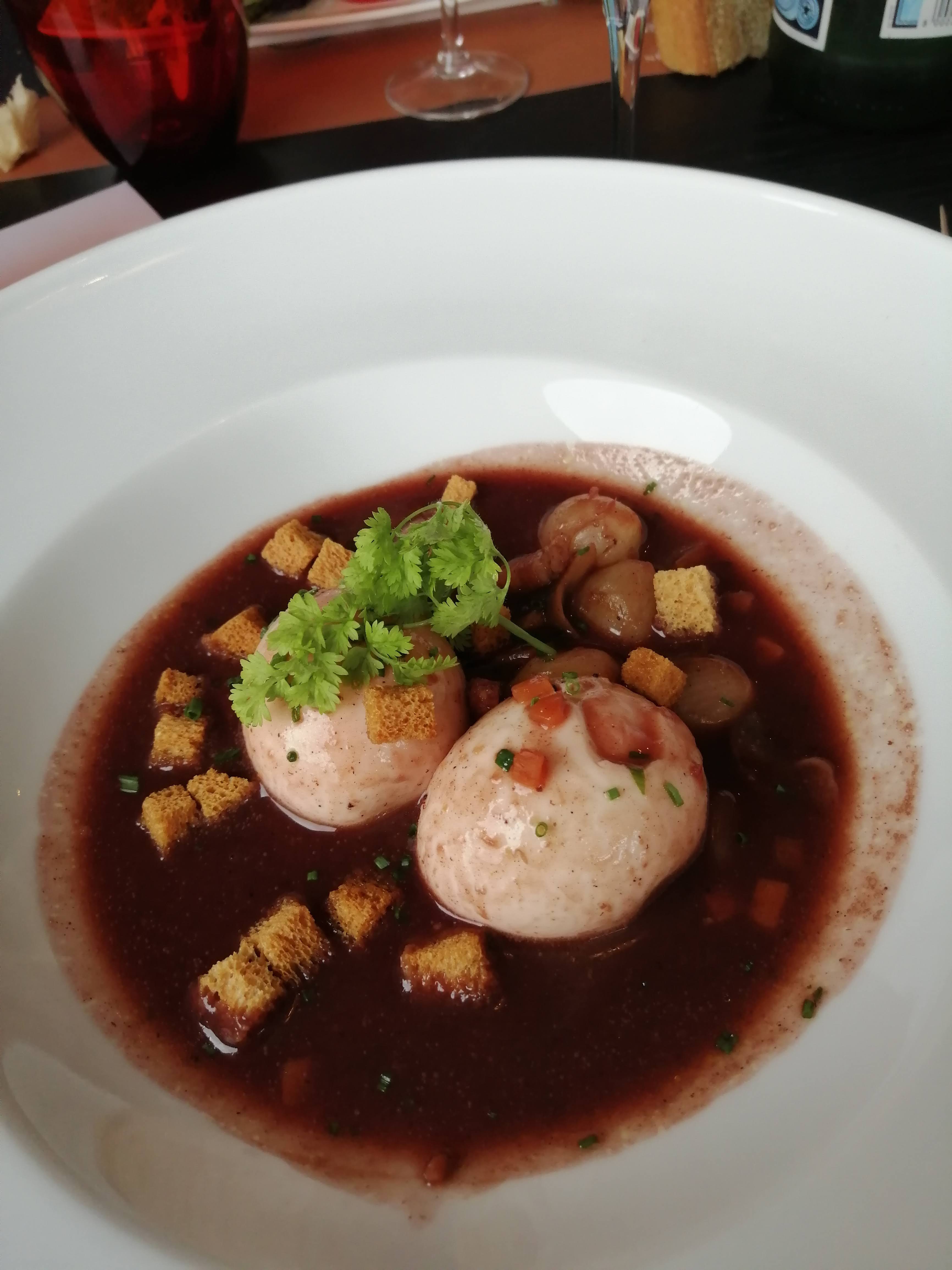 Acceuil chaleureux, entrée soupe à l oignon gratinée et la cassolette de foie gras œufs et girolles un délice et la brochette de volaille et ses frites excellente et copieuse.