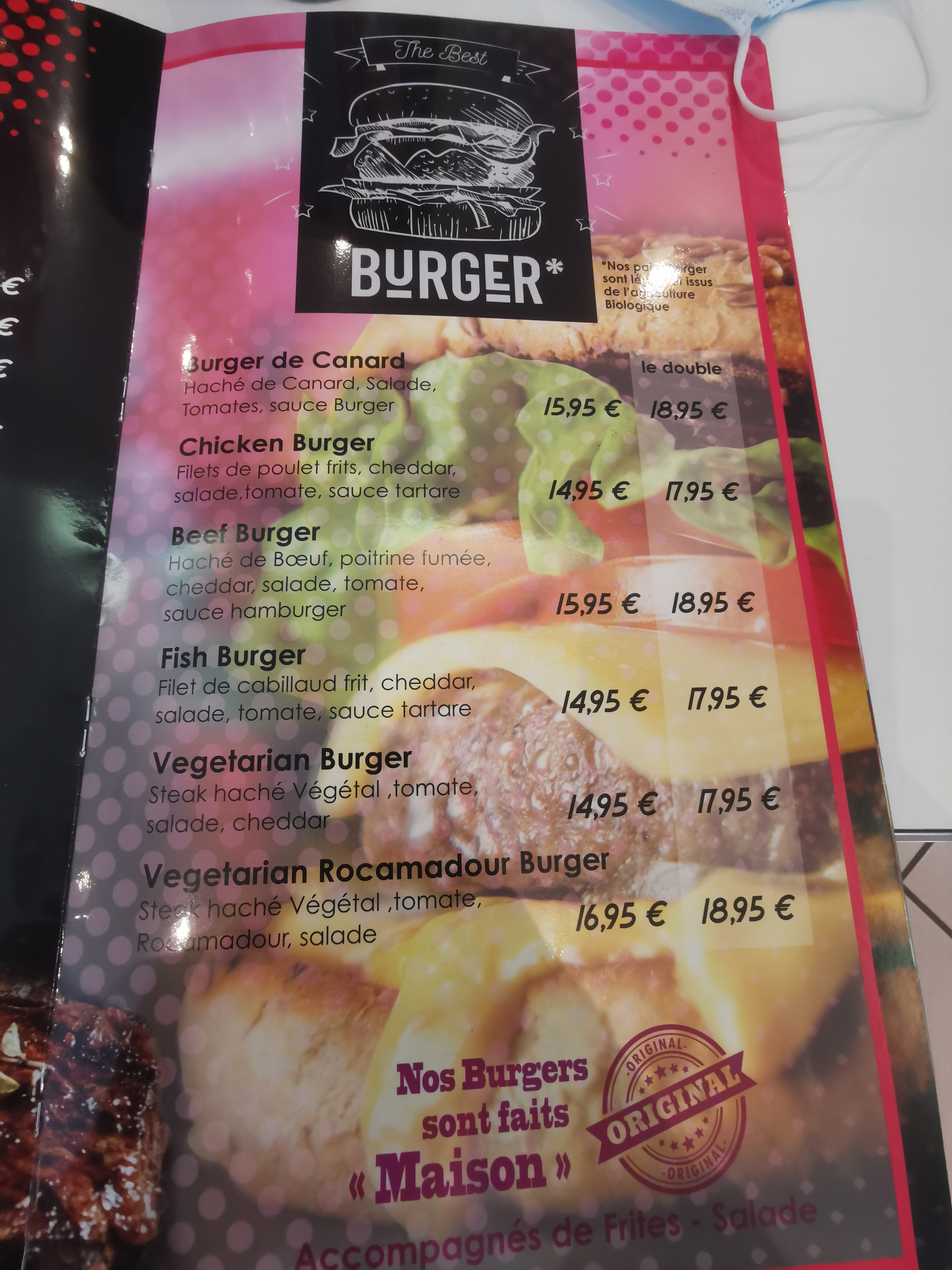 Bonjour, le Burger étais froid, ça n’a pas enlevé le fait qu’il étais bon, les frites peu chaude, mise a part ça, ça reste bon , mais ne vaut pas un tel prix