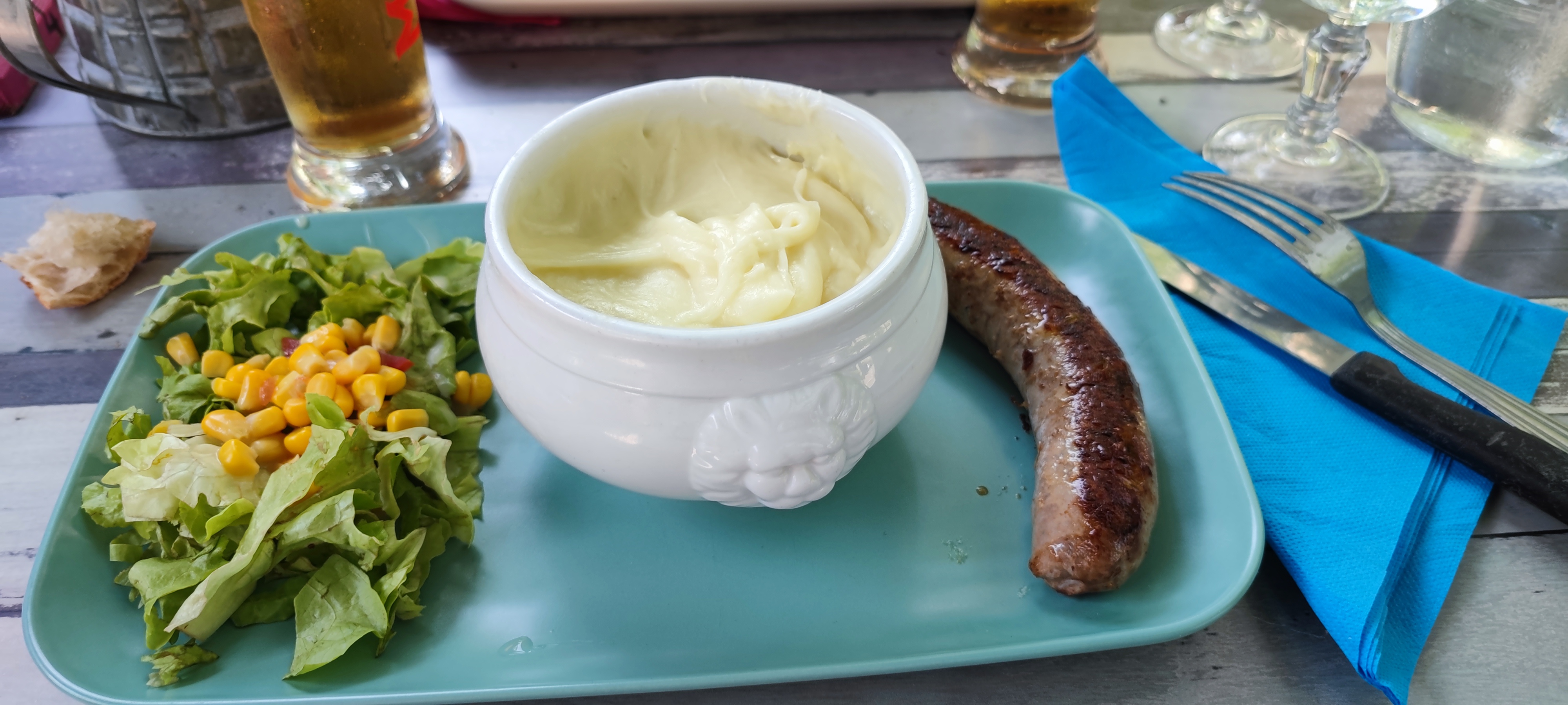 Beaucoup trop de serveuses qui s occupent de tout et au final de rien désolé malgres le sourire d une en particulier. Une aligot qui ne file pas avec de la purée en poudre surement très fade et du râpé à mon sens une salade et des dés de tomate et maïs qui n a rien à faire dans assiette chaude vu l état de la salade à l arrivée. Un moucheron dans ma purée..... une mousse au chocolat malheureusement très mal mélangée vu les blanc d œuf dans le ramequin de plus des zestes d orange dedans non precisés sur la carte peu être un réel danger pour des allergiques aux agrumes. Un désagrément d éclairage en terrasse qui a duré longtemps. Alors oui c est l été mais attention aux prix et aux appellations merci pour nous et désolé de tous ses détails mais je suis moi même professionnel de la restauration. Et je sais ce que c est .