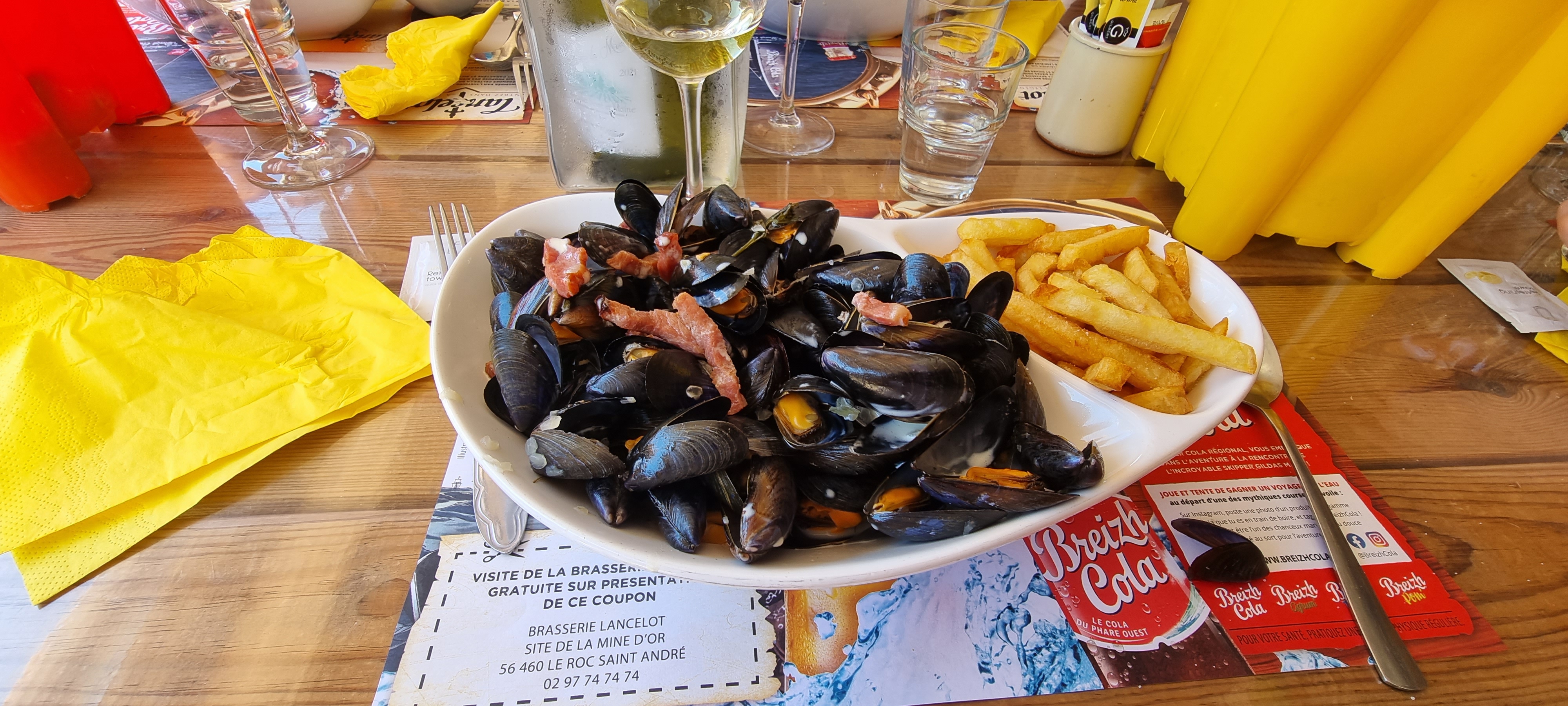 Succulentes moules à la crème avec lardons. Bonne ambiance.