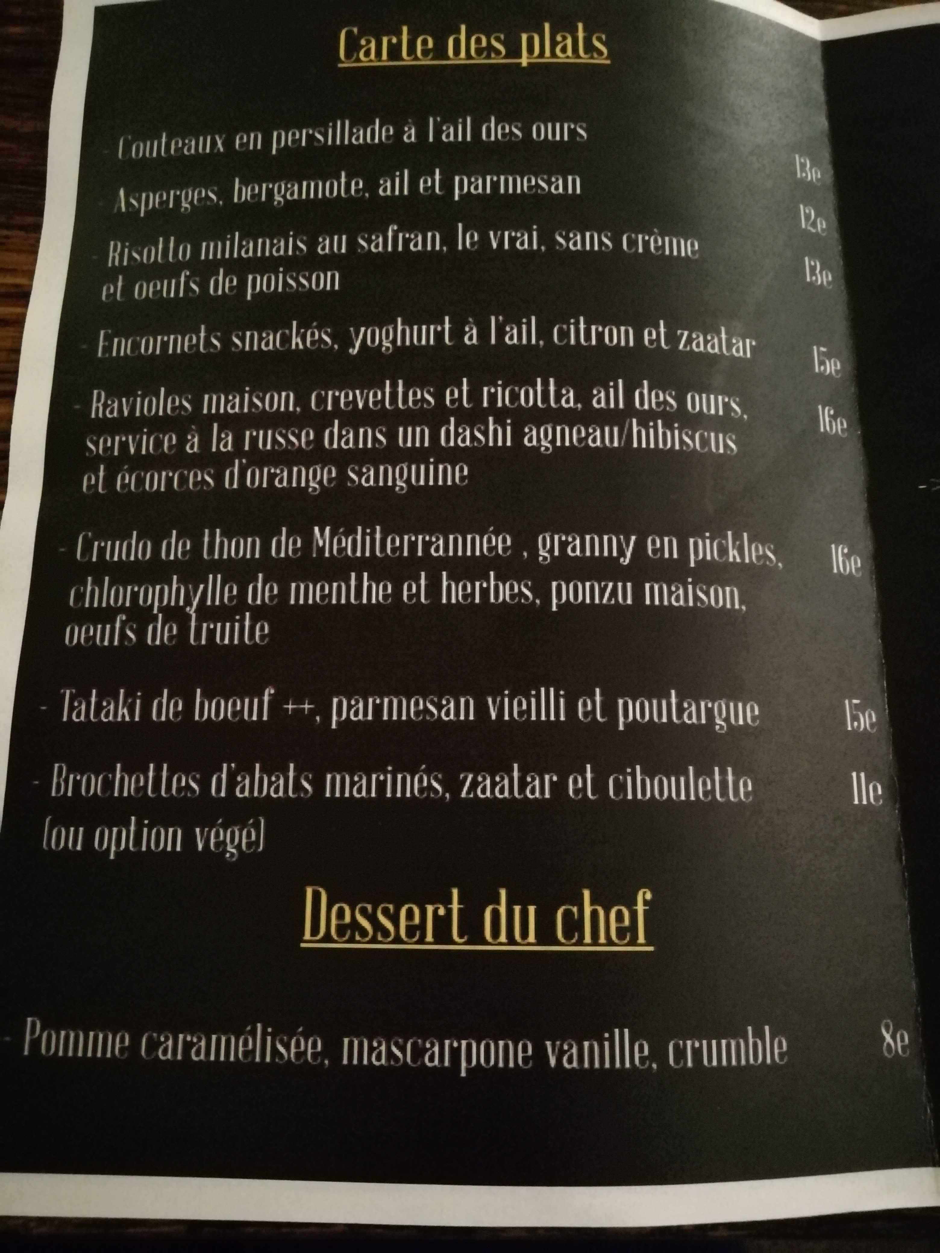 Nous avons testé la nouvelle carte, nous avons pris tous les plats proposés ( nous étions 5 et cela correspondait à leur système de menu :2 plats au choix et 1 dessert au choix 35€) Chaque plat était savoureux. Le vin est abordable et très bon. Clément le serveur est très sympathique et prévenant, le chef est super