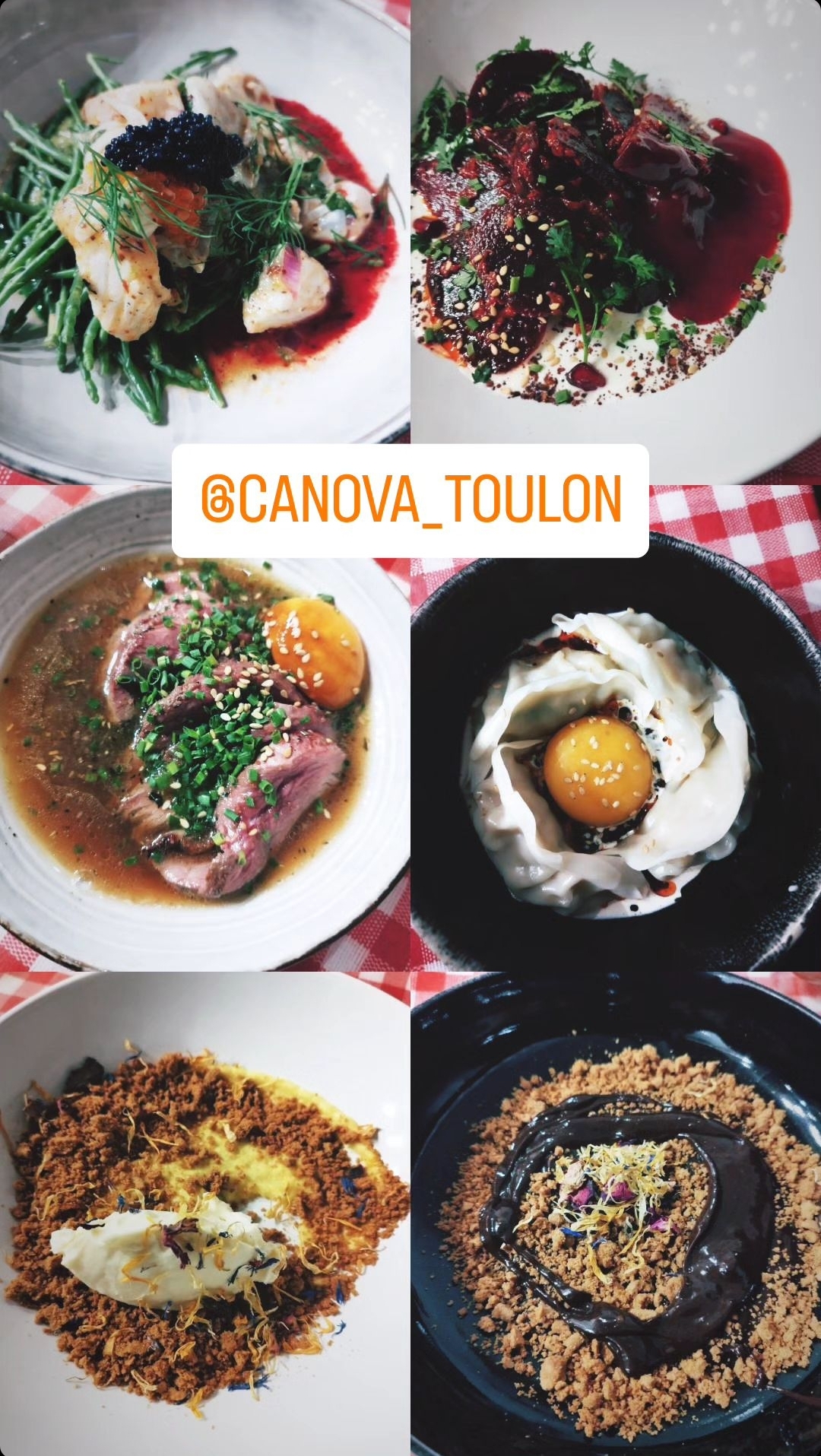 Quelle belle soirée passée dans cette petite rue toulonnaise où est niché Canova! Le chef travaille seul en cuisine et propose une cuisine inventive et audacieuse présentée sous forme de mezzes avec un menu composé de deux assiettes et un dessert qui suivent le fil des saisons, tous plus étonnants et réussis les uns que les autres. Une merveille!