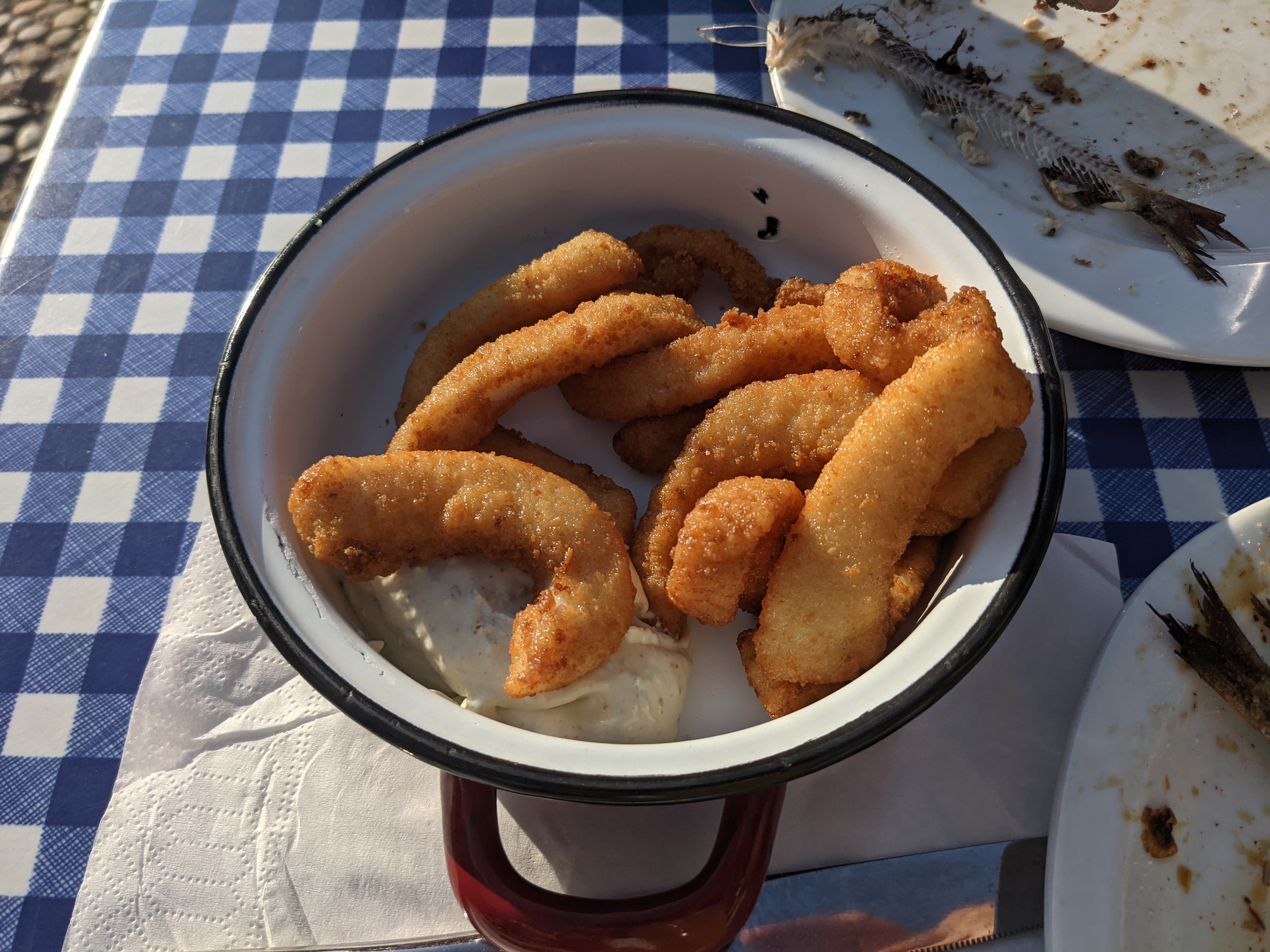 Arrivés peu après 19h, la terrasse juste au bord du quai était pleine (si vous tenez à manger au bord de l'eau, réservez ou venez plus tôt). La terrasse accolée au resto était tout aussi bien. Les poissons étaient bons mais les parts un peu trop légères (cf. les chipirons en photo). Toutefois, on sentait la qualité et la fraîcheur des produits. La sangria était bien comme il faut.