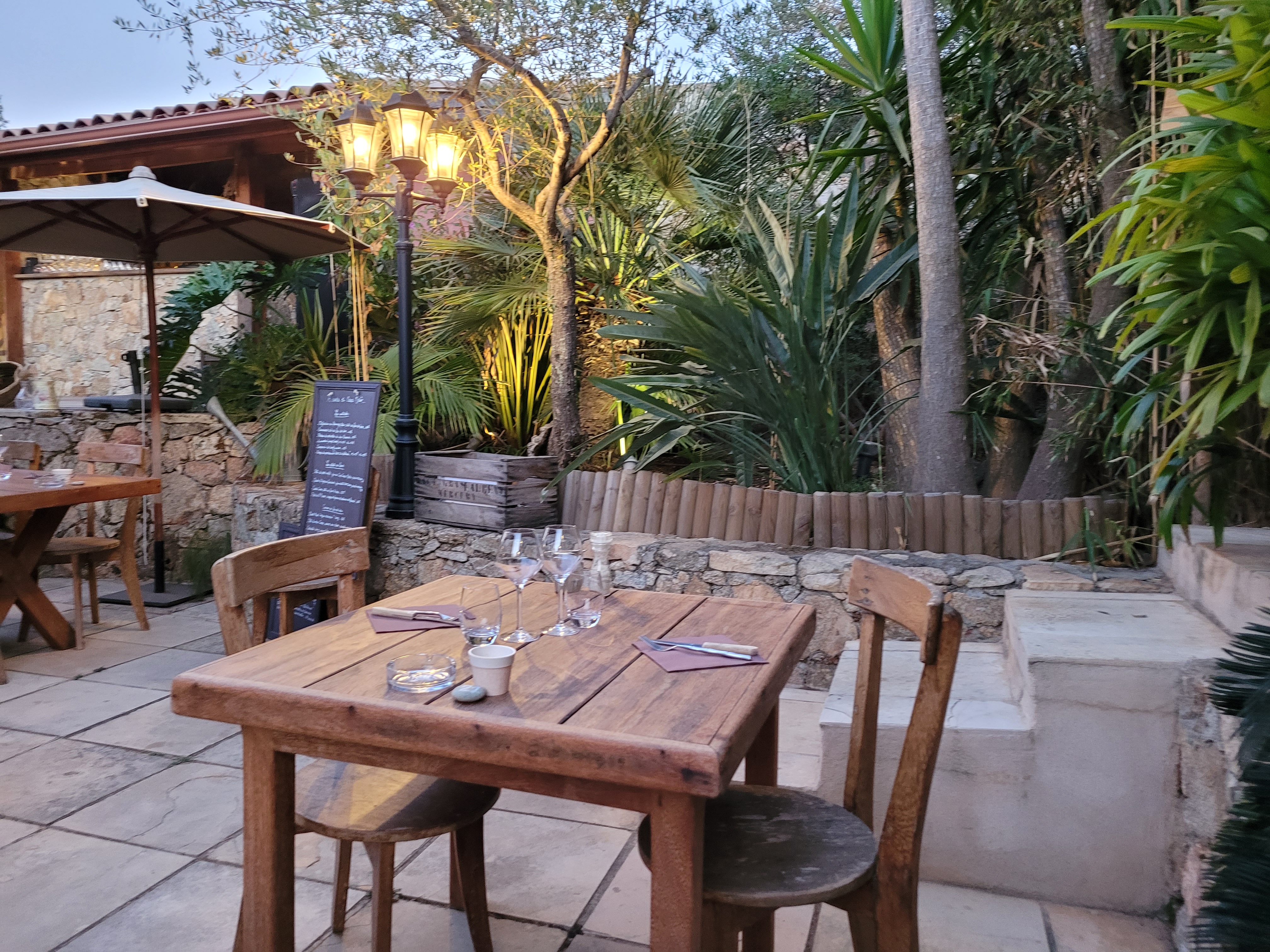 Accueil sympathique très joli jardin ombragé fauteuils canapés à disposition très jolie décoration. Très bons produits. Le porc confit au miel et aromates est un délice. Merci de nous faire découvrir les produits Corse.