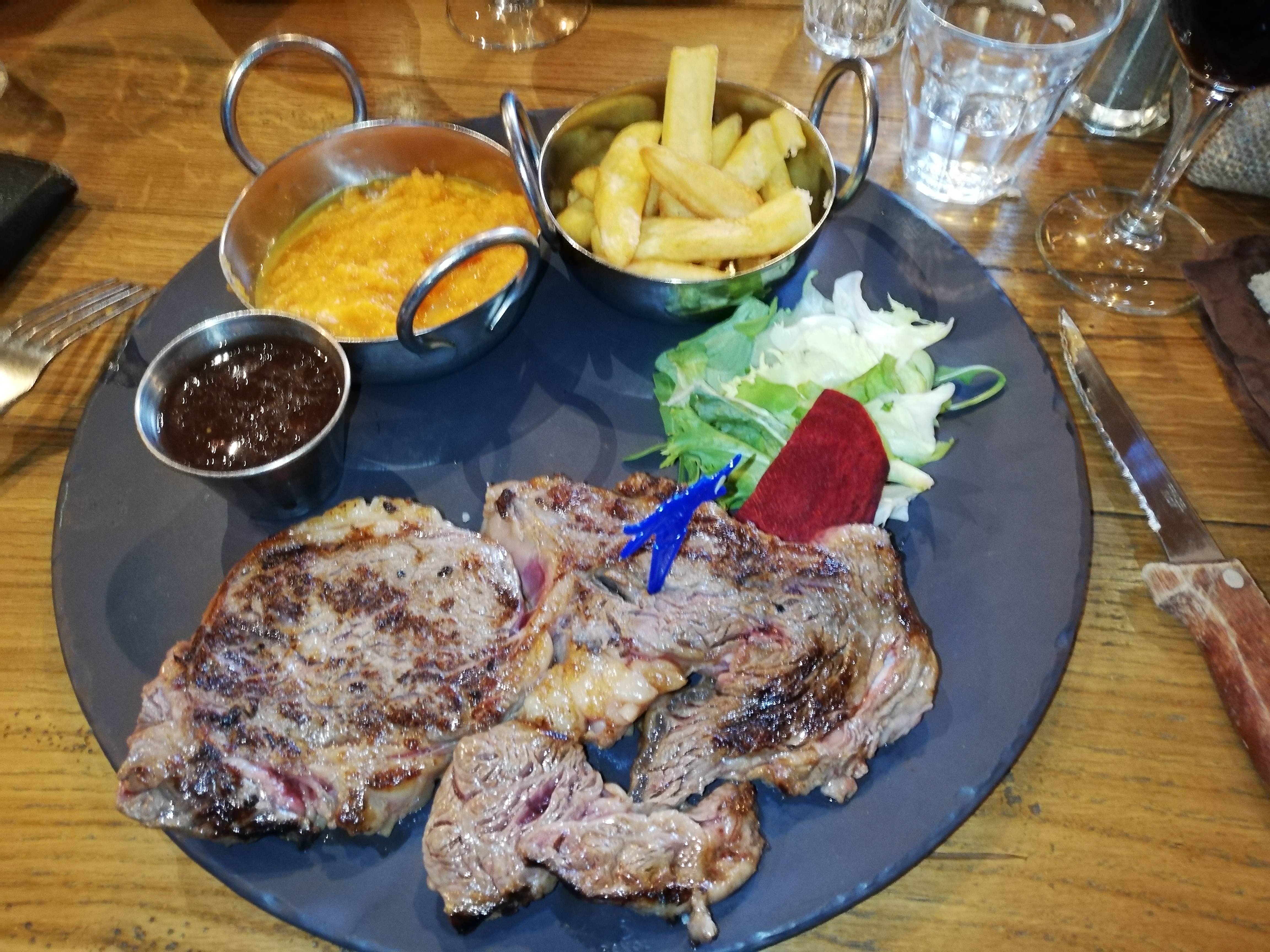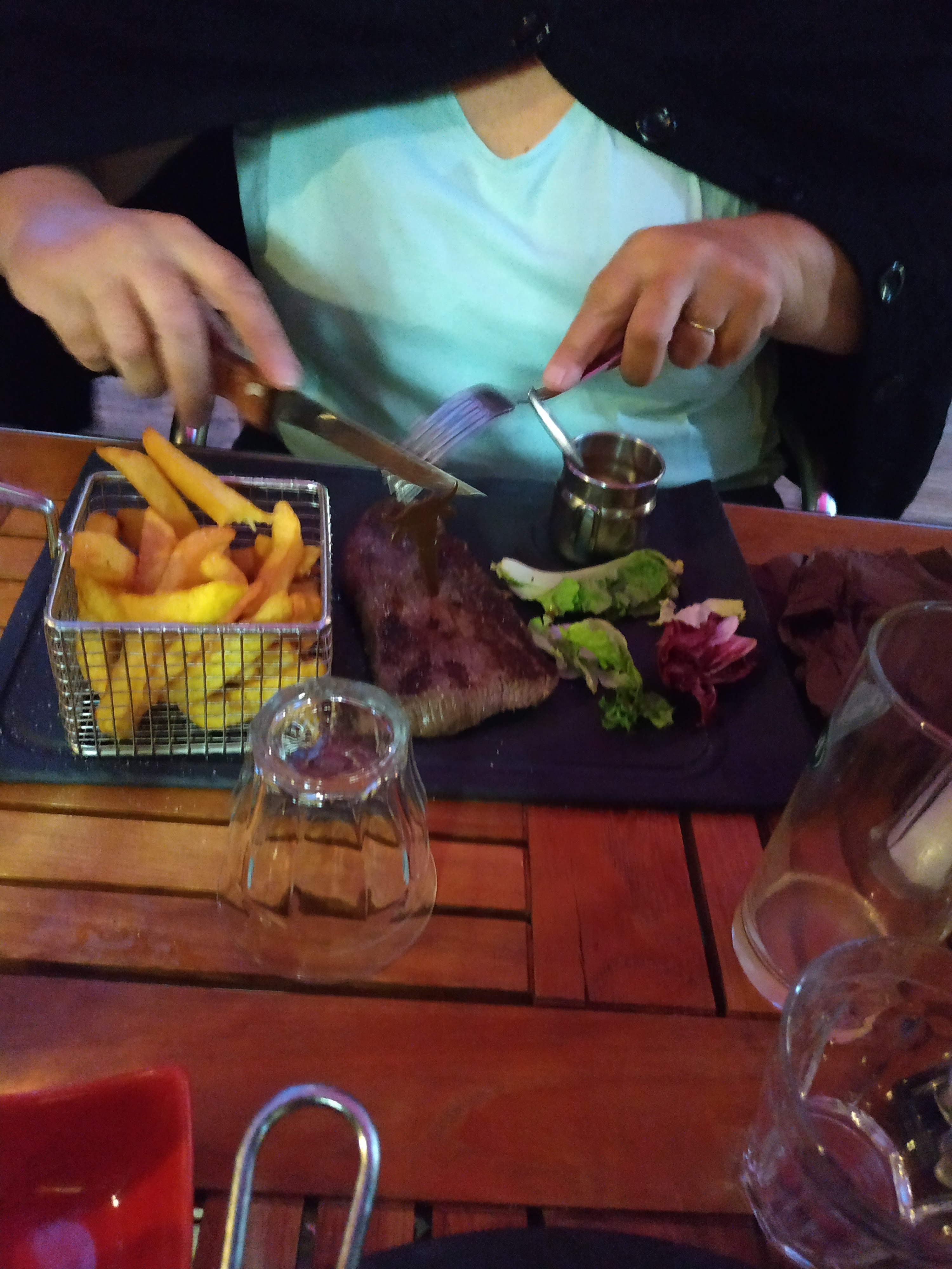 Je conseille vivement ce restaurant !! Service rapide, l'ambiance est chaleureuse, serveurs/euses au top ! Désolé j'avais trop hâte de manger pour prendre une photo avant (visuel qui donne vraiment envie vous voyez) 🤣 mais j'ai eu le droit a un très bon pavé de bœuf, frites, et les sauces un délice ! Merci encore de l'accueil nous reviendrons