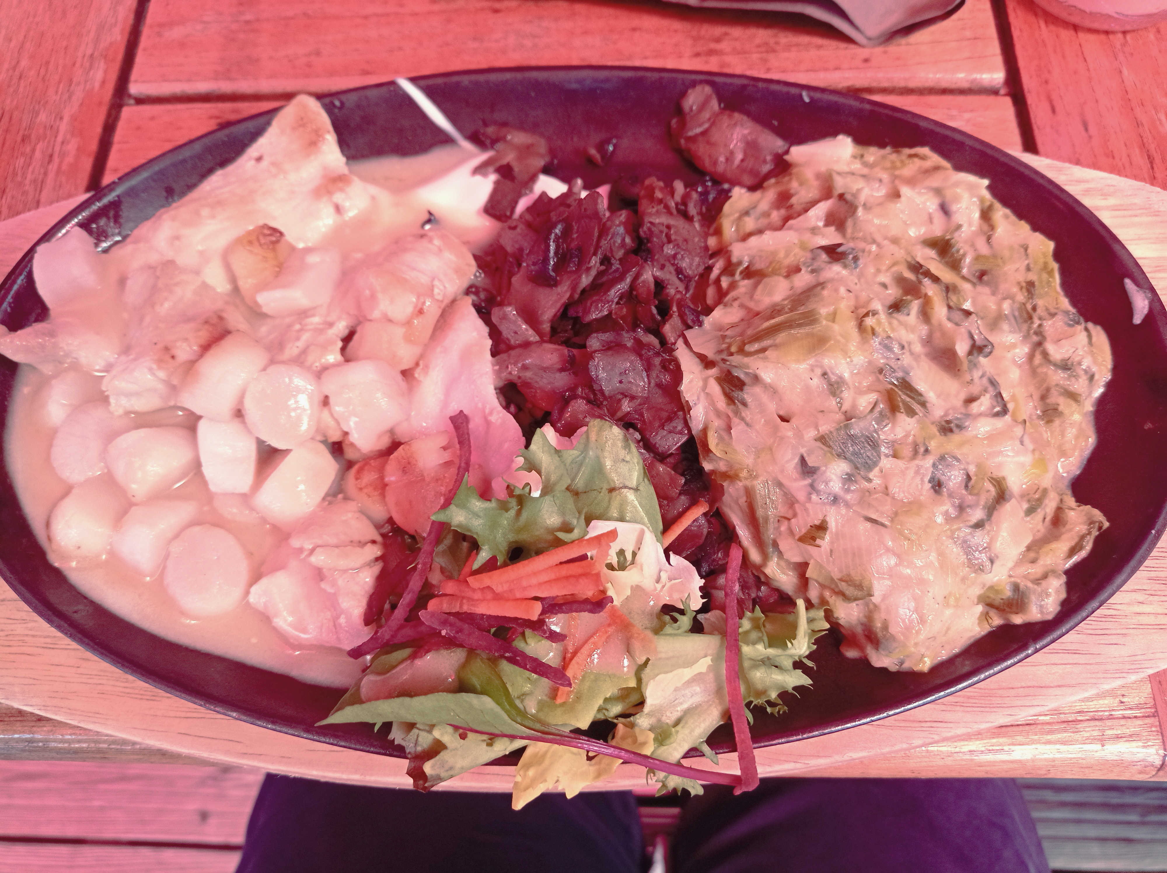 Très bon restaurant aux notes typiques de la région... En tout cas du point de vue d'un touristes comme moi même ! Accueil chaleureux et rapide dans un décor boisé. Il y a un certain souci du détail autant dans les tenues vestimentaires des serveurs et serveuses que dans les assiettes (glaces ou salade servies dans des petites portions de tonneaux en bois. Pain dans un sac de courses...). C'est bon et varié. La carte explore un nombre important de plat. Il est juste dommage que quelques aspects sont négligé (pain servis à table caoutchouteux et sans saveur par exemple ce qui dissuade de prendre une assiette de fromage qui avait l'air pourtant excellente, un peu trop de beurre comme dans mes haricots verts qui étaient la pour apporter un peu de verdure et non de graisse... Sans quoi j'aurai pris tout simplement des frites). Quoiqu'il en soit, très bonne expérience que je renouvelle à chaque visite sans la région.
